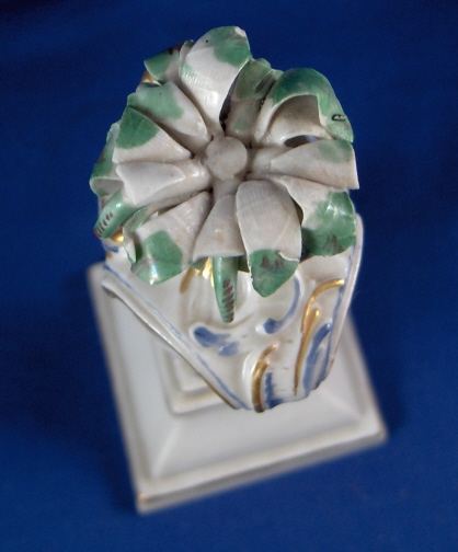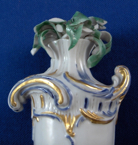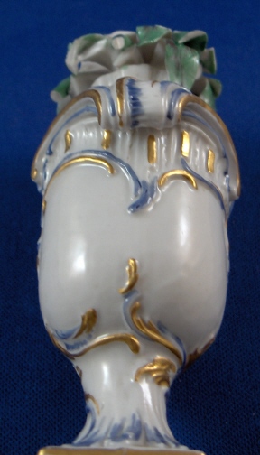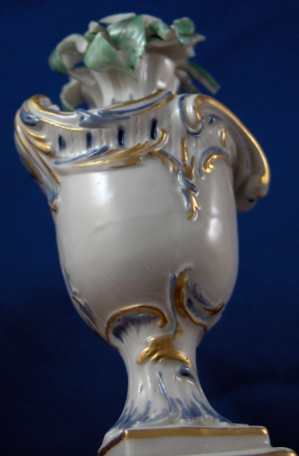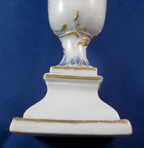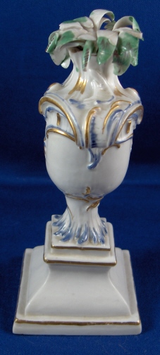This is a neat little urn on a pedestal with greenery in it made in Neudeck before they moved to Nymphenburg around 1755. I have not seen a painted version of this but the white version is shown in the Nymphenburg book by Alfred Ziffer. The piece is nicely painted in a nice blue with gold highlights and the leaves are painted in green. It is a very well modeled piece and quite elegant when on display. Add the age to that and this is one rare and superb piece! The base and urn are in great condition with just one teeny chip to a corner. The greenery has chips and I believe there was another layer on top of this one once upon a time to there probably was a taller plant in it. The piece is marked with the impressed shield mark underneath but you can just see the outline and even that is not complete. Certainly a very early piece and probably RS3. There are some number written underneath - not sure if they are original or from a collector later on. The entire piece is 4.75 inches tall, 2 inches wide and 2 inches deep. Please email me for more information or other pictures.