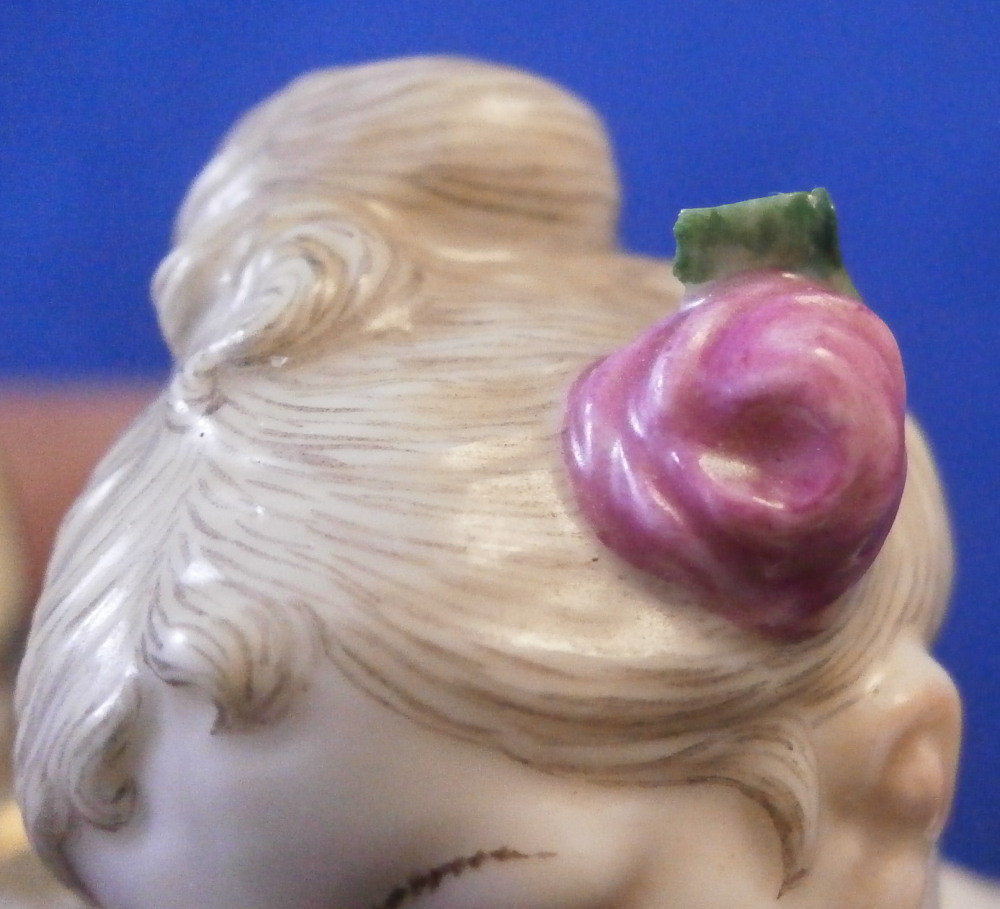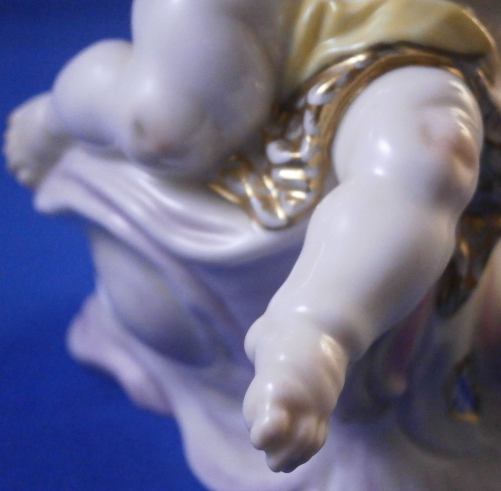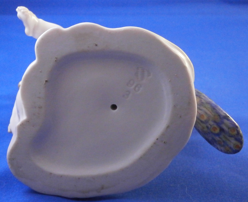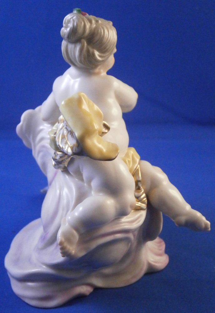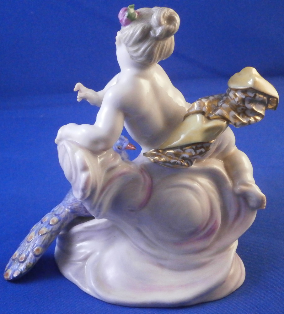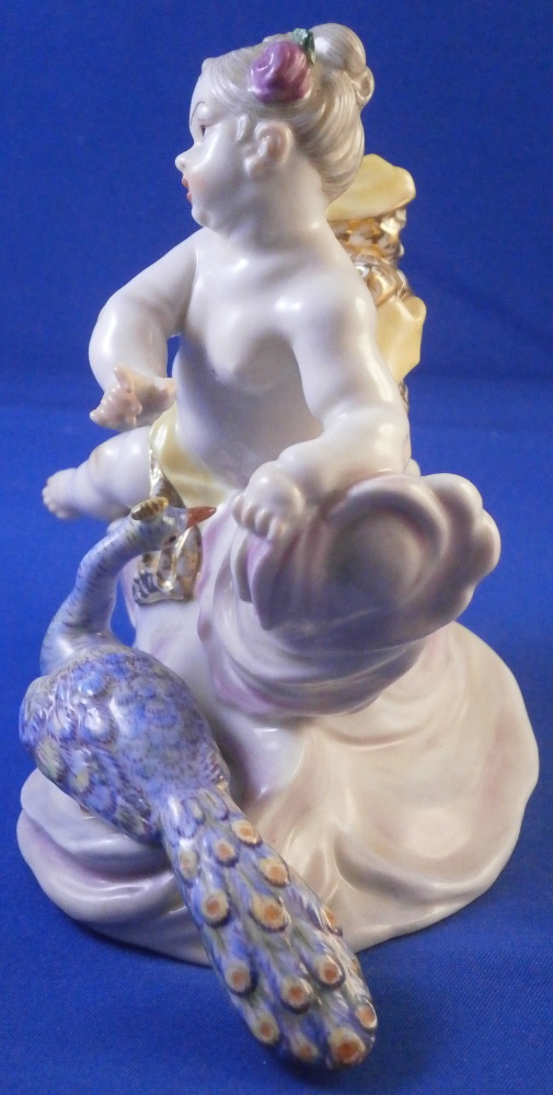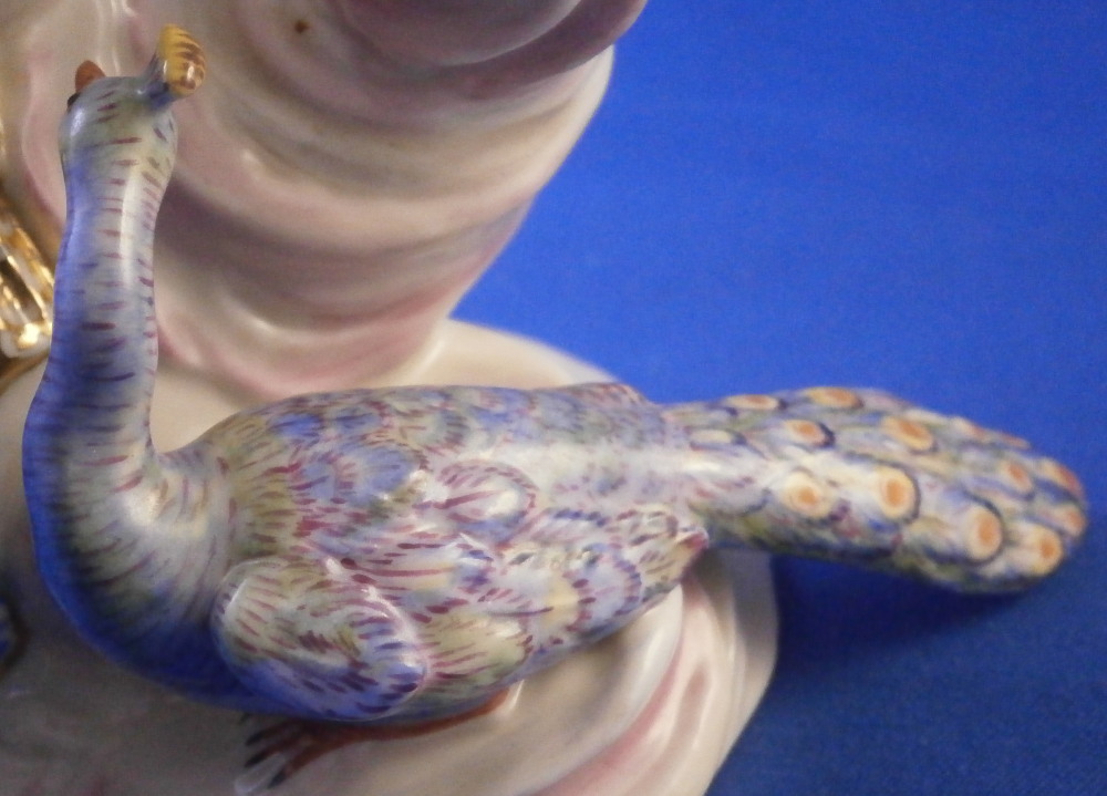 This is a rare polychrome figurine of the goddess juno with her peacock by her side made by Nymphenburg in the early 20th century. Nicely modeled with the putto sitting on a cloud with a cloth wrapped around her middle and flowing out the side. Amazing how Bustelli caught the movement so well in his figures! The cloth is strategically covering her mid section and she has a flower in her hair. The peacock is superbly painted as well! It is quite hard to find these painted versions nowadays! The figure is 4.25 inches tall, 4.25 inches wide and 3.375 inches deep. The figure is marked with the painted shield to the front of the base and the impressed shield mark on the underside as well as the impressed model number 96 over 3. The figurine is in great condition with the leaf of the flower in her hair chipped. Please email me for more information or other pictures.