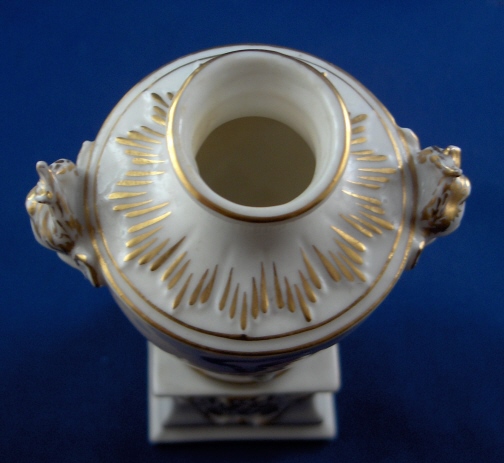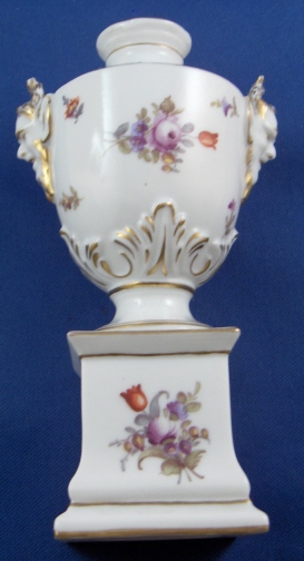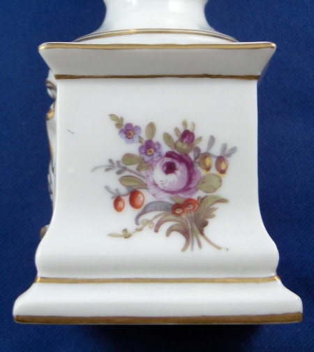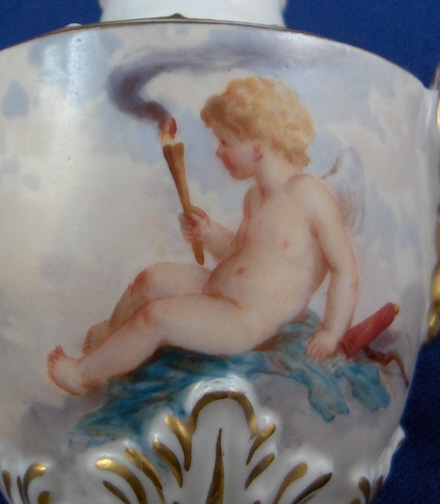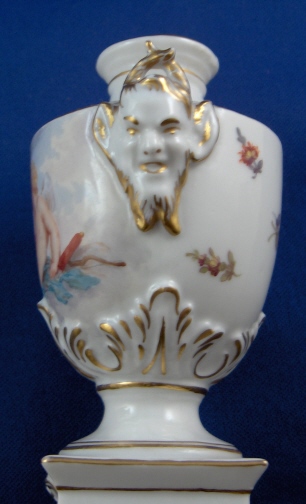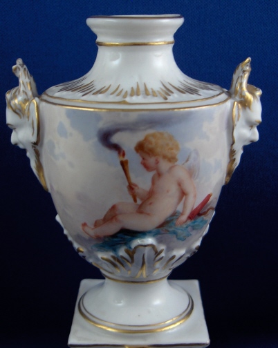 This is a vase or urn on a pedestal made by Nymphenburg around 1900. It has the Bavarian shield in relief in the front of the pedestal and flowers on the other three sides. The urn has devil heads as the handles on the sides and some nice relief decoration but the best part is that is has a handpainted scene on the front of a cherub on a cloud holding a lit torch with a bow and quiver full of arrows behind him. Some flowers on the other side of the vase. This type of decoration is very rare on these little pieces and all of them were special order pieces! The vase is in perfect condition and is marked underneath with the impressed shield mark though it is very faint and hard to see and there is also part of an impressed number. The vase is 5.25 inches tall, 2.75 inches wide and 2 inches deep. Please email me for more information or other pictures.