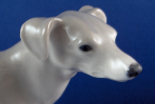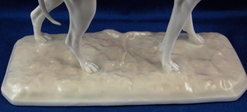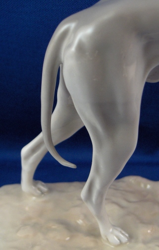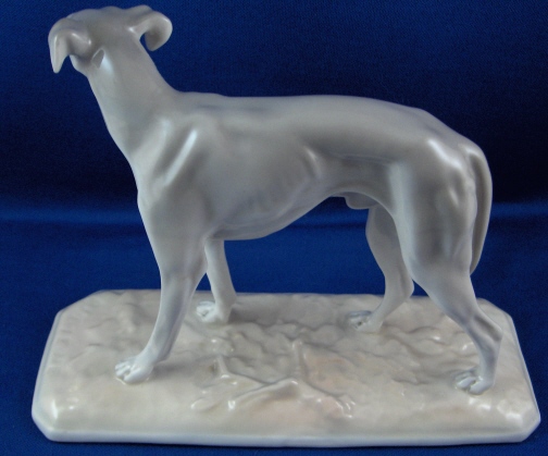 This is a rare figurine of a whippet or greyhound made by Nymphenburg in the late 19th century (1898). While we have all seen this figurine 1000 times in white I will bet you this is the first time you have seen it painted! I certainly have never seen this version before in all these years! The dog is grey with the face having more detail and the base a slight green. Plus it is a very early version fo this model having the model number still incised. This piece was first designed in the mid 19th century by P.J. (Pierre Jules) Mene whose name is also on top of the front base. A very well modeled and painted animal figurine! The dog is 4.25 inches tall, 2.375 inches wide and 6 inches long. It is marked with the impressed shield mark underneath with the model number 128 incised. The figure is in perfect condition. Please email me for more information or other pictures.