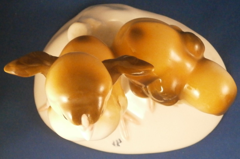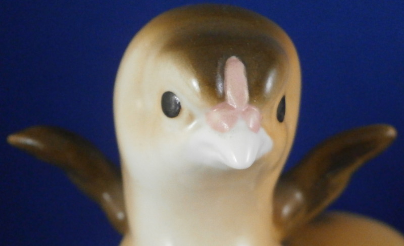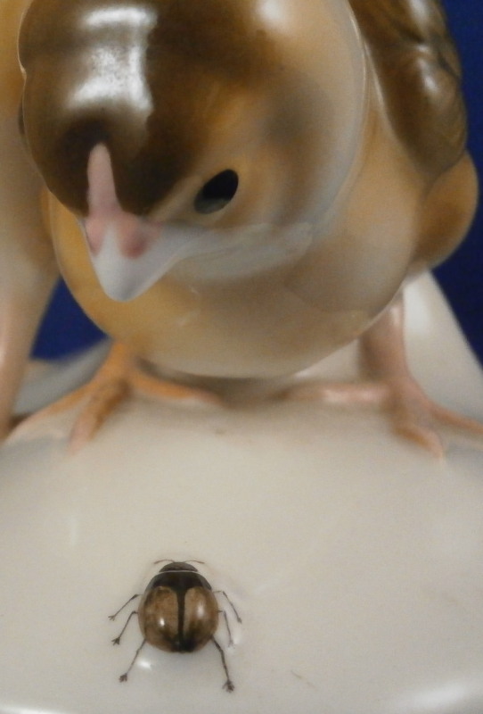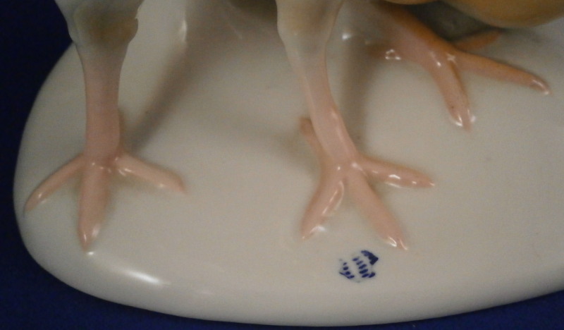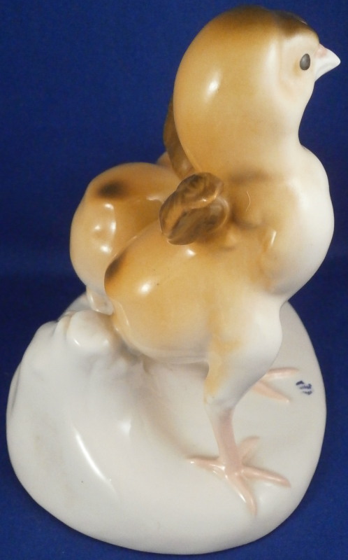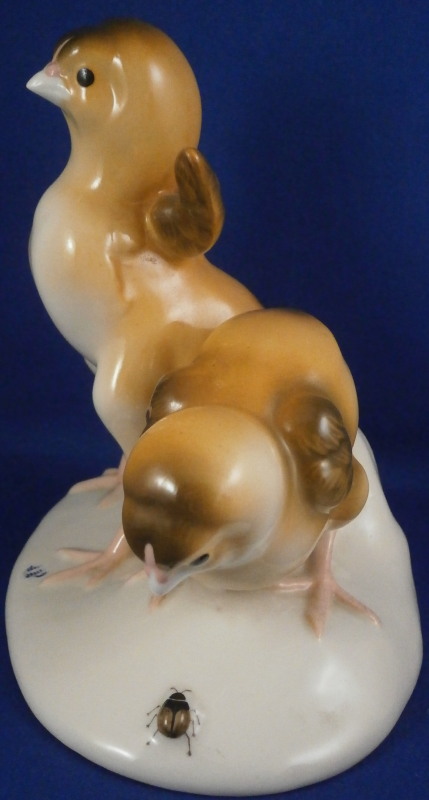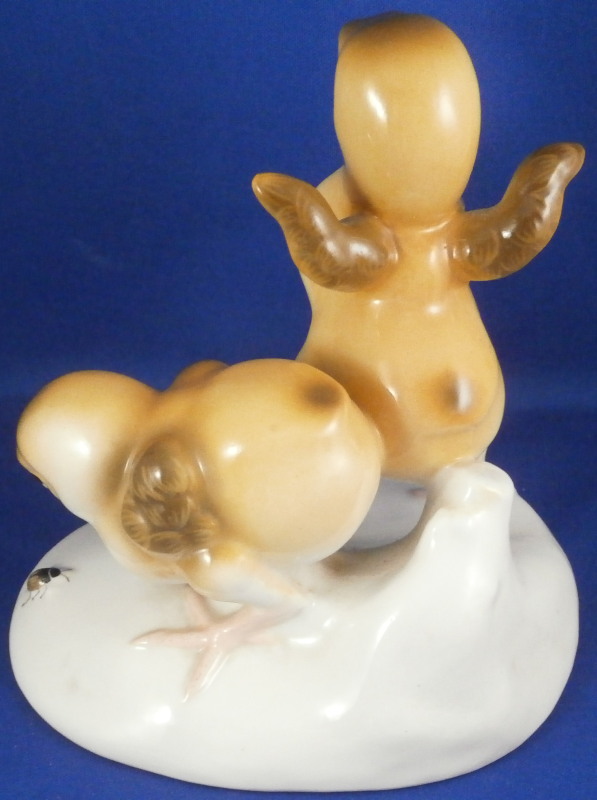This is a hard to find figure of two baby chicken on a base made by Nymphenburg in the mid 20th century. One chick is pecking at a beatle / bug on the side of the base while the other is stretching its wings. The base is simple with a tree trunk in the back and the impressed shield mark to the front which was colored in blue. Nicely modeled and hand painted perfectly. The figurine is 5.5 inches tall, 5.375 inches wide and 4 inches deep. The piece is marked with the impressed shield mark underneath as well as the number 353 over 8 (I think as they are a bit tough to read). It also has the green shield mark under a crown with Nymphenburg under it. The piece is in perfect condition. Please email me for more information or other pictures.