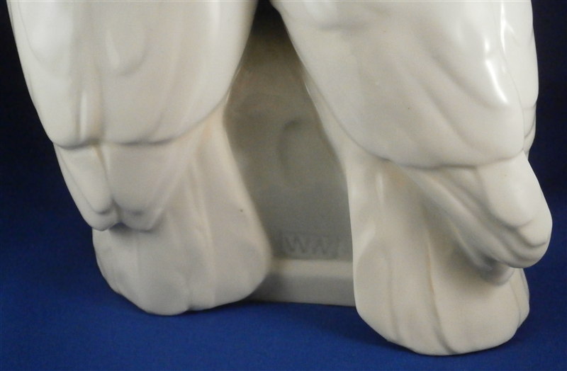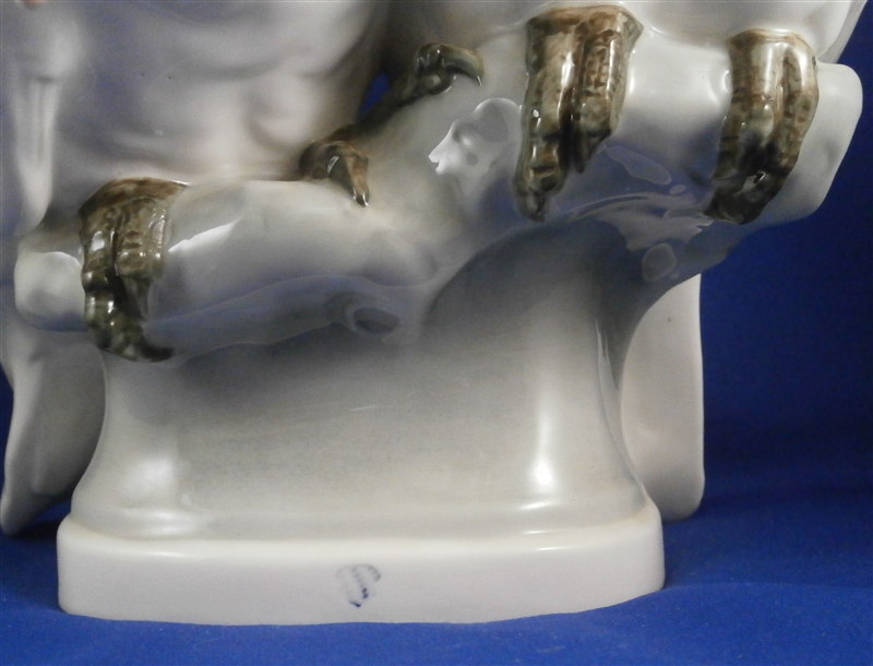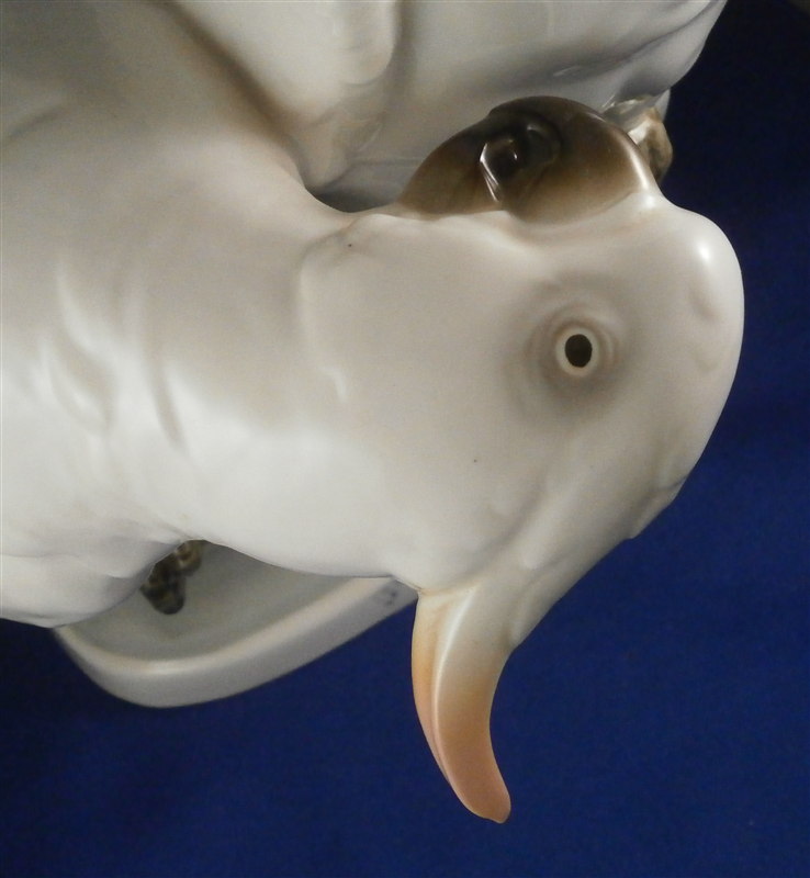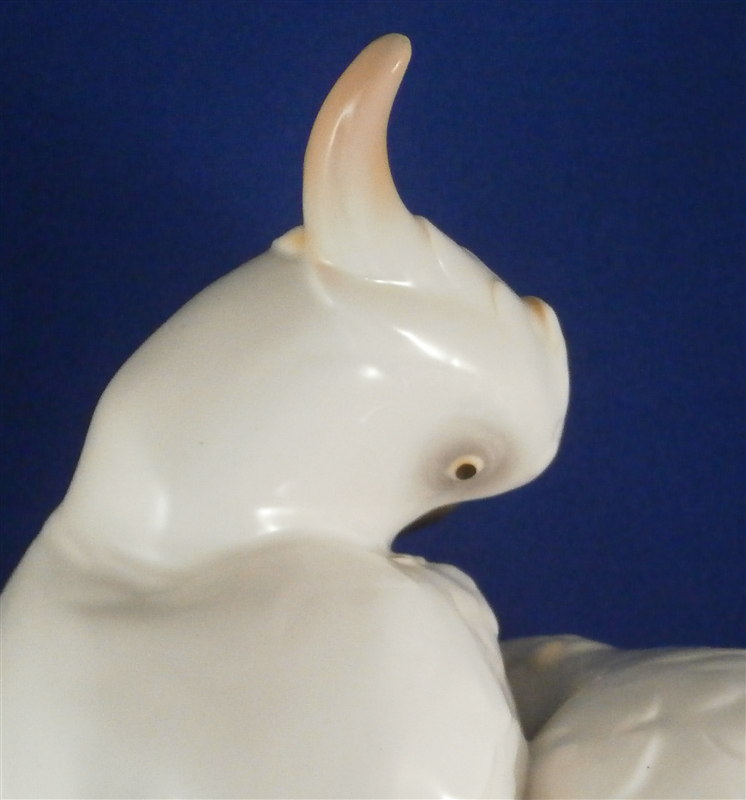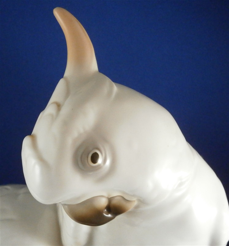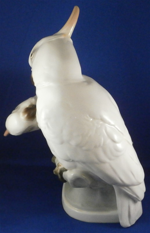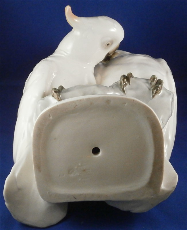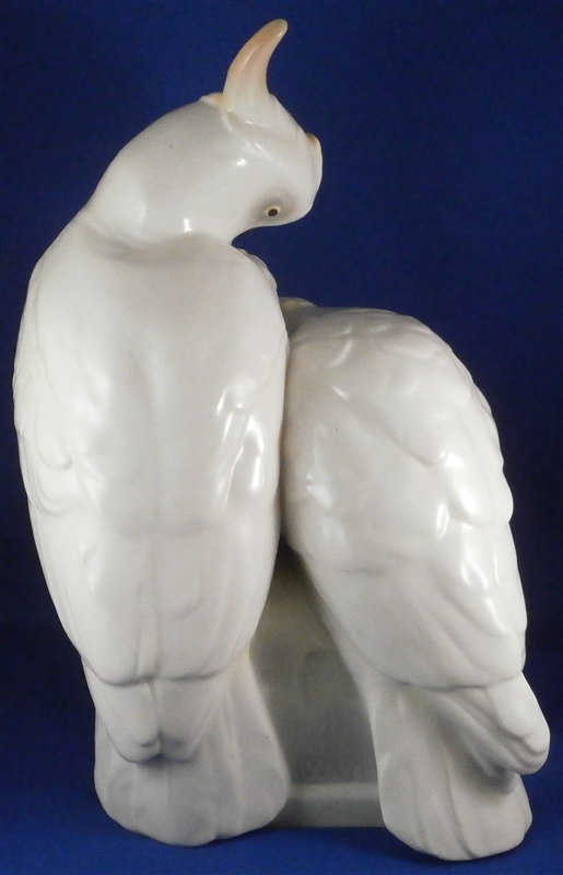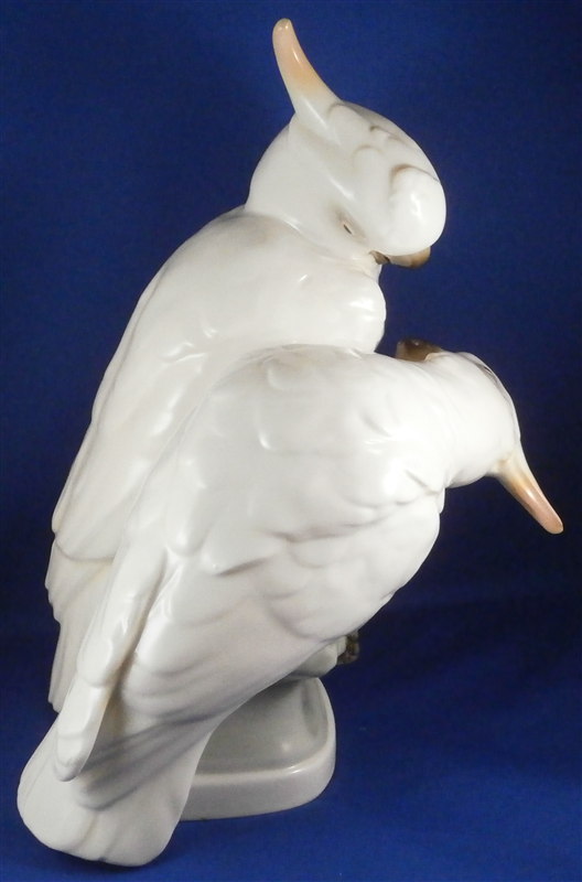 This is a figurine of a pair of cockatoo birds made by Nymphenburg during the early 20th century. The parrot group was deisgned by Wilhelm Neuhäuser in 1910 and his initials are impressed in the back of the base between their tails. The piece is superbly modeled and painted in underglaze colors typical of the Art Nouveau period. The figure is about 11.75 inches tall, 7.75 inches wide and 8.75 inches deep so fairly large. The figure is marked with the impressed shield mark underneath as well as the incised numbers 499 (I think) and 2. There is another impressed sheild in the front of the base that has been colored blue. The piece is in perfect condition and quite heavy. Please email me for more information or other pictures.