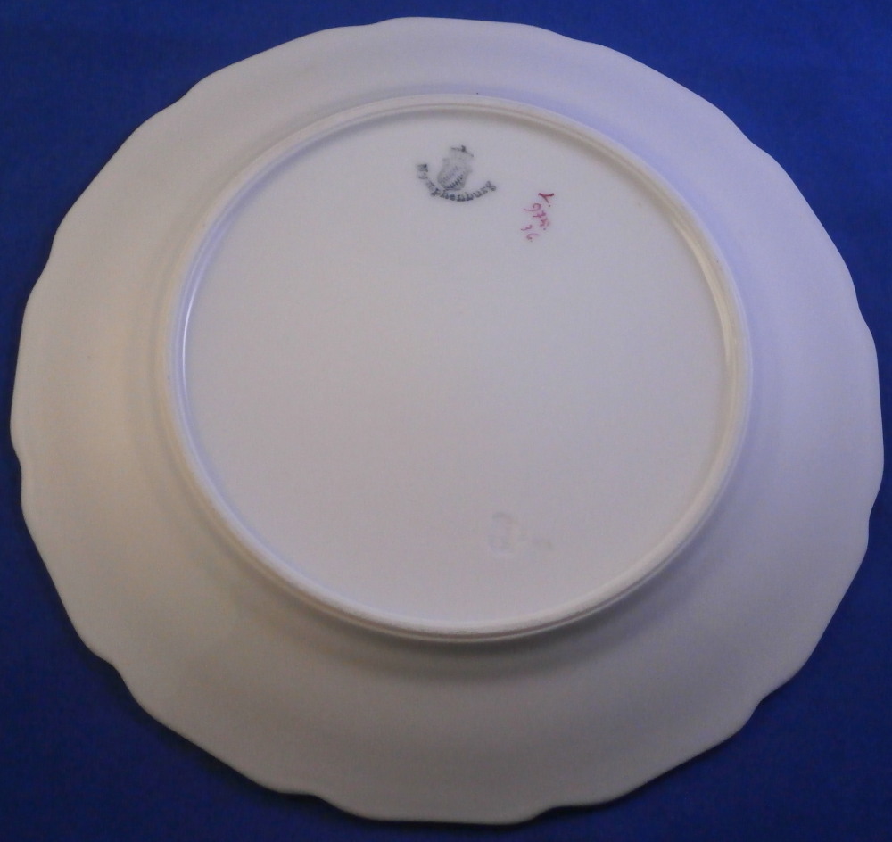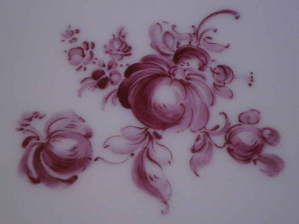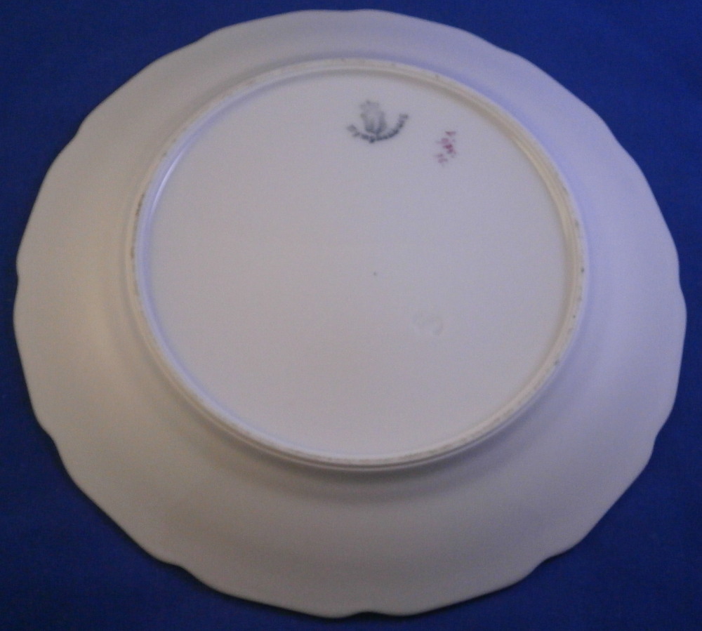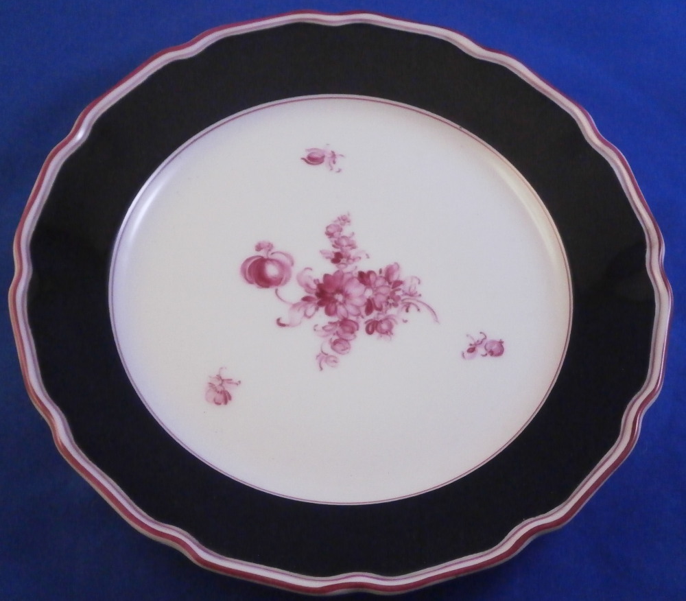 This is a pair of little side plate made by Nymphenburg in the 20th century. Each is hand painted with a puce floral arrangement in the center as well as three small single flowers but my favorite part is the black ground color to the rim with the puce trim to the edge and around the well. It looks stunning! This color combination is one of my favorite that just doesn't get old. They are both in great condition. Both are marked with the green shield under the crown with Nymphenburg under it, the impressed shield mark as well as some puce letters and numbers as shown. Each plate is 0.875 inches tall and 6.75 inches in diameter. Please email me for more information or other pictures.