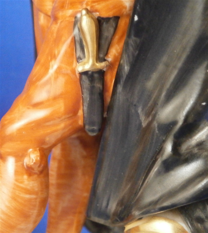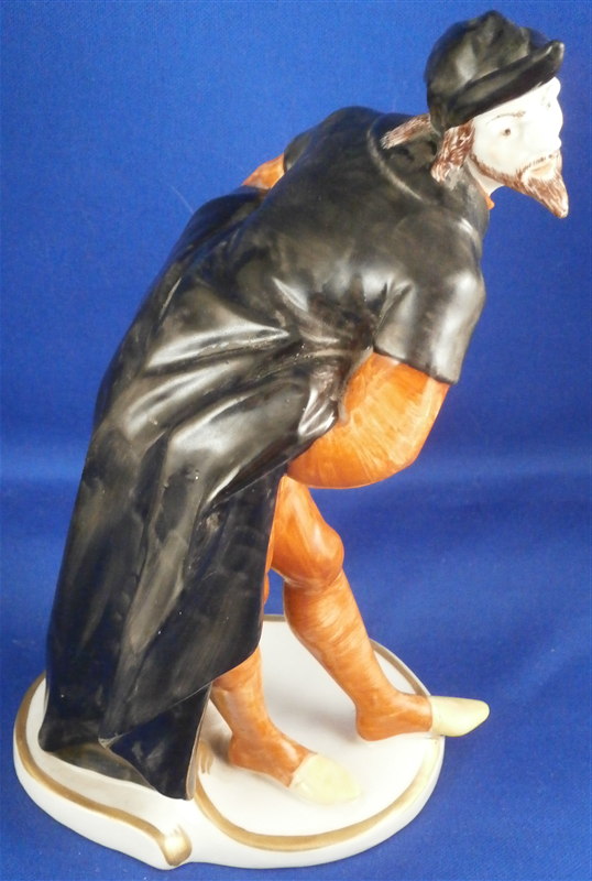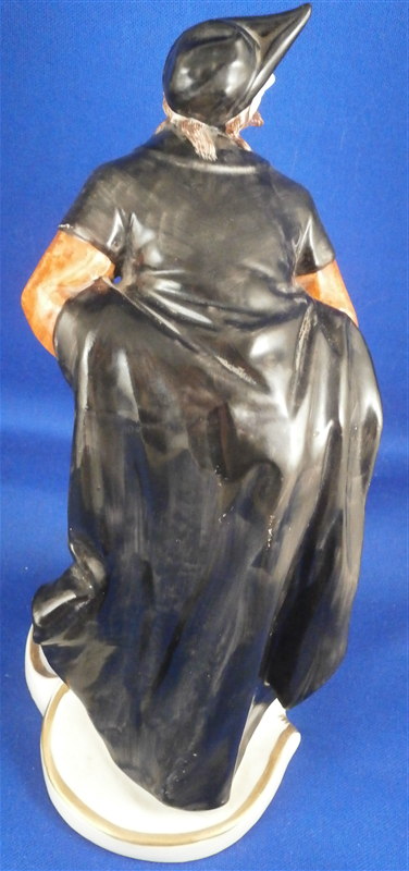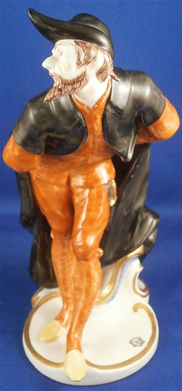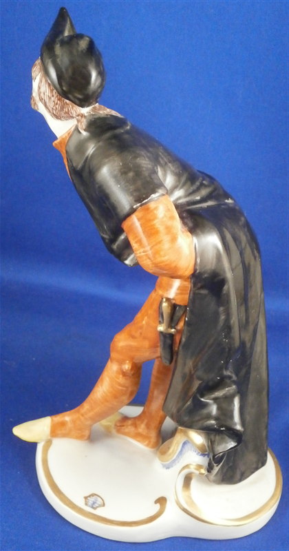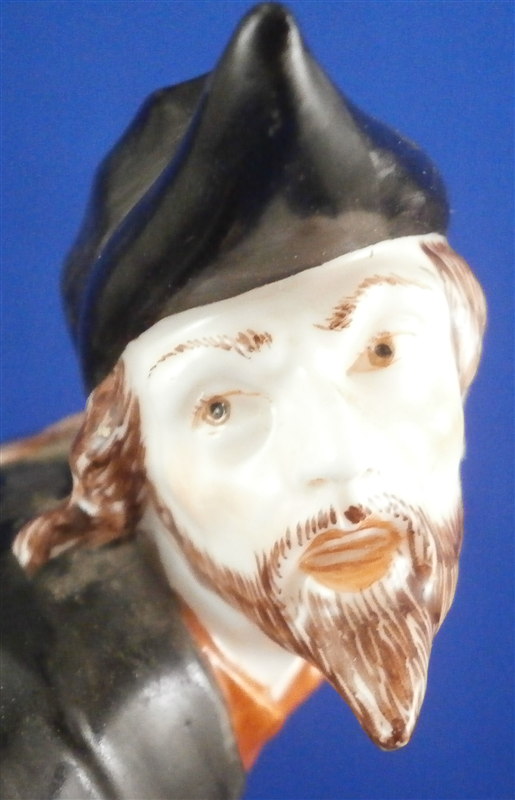 This is a superb figurine from the Commedia dell'arte aka the Italian Comedy made by Nymphenburg in the early 20th century. This figure is of Pantalone ( Pantaloon ) and is one of the most important principal characters found in commedia dell'arte. With his exceptional greed and high in society he is the "money" in the commedia world. His full name, including family name, is Pantalon de' Bisognosi , Italian for 'Pantalone of the Needy'. The figurine is superbly modeled and hand painted perfectly. First designed by the best porcelain modeler of the 18th century - the famous Franz Anton Bustelli - it is just one elgant and fun piece to look at. The figure is 6.875 inches tall, 2.875 inches wide and 4.25 inches deep. The piece is marked with the impressed shield mark painted in blue and gold on top of the base as well as an impressed shield mark underneath and impressed numbers 57 over 0. The figurine is in perfect condition with a few tiny spots of wear to the black robe. He displays perfectly! Please email me for more information or other pictures.