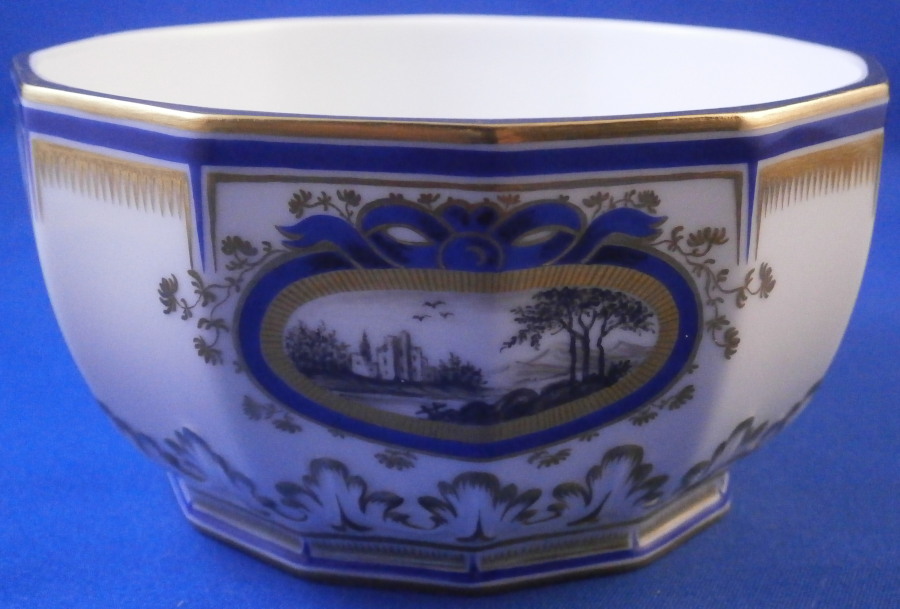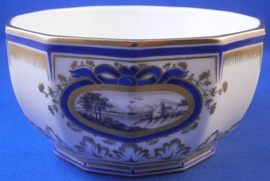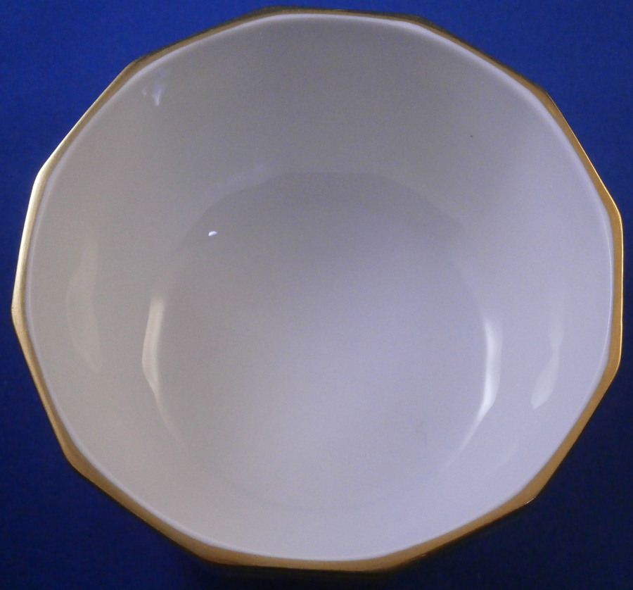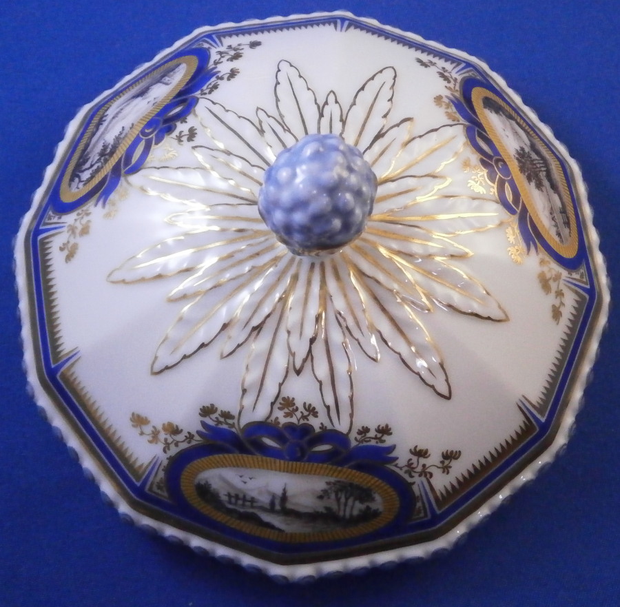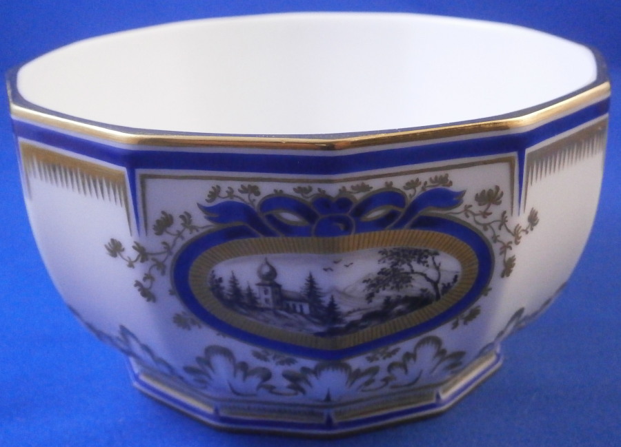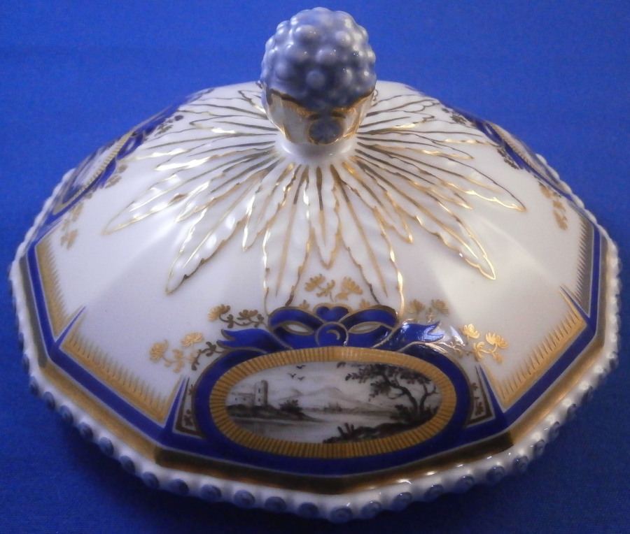 This is a hard to find lidded sugar bowl dish made by Nymphenburg in the later 20th century. It is from the King's / Pearl service made for the electoral court around 1792-1795 designed originally by Dominikus Auliczek . The original set is still in the possession of the family and thus any pieces of this design are later versions. The pot is 12 sided and both the lid and main body are decorated with some fancy raised design to the paste highlighted with gilding, three hand painted black scenes as well as a superb gold and blue trim. Nice finial shape and off course the blue "pearls" along the edge of the lid which gives the service it's name. This is truly a very stunning and popular design and these main pieces are quite hard to find! The sugar dish is 4.25 inches tall and 4.375 inches in diameter. The piece is marked with their green shield mark under a crown with the name Porzellan Manufaktur Nymphenburg around it and the letter F plus some gold numbers and the usual impressed shield mark with an impressed letter and number next to it as shown. The bowl and lid are in perfect condition. Please email me for more information or other pictures.