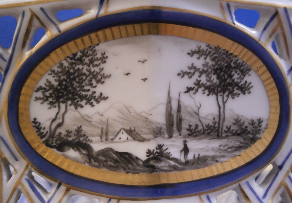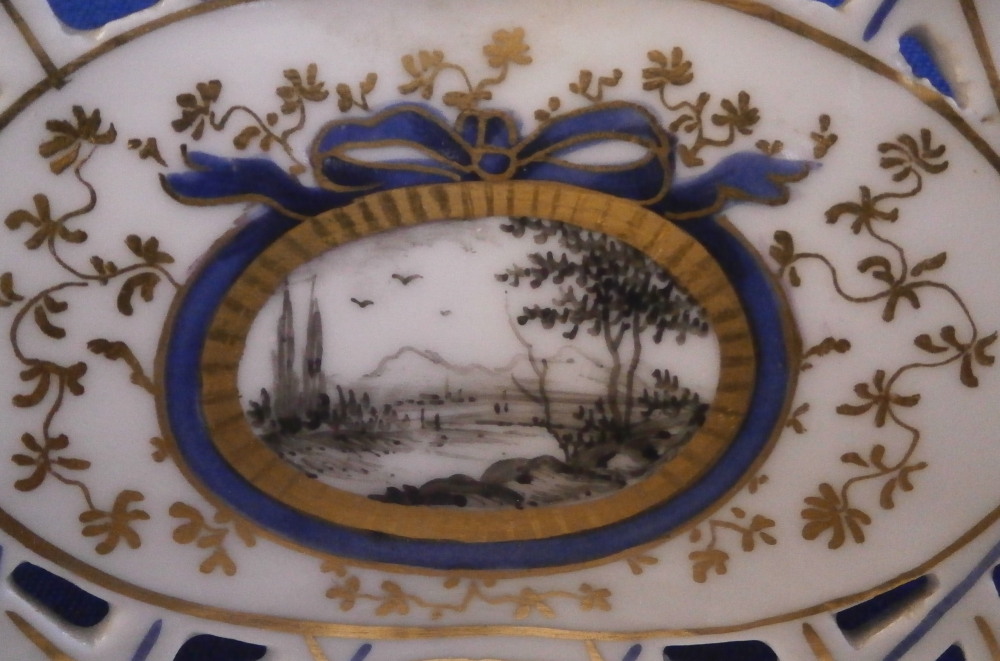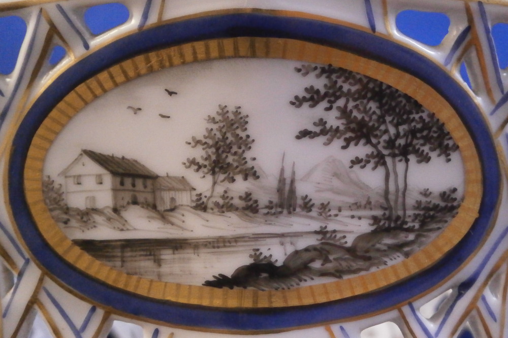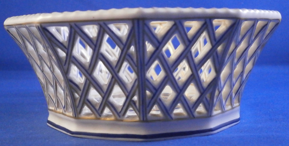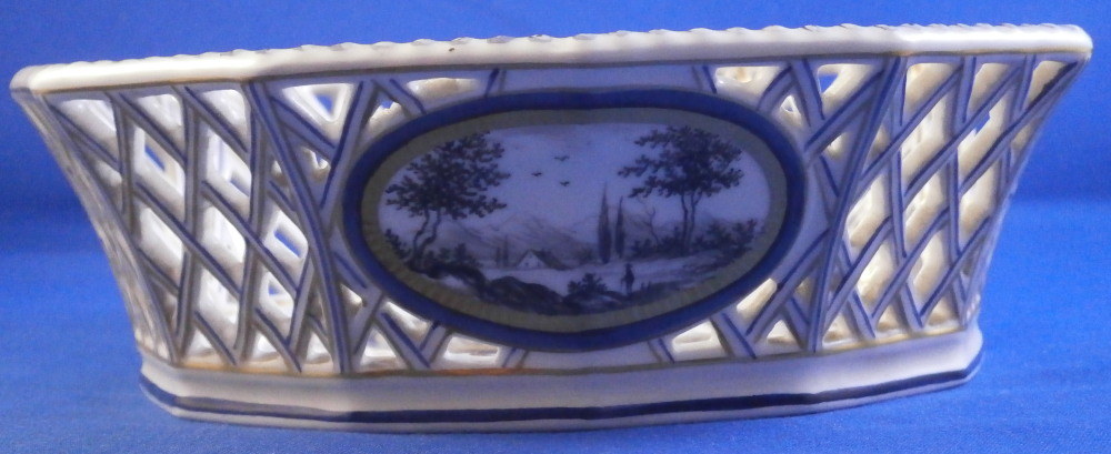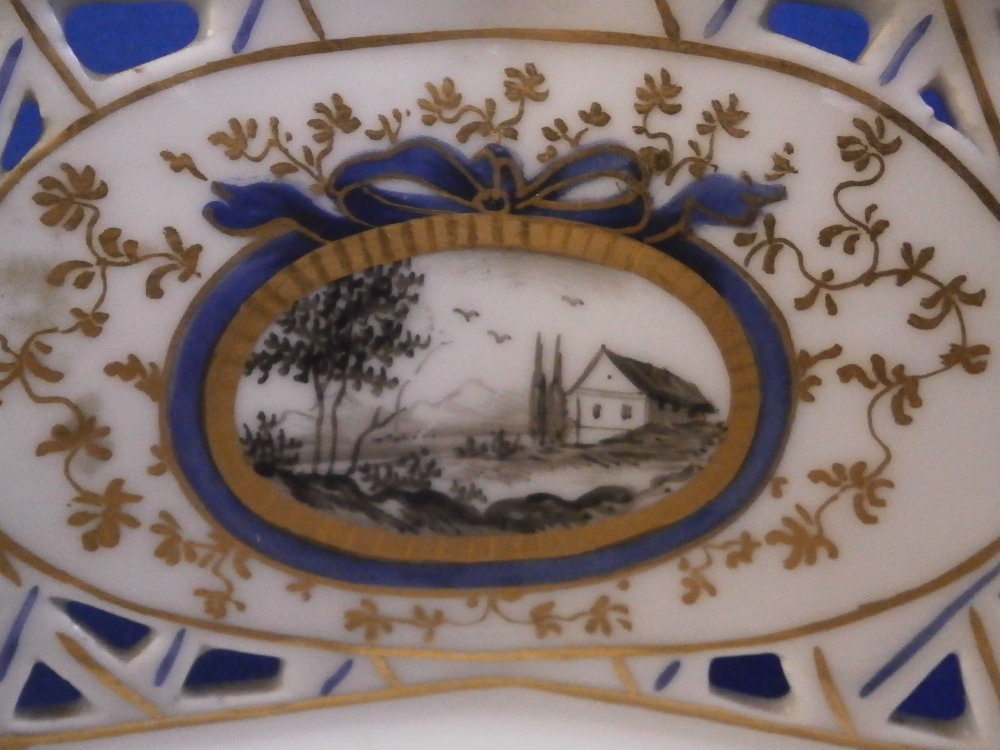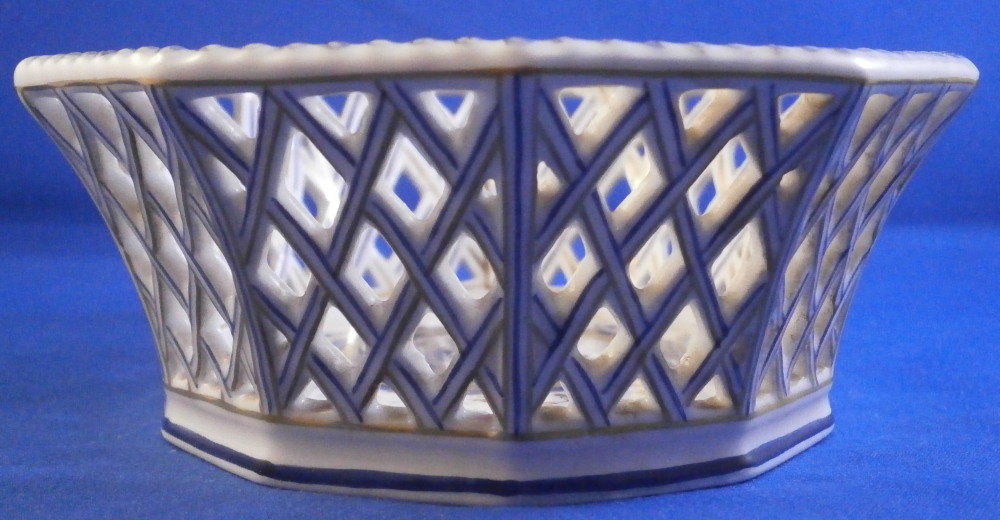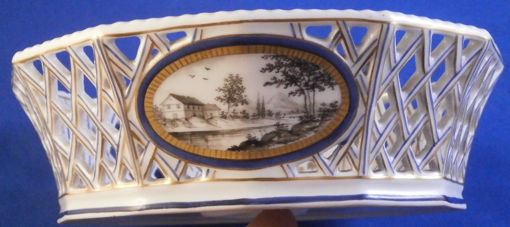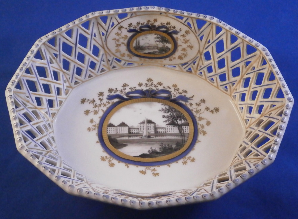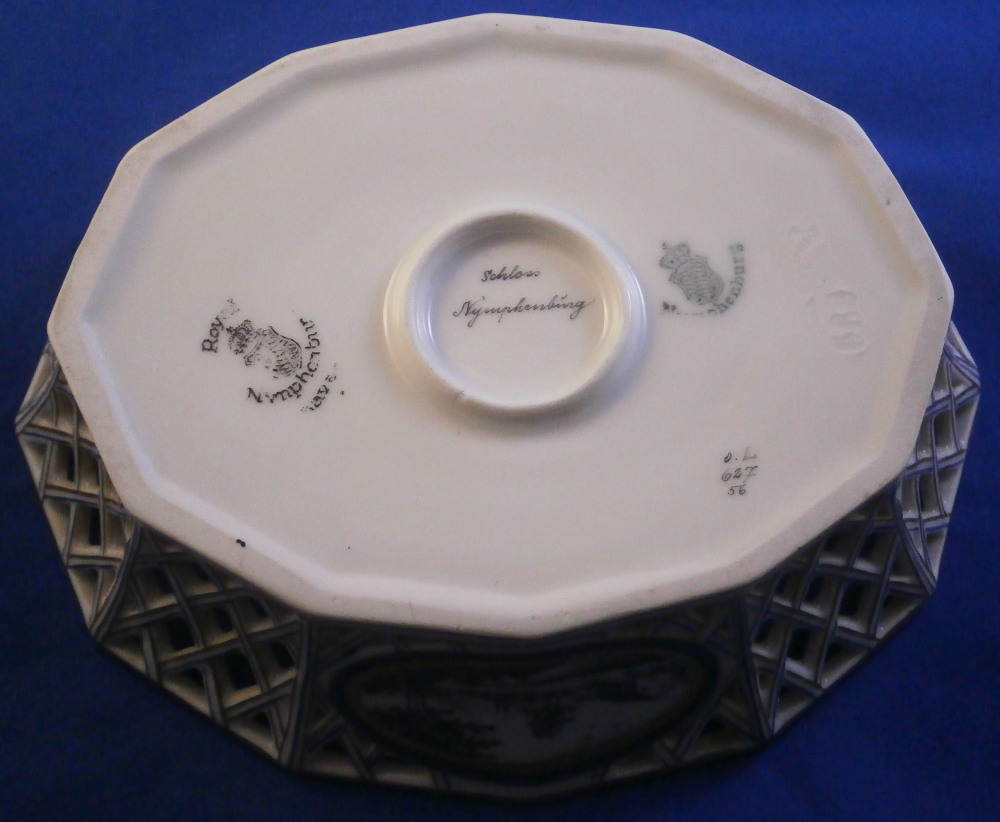 This is a superb reticulated oval basket made by Nymphenburg in the early 20th century. It is one from the King's or Pearl service made for the electoral court around 1792-1795 designed originally by Dominikus Auliczek. The original set is still in the possession of the family and thus any pieces of this design are later copies. It is not often you see one of these baskets as they are very intricate and fragile. The piece is hand painted with five scenes of different views on it. Three to the inside including the most desirable center scene of Schloss Nymphenburg and two more scenes to the outside. The sides are reticulated and are highlighted with gold and blue lines, the blue 'pearls' on the top edge are a nice touch as well and the reason for their name Pearl Service aka King's Service. The basket is 12 sided and the black scenes are surrounded by a superb gold and blue trim. The piece is 1.875 inches tall, 6.375 inches wide and 5.125 inches deep. It is marked with the under glaze shield mark with the word Nymphenburg underneath, an impressed shield mark as well as the usual impressed and black numbers as shown. The title of the scene is written in German in black - Schloss Nymphenburg which means castle Nymphenburg. Also an above glaze black shield mark under a crown with Royal above and Nymphenburg below plus Bavaria below that. Meant for export. Not a mark one sees very often. The basket is in perfect condition! A couple of dirt marks I noticed after taking the pictures but I cleaned them off. Please email me for more information or other pictures.