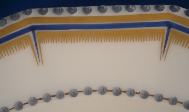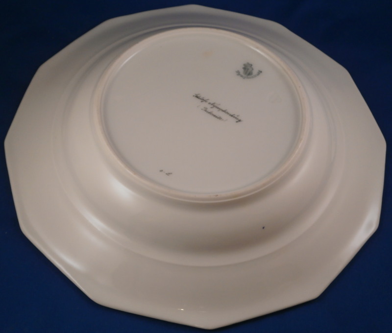 This is a hard to find soup plate made by Nymphenburg in the 20th century. It is from the King's or Pearl service made for the electoral court around 1792-1795 designed originally by Dominikus Auliczek. The original set is still in the possession of the family and thus any pieces of this design are later copies. The large plate is 12 sided and has the pearl design to the very edge (refers to the little blue pearls painted on). It is hand painted with a scene in black in the center this one probably being the perfect scene if you had to pick any one of them - Nymphenburg castle :) And to finish of a perfect design there is lots of gold and blue trim. The plate is 1.75 inches tall and 9.875 inches in diameter. It is marked with the underglaze printed shield mark with the word Nymphenburg underneath, the impressed shield mark, a black o.L which is probably a painter's mark and the title to the scene in the front - Schloss Nymphenburg (Parkseite) from the park side. The piece is in perfect condition. Please email me for more information or other pictures.