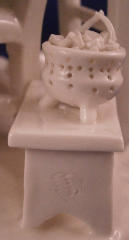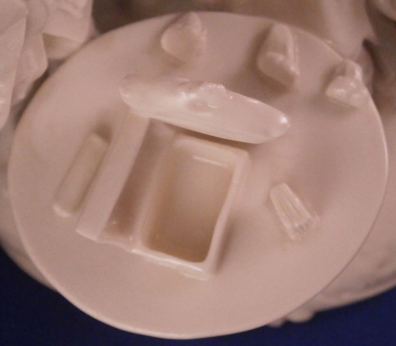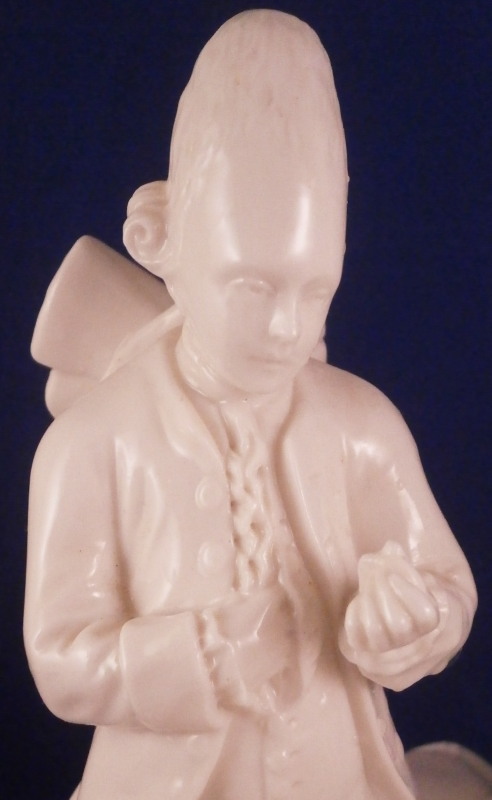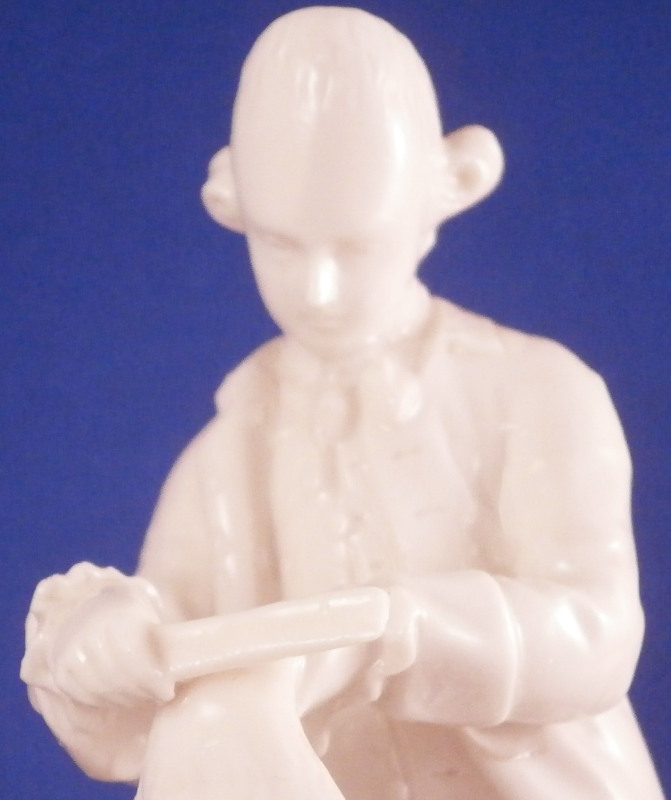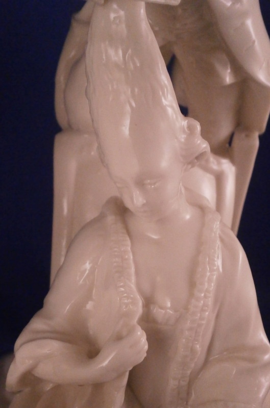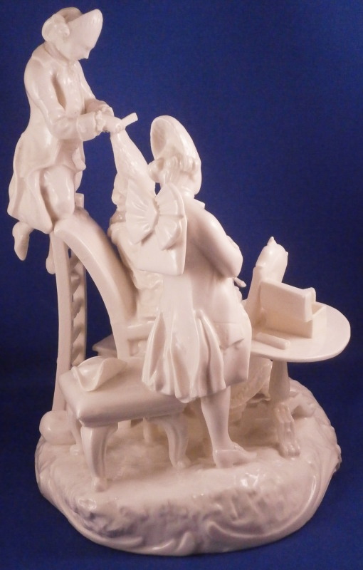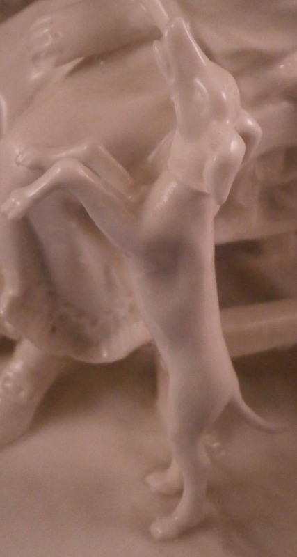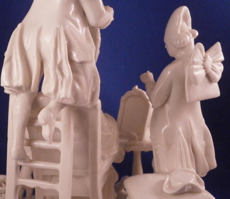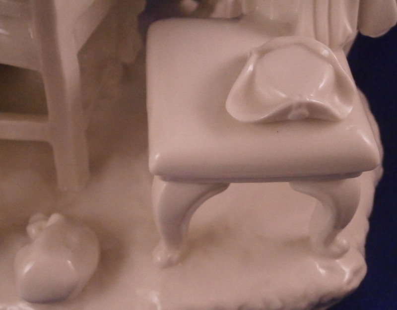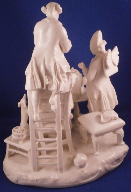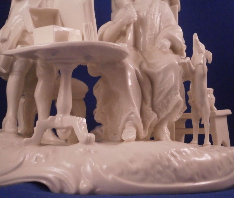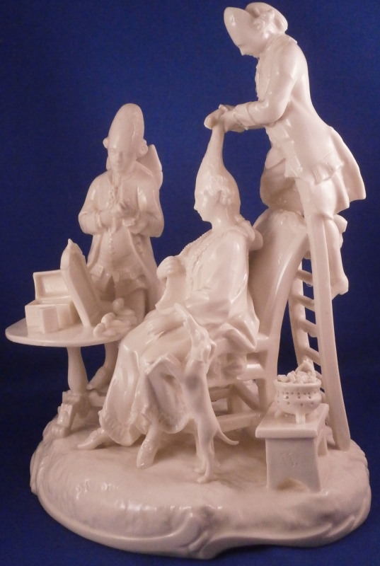 This is a superb figure of a hairdresser scene made by Nymphenburg in the late 19th century or early 20th century after a Frankenthal original. Likely meant to be a depiction of the royal court hair dresser doing the hair of some important lady while another servant stands near by. The lady is sitting in a chair with her dog by her side, a table in front of her includes a mirror on top and some other items, a small bench behind her with a pot of coals (it looks like) and the hair dresser is standing on a ladder to be able to do the tall pointy hairstyle of the lady. another table with a hat on it in the back with a little bag on the nicely modelled base. Really one of my favorite blanc de chine pieces they made. The figurine is 8.375 inches tall, 6.75 inches wide and 5.75 inches deep. Marked with the impressed shield mark and impressed numbers 3 as well as incised number 38/1 as shown. Another impressed shield mark to the side of the bench / foot stool and underneath the Frankenthal CT under a crown in green. An early version without the date code. The figurine is in perfect condition which is probably the first time I have seen that sicne with all that fine detail something is usually damaged but not on this piece here which is exciting. Please email me for more information or other pictures.