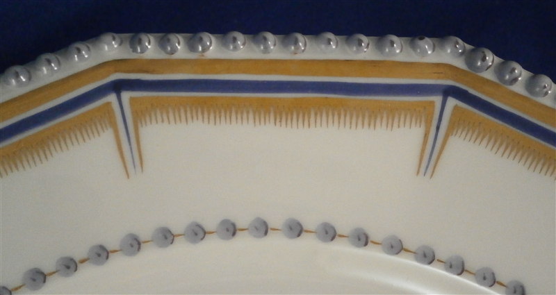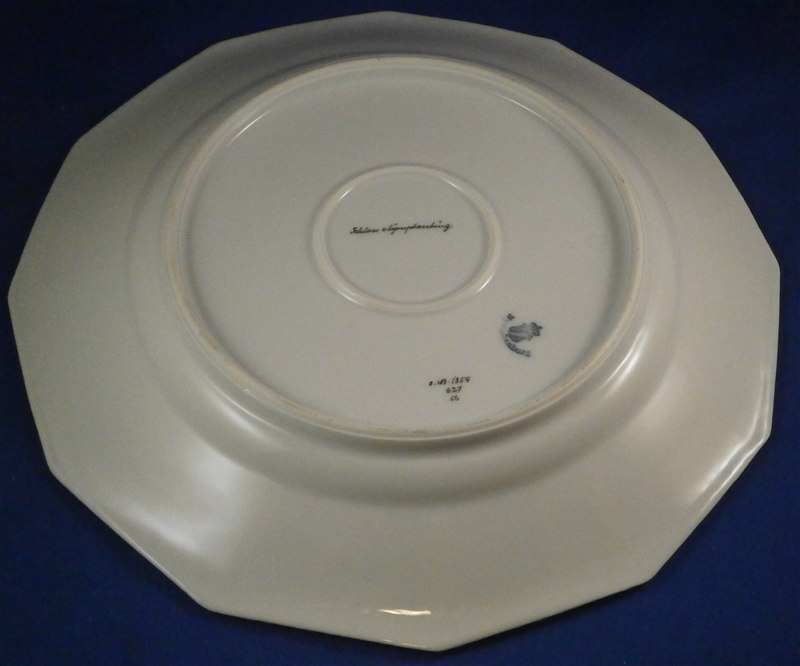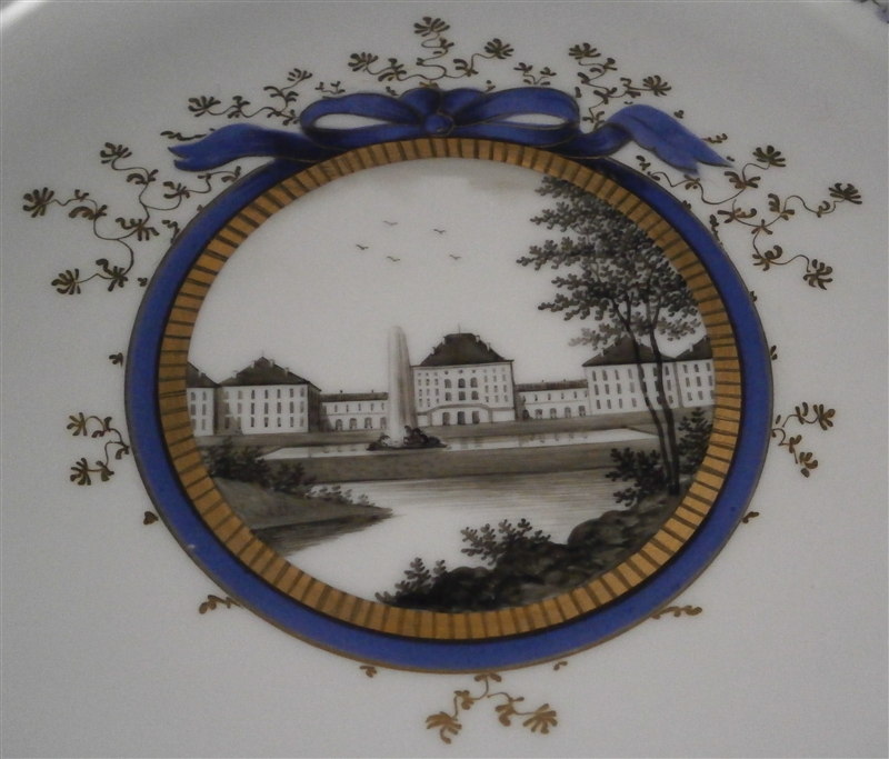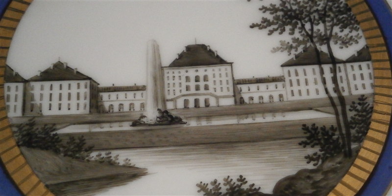 This is a hard to find dinner plate made by Nymphenburg in the 20th century. It is from the King's or Perl service made for the electoral court around 1792-1795 designed originally by Dominikus Auliczek. The original set is still in the possession of the family and thus any pieces of this design are later copies. The large plate is 12 sided and has the perl design to the very edge (refers to the little blue perls painted on). It is hand painted with a scene in black in the center this one probably being the perfect scene if you ahd to pick any one of them - Nymphenburg castle :) And to finish of a perfect design there is lots of gold and blue trim. The plate is 1.25 inches tall and 10.125 inches in diameter. It is marked with the underglaze printed shield mark with the word Nymphenburg underneath, the impressed shield mark, the usual numbers and the title to the scene in the front - Schloss Nymphenburg . The piece is in perfect condition. Please email me for more information or other pictures.