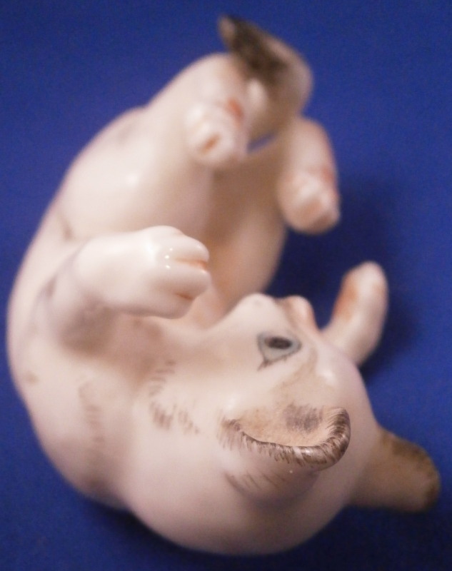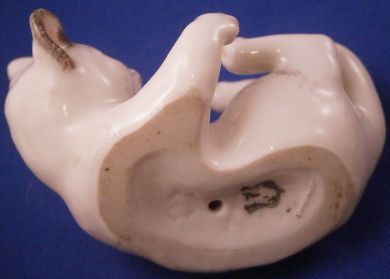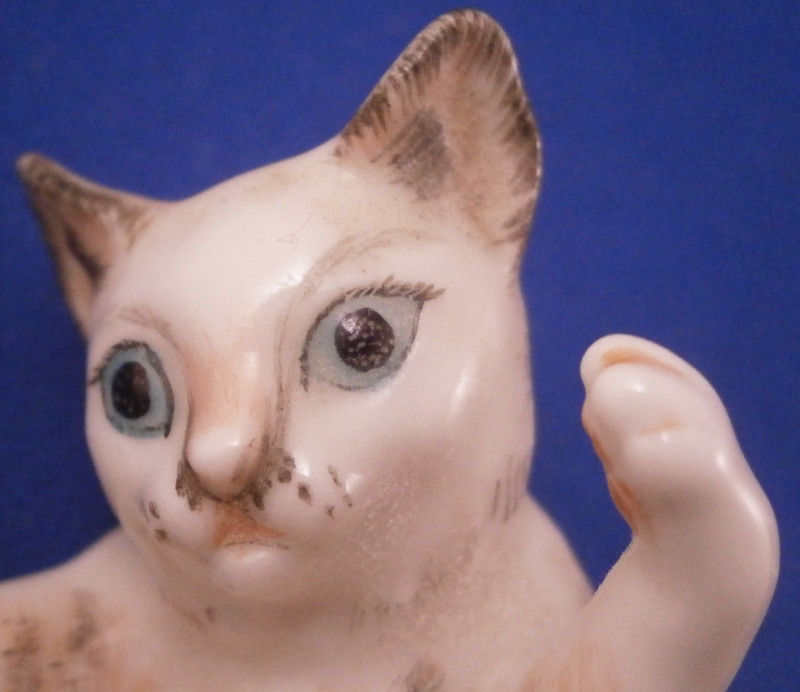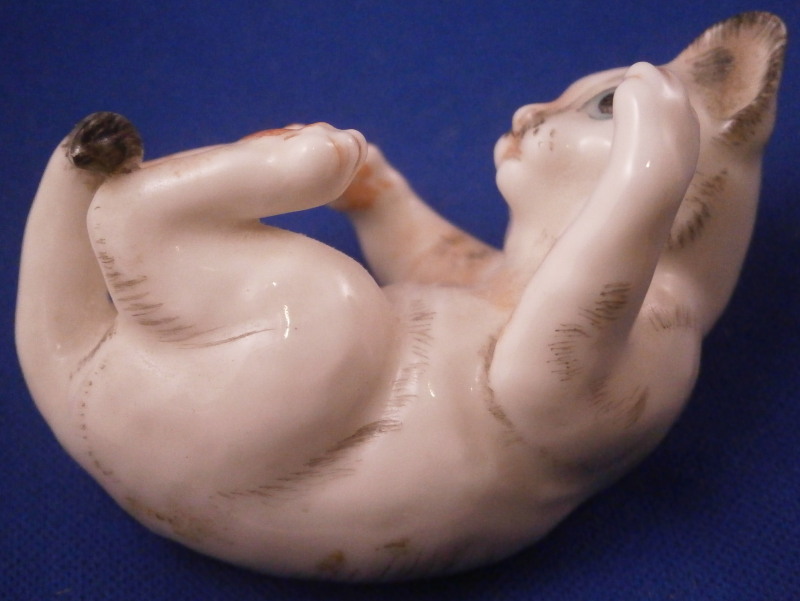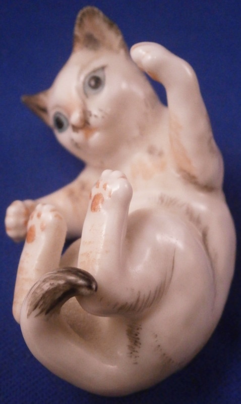 This is a really fun figurine of a playful kitten made by Nymphenburg around the mid 20th century. Not a model one sees often at all and it's the first time I manage to buy it. This little cat goes along with the sleeping mama cat I also have on the site. Reminds me of when the kids where small and we had a rought night with them. All tired in the morning but the kids were always ready to go. Do not miss that :) The figure is very well modeled and painted - just a fun piece to look at! The kitty is 1.375 inches tall, 2.5 inches long and a touch over 1.5 inches deep. It is marked with the impressed shield mark underneath with the model number 770 with a 7 under it and the green shield mark underneath - no room for the word Nymphenburg one usually sees with it. The figure is in perfect condition but can use a little cleanign which I just saw in the pictures. Please email me for more information or other pictures.