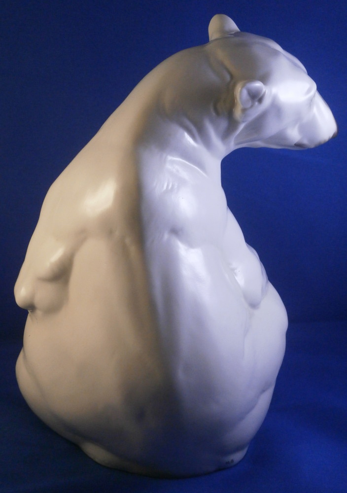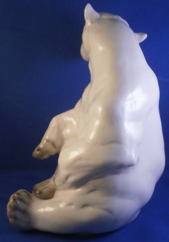 This is an amazing figurine of a polar bear made by Nymphenburg during the mid 20th century right after WWII. Designed by Willy Zuegel - he is an amazing figure to look at. Amazingly modeled and painted just enough to look real. One of the nicer versions I have come across but these are not common at all! The figure is 8.5 inches tall, 6 inches wide and 6.25 inches deep. The figurine is marked with the impressed shield mark underneath with the number 392 and 9 as well as the artist name W. Zügel impressed into the back bottom edge which is very hard to see but is right next to the painter's initials in black. Green shield mark with the crown above and Nymphenburg underneath and Western Germany under that. Artist initials H.S. in black on the back edge. The piece is in perfect condition! Quite fun to look at really! Please email me for more information or other pictures.