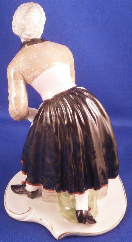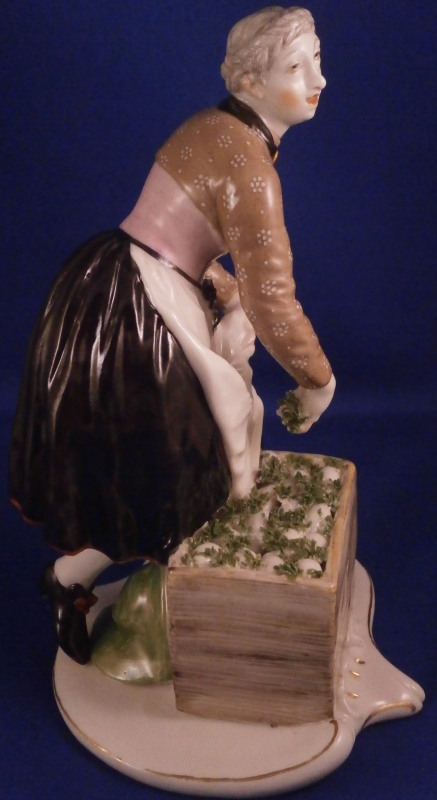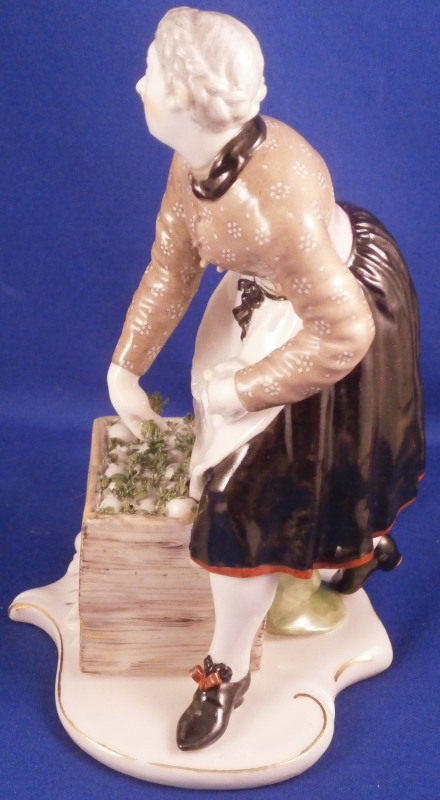 This is a nice figurine from the street seller series first modeled by Bustelli in 1758 and made by Nymphenburg in the early 20th century. She is known as Eiergretl in German and is of a nicely dressed lady selling eggs bending down to lift the moss covering her eggs in the crate beside her. This is the polychrome hand painted version which is much harder to find than the white one. Typical simple base for Nymphenburg which brings out the figurine perfectly! The modelling by Bustelli is unbeatable and even 250 years later they are still amazing to look at and still collected by many fans of his. The piece is in perfect condition with a touch of wear to the gilding around the edge of the base. The figure is marked on the front of the crate with an impressed shield mark as well as on the underside plus the model number 550 over 3. An old dealer or colelctor sticker to the underside as well as shown. The figure is 6 inches tall, 3.875 inches wide and 3.75 inches deep. Please email me for more information or other pictures.