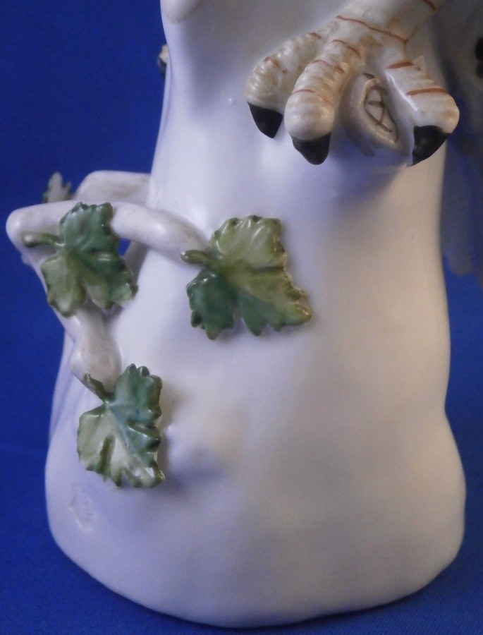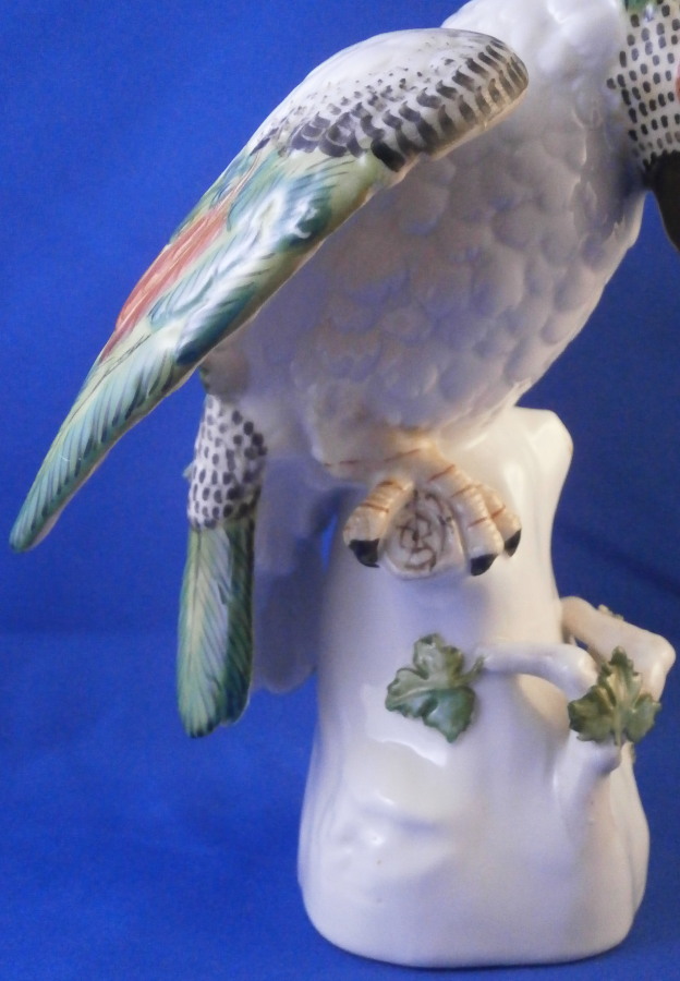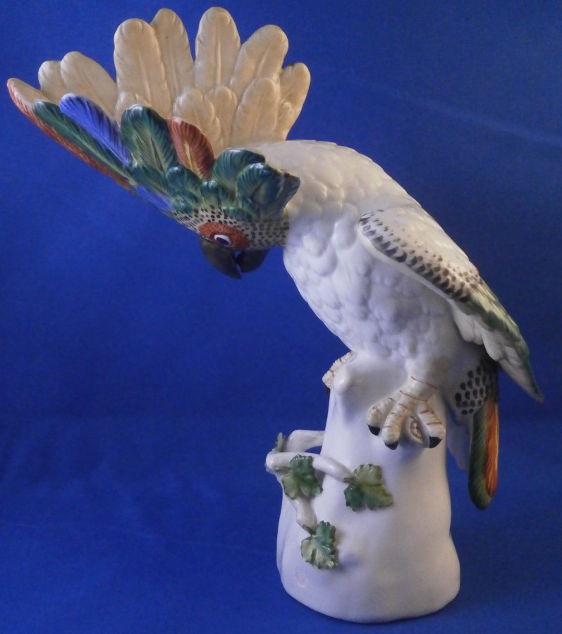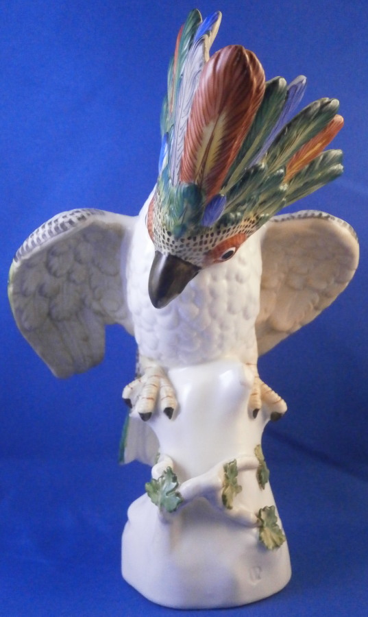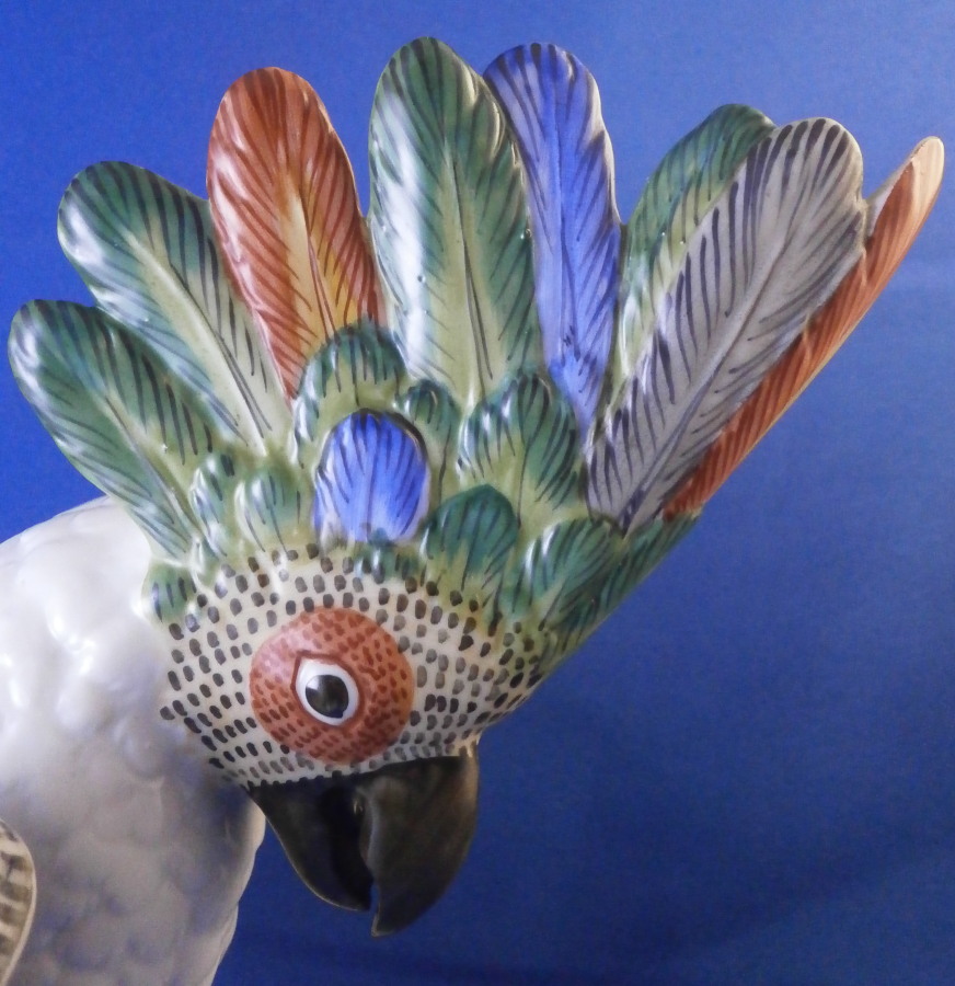 This is a figurine of a cockatoo / parrot bird made by Nymphenburg in the 20th century. It is really nicely modeled sitting on a tree stump with a branch with its leaves coming out the front and hand painted elegantly with nice colors> The figure is just plain cute. The colorful plumage of the head feathers and the ends of the wings and tail are stunning! The piece is 7.625 inches tall, 6.5 inches wide and 5.25 inches deep. Marked with the impressed shield mark to the edge of the base as well as udnerneath as well as numbers 413b and 11. Also a large incised X. The figurine is in superb condition. Please email me for more information or other pictures.