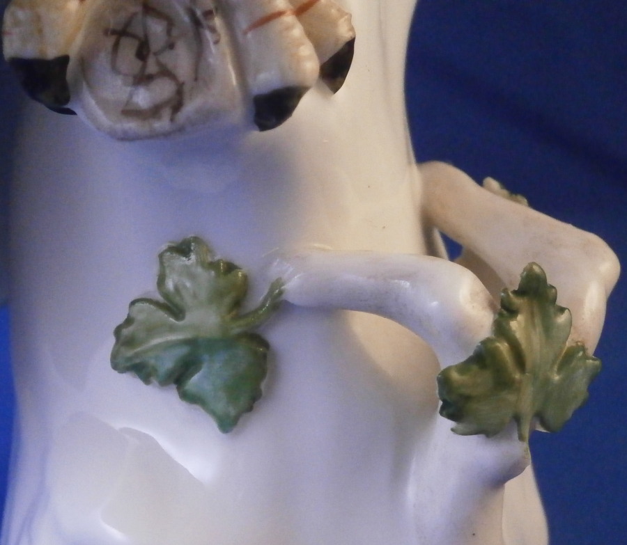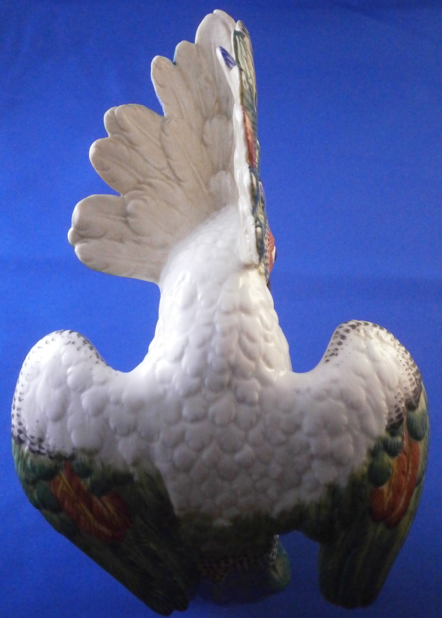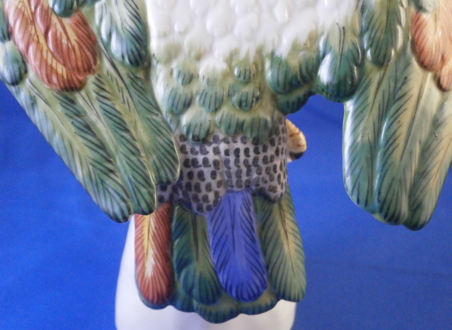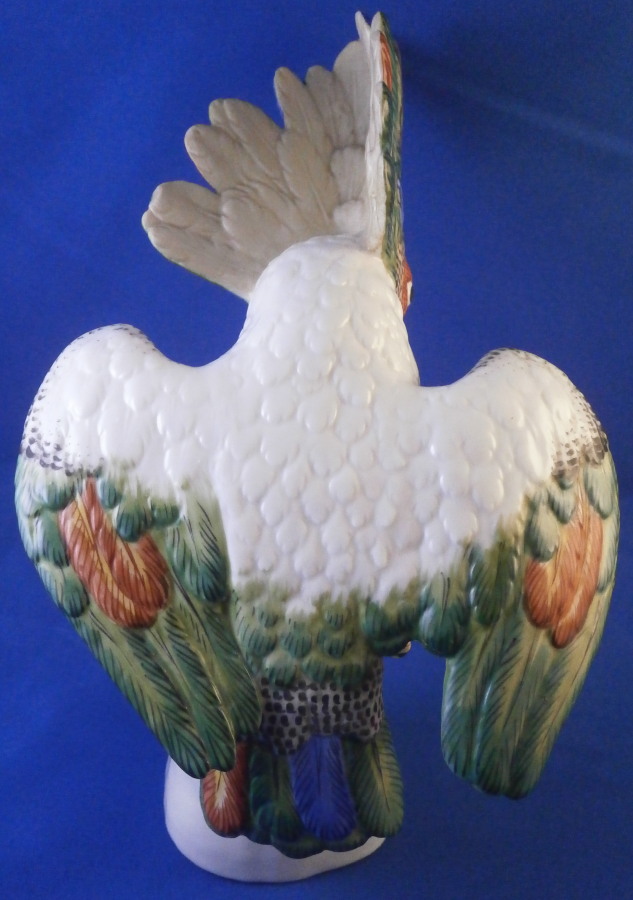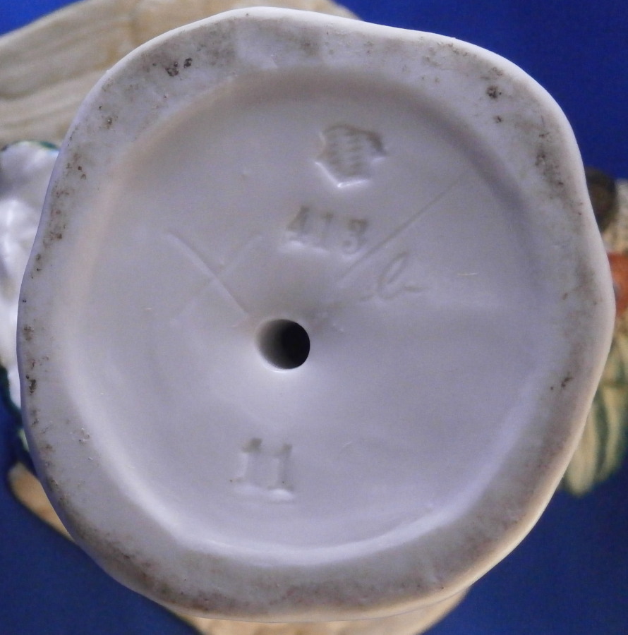 This is a figurine of a cockatoo / parrot bird made by Nymphenburg in the 20th century. It is really nicely modeled sitting on a tree stump with a branch with its leaves coming out the front and hand painted elegantly with nice colors> The figure is just plain cute. The colorful plumage of the head feathers and the ends of the wings and tail are stunning! The piece is 7.625 inches tall, 6.5 inches wide and 5.25 inches deep. Marked with the impressed shield mark to the edge of the base as well as udnerneath as well as numbers 413b and 11. Also a large incised X. The figurine is in superb condition. Please email me for more information or other pictures.