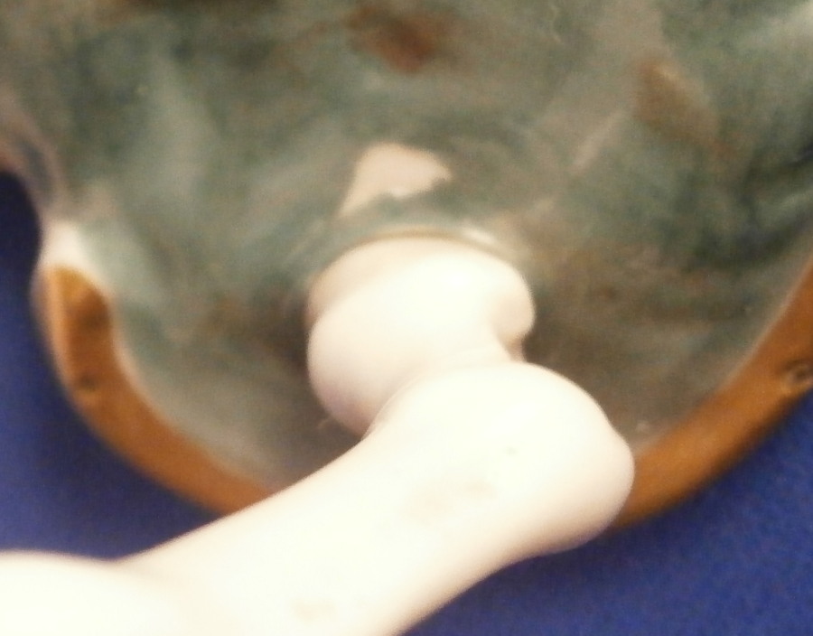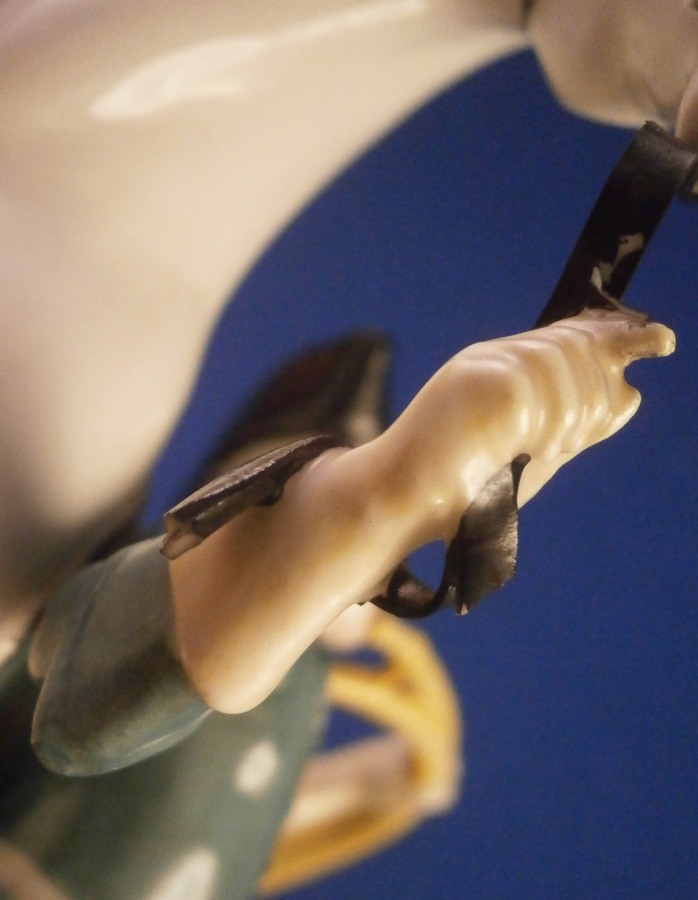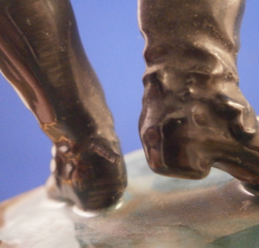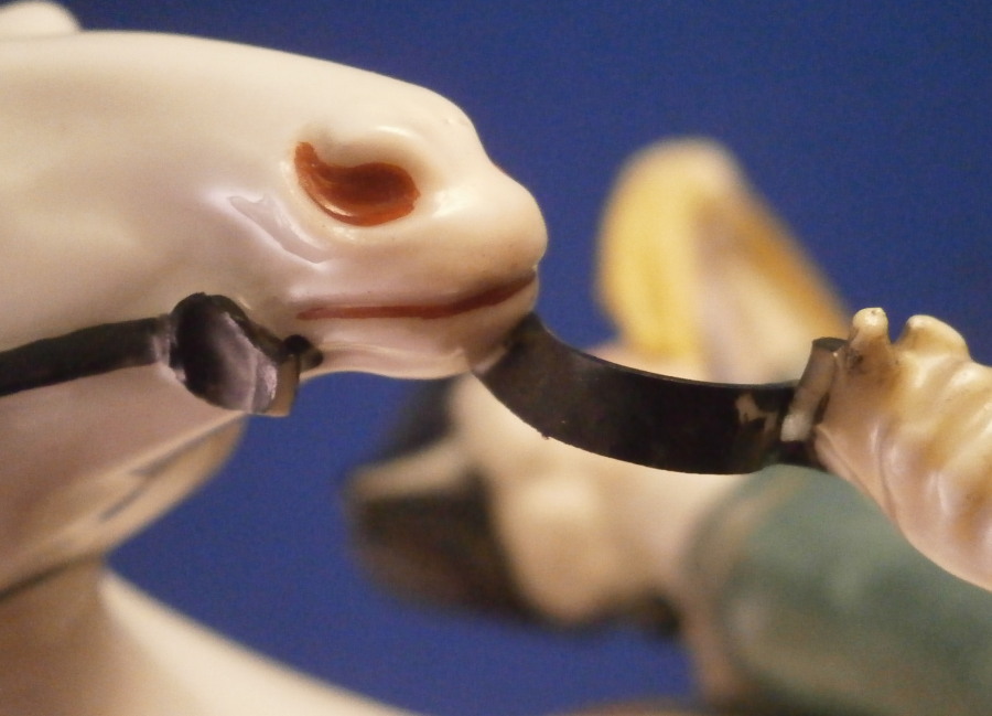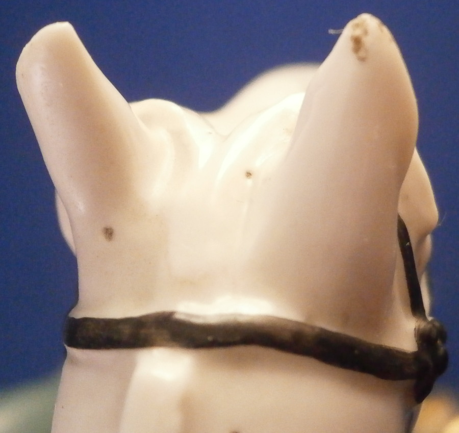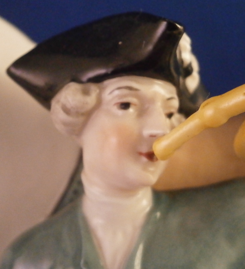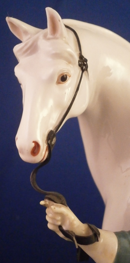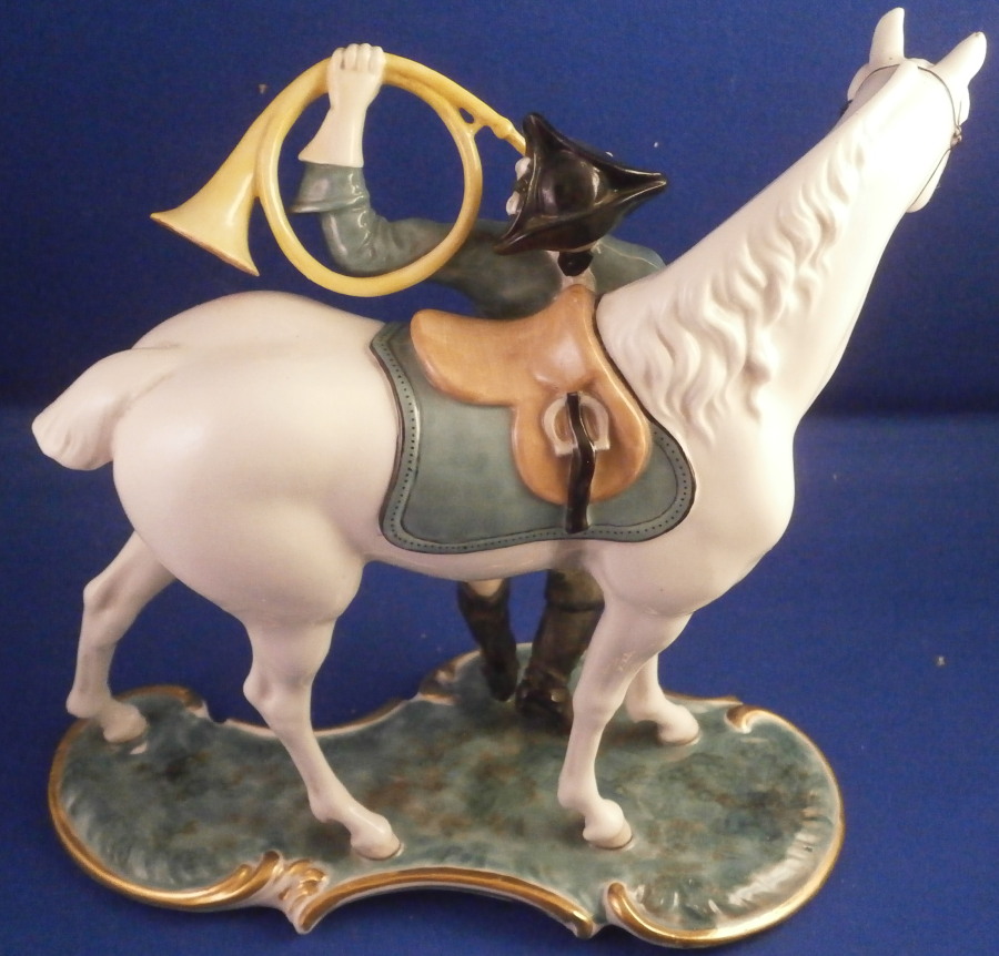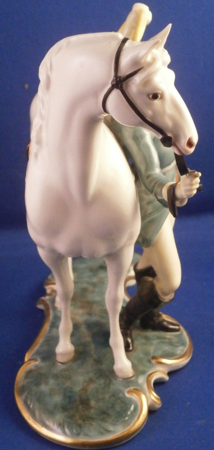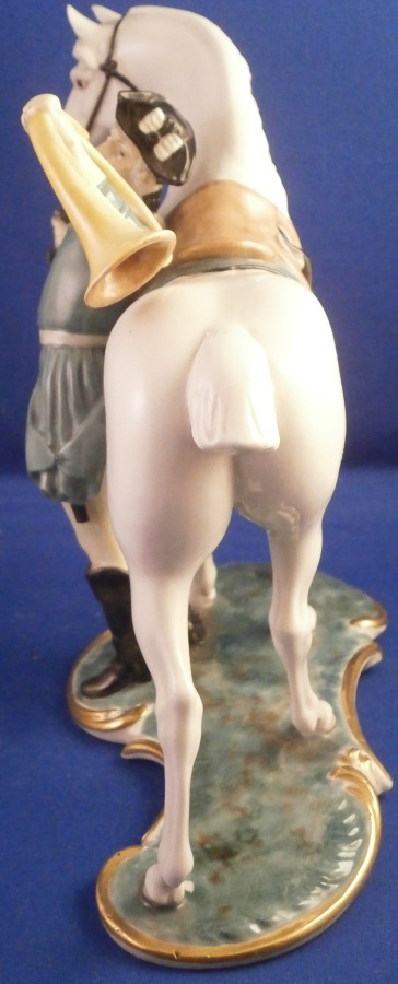 This is a figure of a hunter holding a hunting horn with his horse by his side made by Nymphenburg in the early to mid 20th century. A rare color combination as most you see of this figurine have a red jacket on. I like this more subdued version a lot better! The hunter has the hunting horn in his left hand while holding the reigns of the horse in his right hand. Nice base with gold scrolls all around. The figure is 6.5 inches tall, 3.5 inches wide and 6.875 inches long. The piece is marked with the impressed shield mark underneath, the impressed model number 363 and 7 and the painter's mark or design number in red NB1758 . The figurine is in good condition with a small nibble to the tip of one ear on the horse, one side of the reigns missing as is the loop for the reigns under his hand, the tip of the dagger sticking out from under his coat is missing, his spurs are missing and there is a paint flake to the base by the back left hoof. Sounds much worse than it is and the figurine displays nicely! If need be the faults would be a fairly easy fix for a good restorer plus this rare color combination makes it worth the cost. Please email me for more information or other pictures.