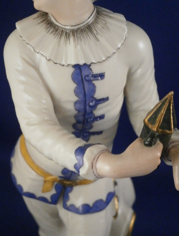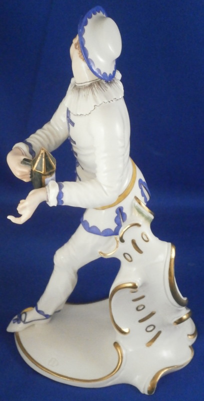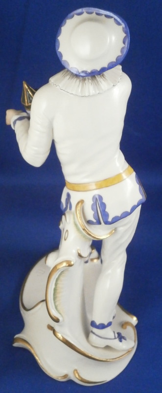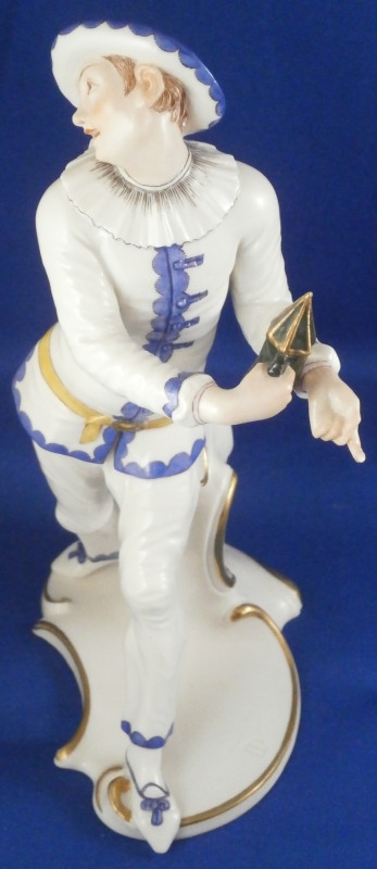 This is a superb figurine from the Commedia dell'arte aka the Italian Comedy made by Nymphenburg in the early 20th century. This figure is of Pierrot and is one of the most important principal characters found in commedia dell'arte. His character is that of the sad clown, pining for love of Columbine, who usually breaks his heart and leaves him for Harlequin . The figurine is superbly modeled and hand painted perfectly. I really like this version of his model as the paint is jsut enough but not distracting from the porcelain itself. First designed by the best porcelain modeler of the 18th century - the famous Franz Anton Bustelli - it is just one elegant and fun piece to look at. The figure is 7.75 inches tall, 4.5 inches wide and 3.125 inches deep. The piece is marked with the impressed shield mark on top of the base, a blue and gold painted shield mark between his legs up on the scroll column he is leaning on and and impressed model number 54, 5 and II in Roman numerals incised which is a size reference. The figurine is in perfect condition. Please email me for more information or other pictures.