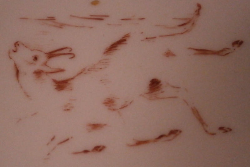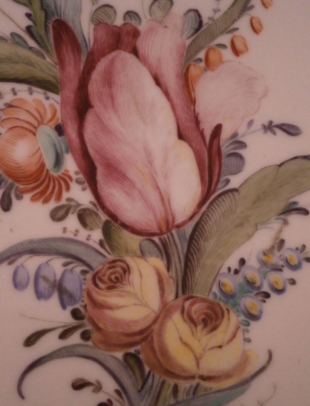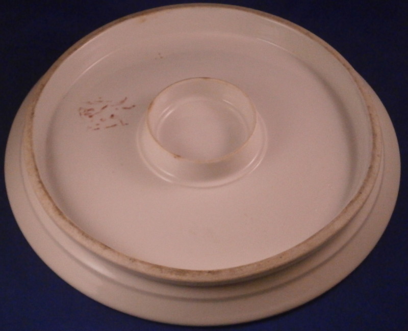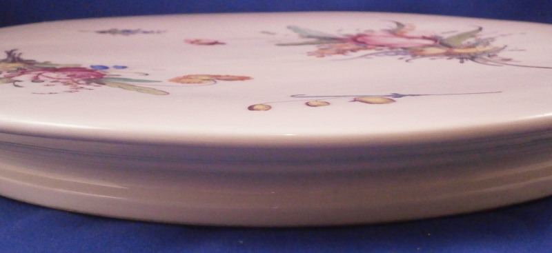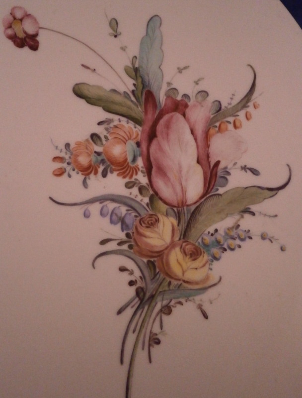 This is an unusual piece made by Nymphenburg in the late 18th century. I think it was a stand for pots de creme but it could be used as a cake stand as well or a serving plate. The piece is hand painted with two large floral arrangements as well as two single flowers. The top has a flat round shape to it with a wife foot to the underside with a central support. Very thickly potted and very heavy and sturdy which is why it has survied in such great condition with just a minor touch of wear. What makes this piece a bit more interesting is an unusual additional mark to the underside of a chamois or gemse running in red as shown plus the usual impressed shield mark, number 6 impressed and four dots. Not sure what the additional mark is for but probably for some sort of high society member or royalty. Never seen that on a Nymphenburg piece! The platter is 1.375 inches tall and 12 inches in diameter. Please email me for more information or other pictures.
