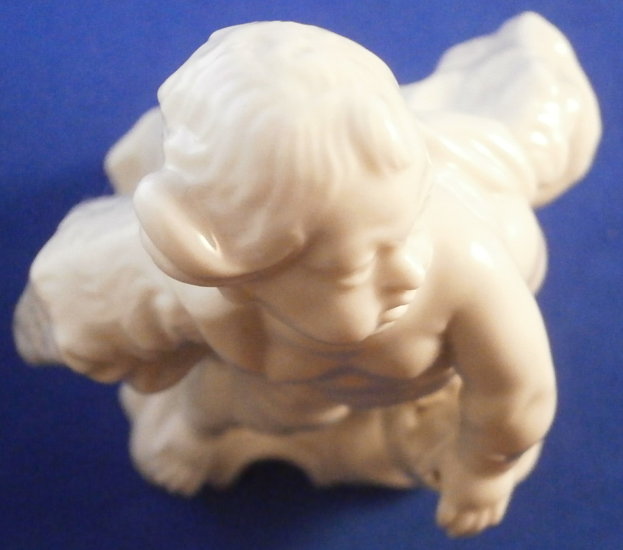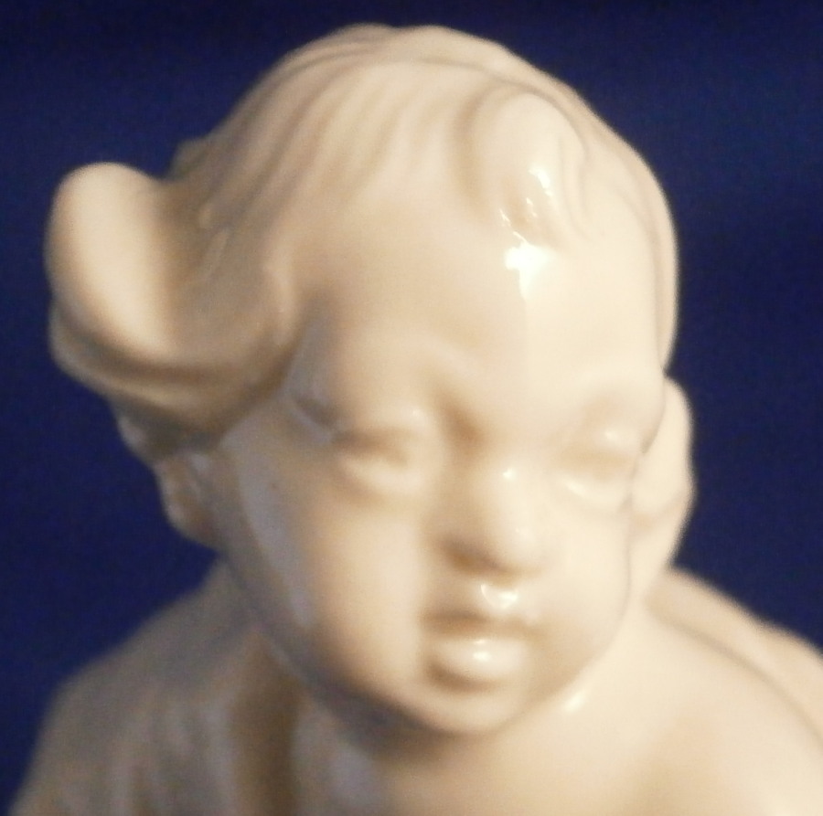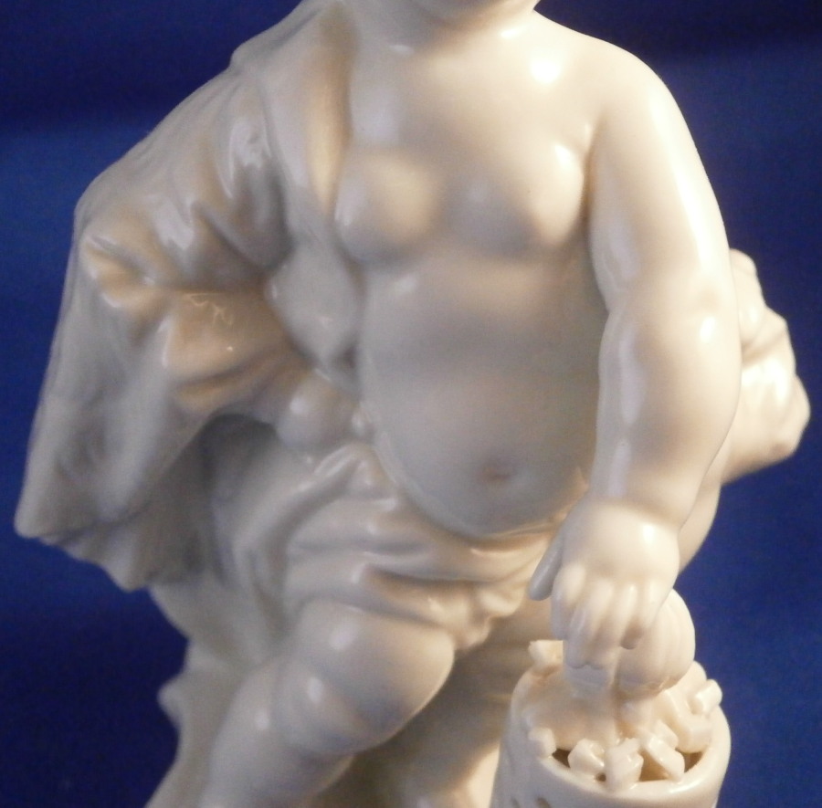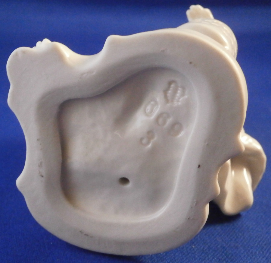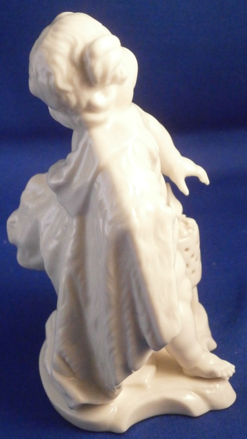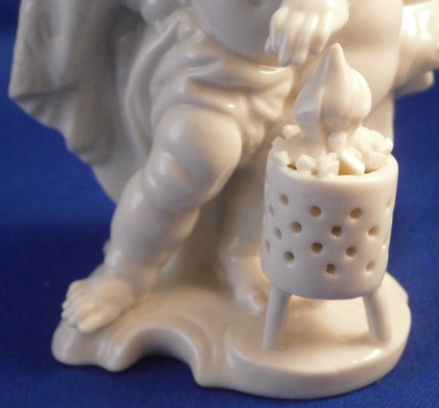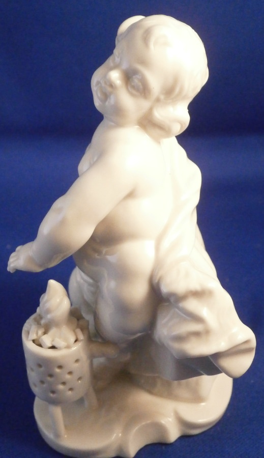 This is a figurine of putto made by Nymphenburg in the early 20th century. The figure is meant to represent Winter and is in perfect condition. The putto is covered in a coat and warming itself over a little fire by his side while standing on a typical base for this maker. Nicely modeled with lots of details to it including a coat that looks like real fur. Left in the white to show off the details nicely! The piece is marked underneath with the impressed shield mark and has the impressed numbers 669 over 3. The figure is 4 inches tall, 2.25 inches wide and 2.375 inches deep. Please email me for more information or other pictures.