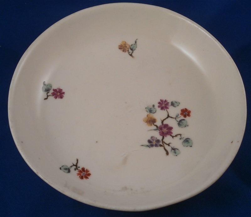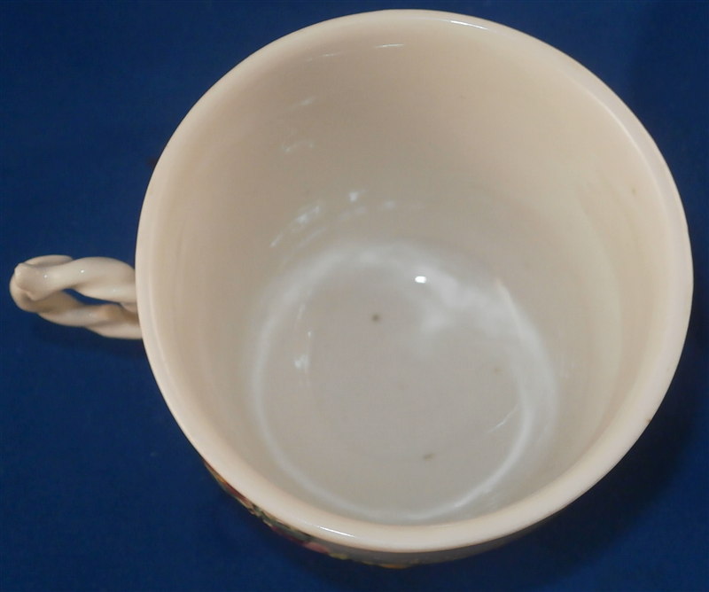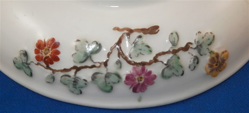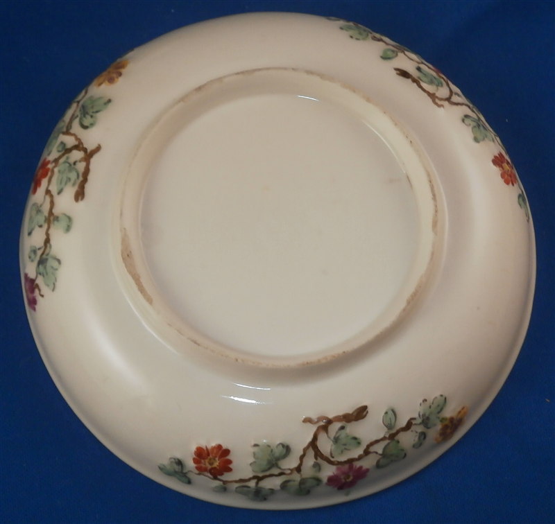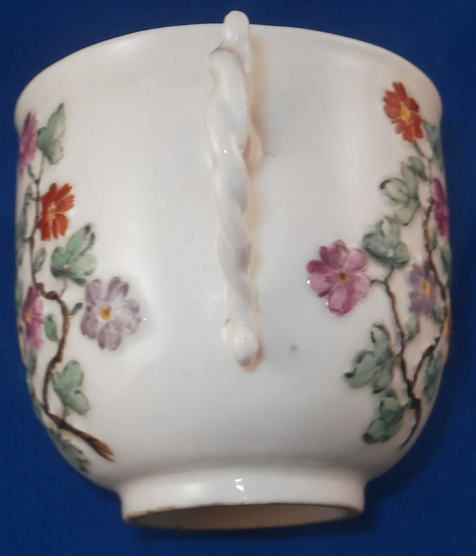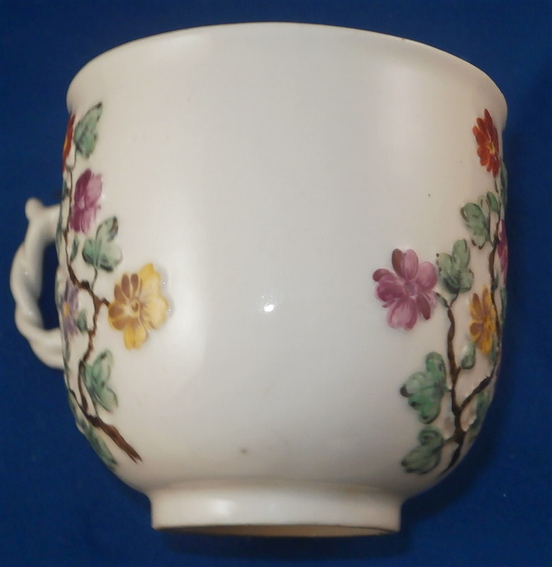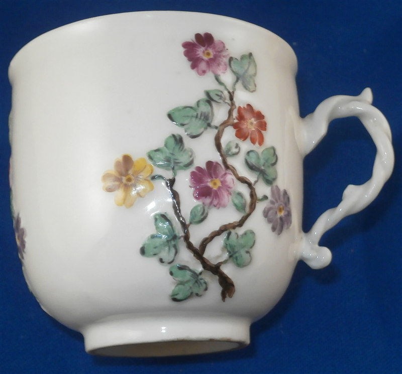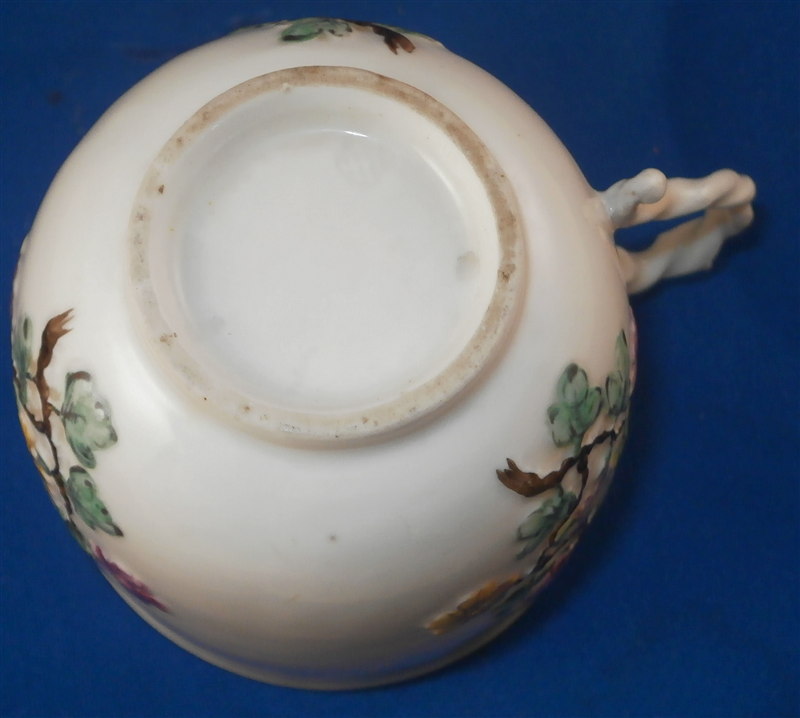 This is a great cup and saucer made by Nymphenburg in the 18th century. Both pieces have a neat relief flower design to the outside / underside including its leaves and stems which is really stunning. Nice twisted branch handle to the cup and otherwise quite simple and elegant. The top of the saucer has the flowers simply painted not in relief since that wouldn't work with the cup sitting in it :) Both pieces have the impressed shield mark as well as another impressed mark that is hard to see underneath near the footring. They are both in good condition with a tiny bit of wear to the saucer top and some munching to the footring of the saucer most of which is original to the making and none takes away from the piece. A couple of black firing spots normal to these early pieces. The cup is 2.5 inches tall and 2.625 inches in diameter. The saucer is 1 inch tall and 5 inches in diameter. Please email me for more information or other pictures.