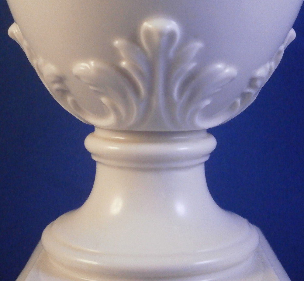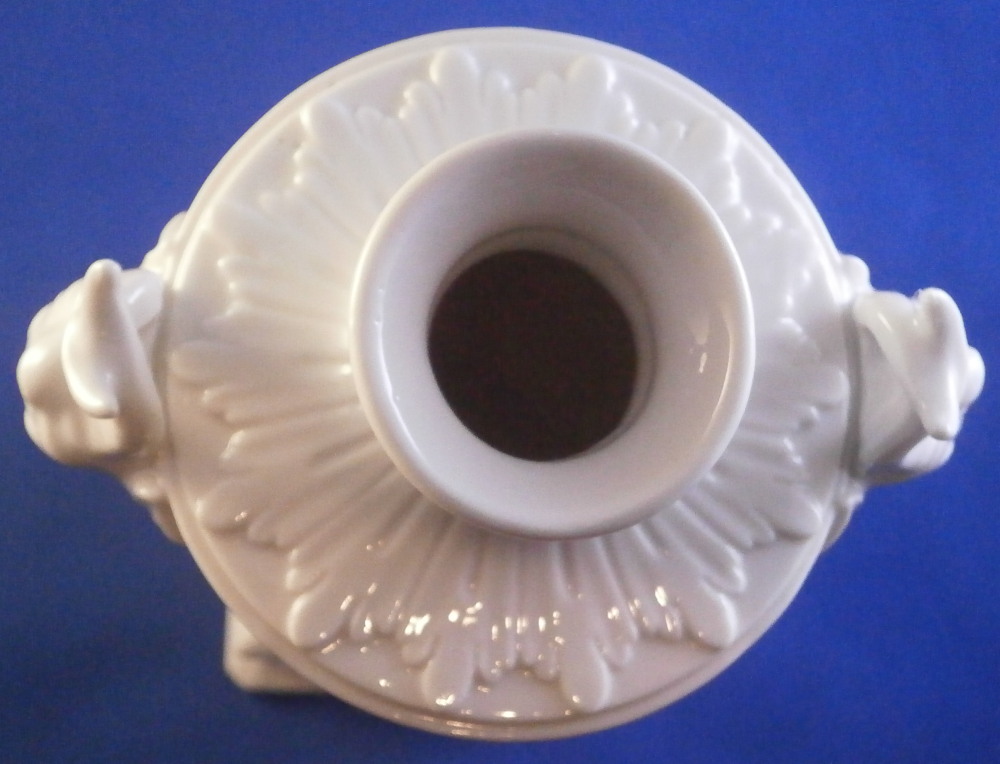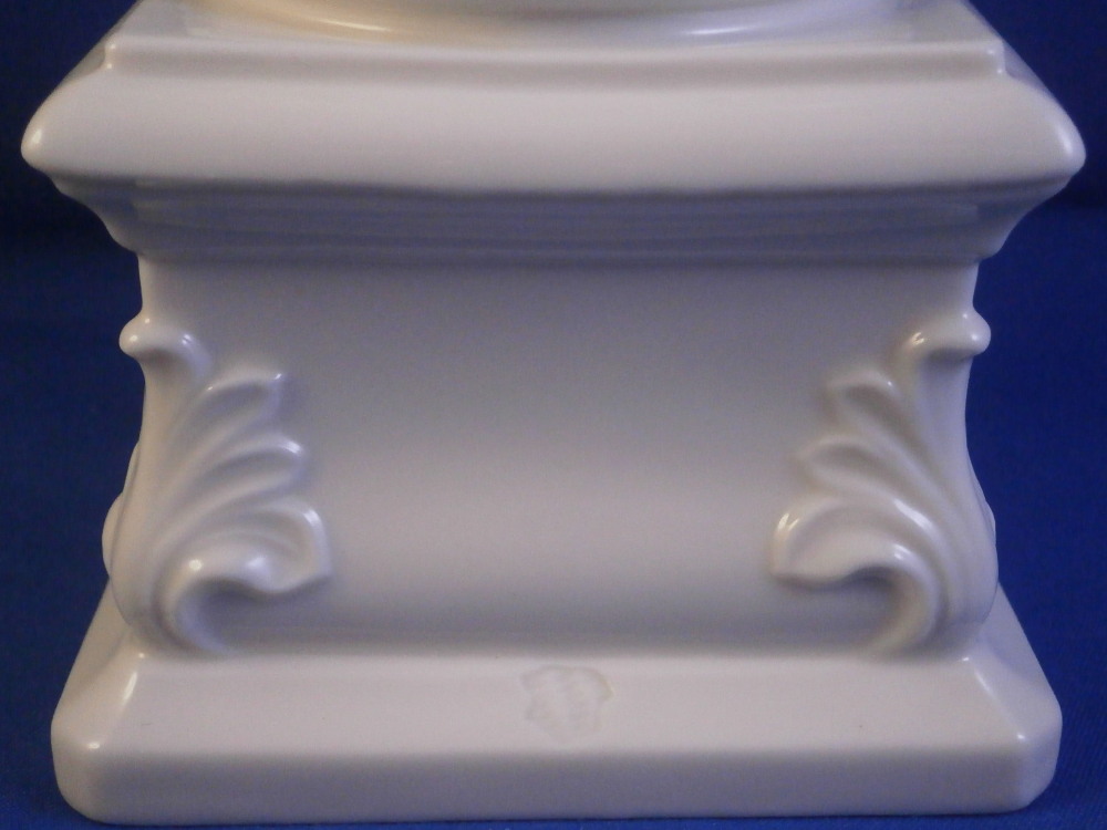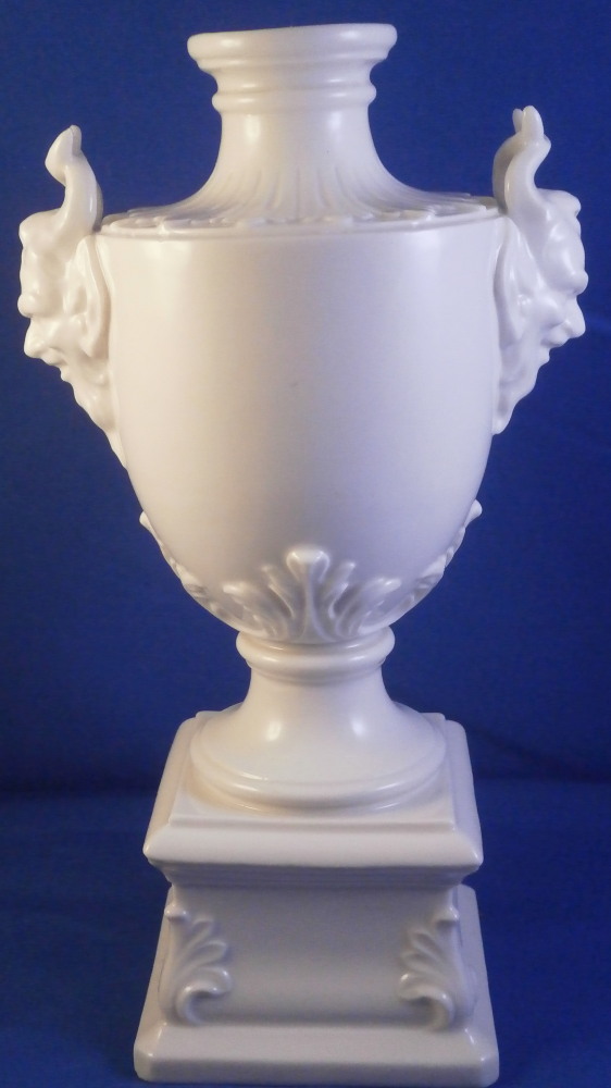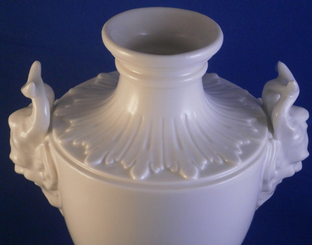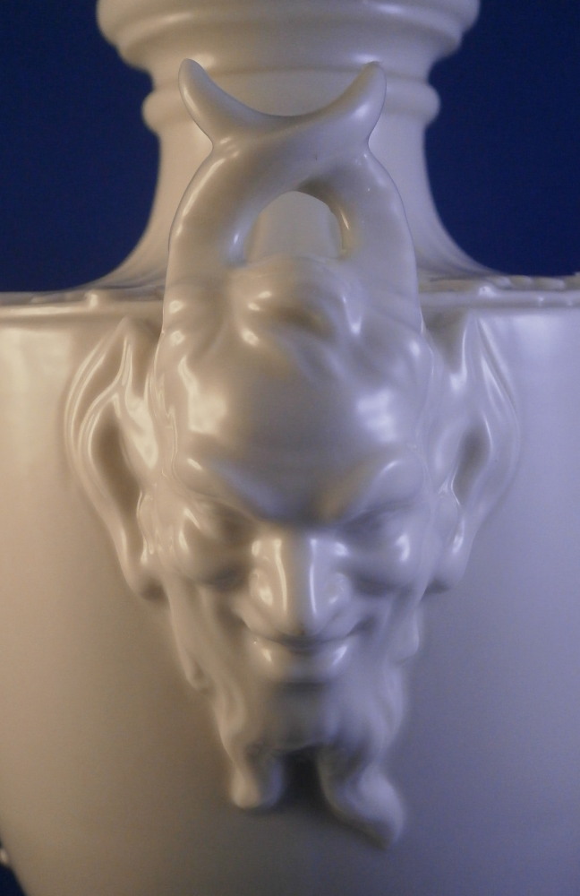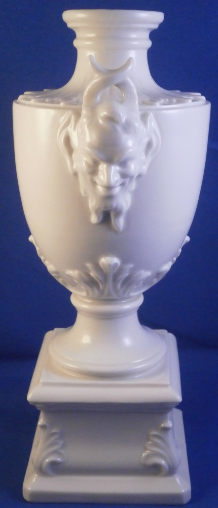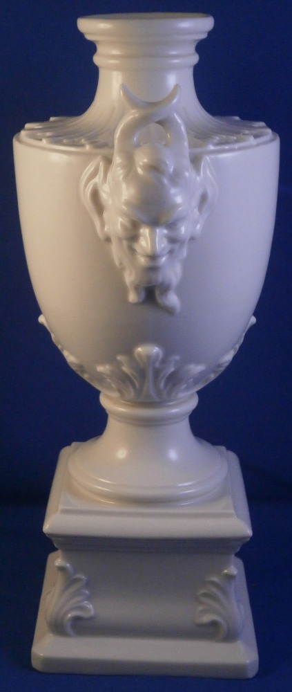 This is a very rare lrage version of the satire urn / vase on a nice base made by Nymphenburg in the mid 20th century. It has the Bavarian shield in relief in the front bottom edge of the pedestal base and an urn on top of that pedestal. It's all fired as one piece so does not come apart! The urn / vase part has devil heads aka satire masks as the handles on the sides and some nice relief decoration to it. The base has relief leaf designs to the corners. Looks amazing and it's a piece that is quite popular among collectors! This larger version is very hard to find! The vase is in perfect condition with jsut a small firing flaw to the back center of the vase as shown from when it was made. The bottom is marked with the impressed shield mark as well as their green shield mark under a crown with Nymphenburg under it and Western Germany under that. Impressed numbers 734 over 8 and a Roman numeral II as shown. The entire piece is 8.5 inches tall, 4.5 inches wide and 3.5 inches deep. A nice size to actually use unlike the smaller version! And to make it even better I have a matching second piece on the site if anyone is interested in a rare pair of these fun vases! Please email me for more information or other pictures.