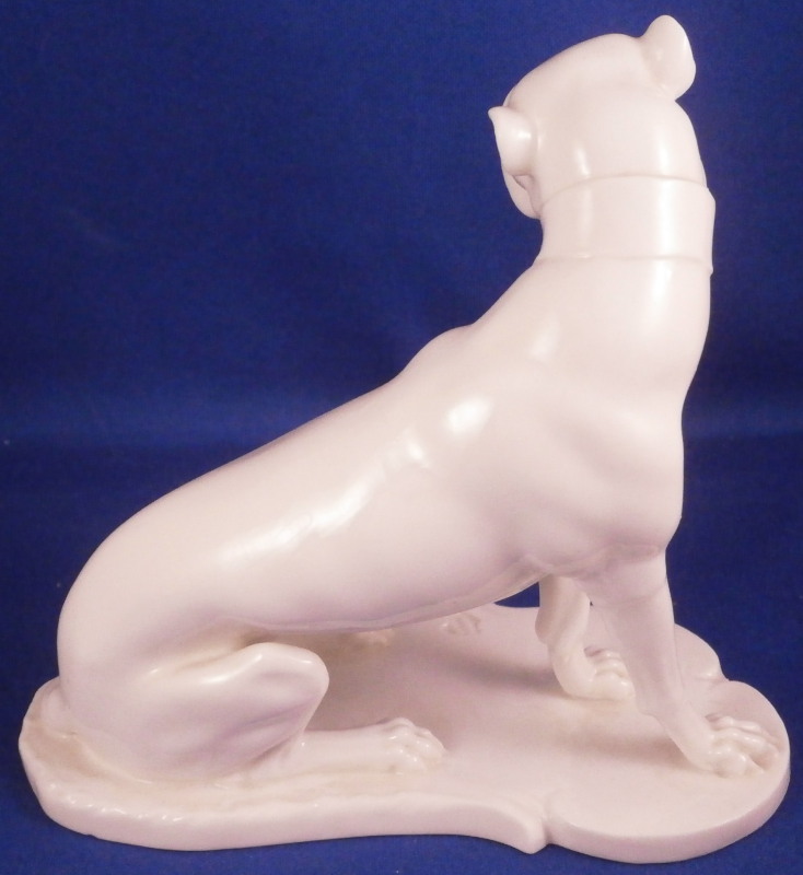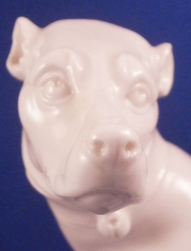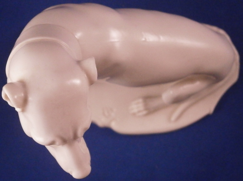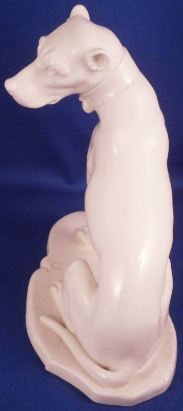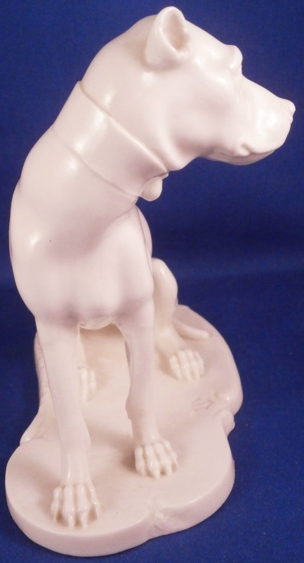 This is a superb and figurine of a mastiff dog made by Nymphenburg around the mid 20th century. Originally modeled by the famous Bustelli it is an amzingly well modeled figure left in the white to show off all that detail. On a simple and typical base for this maker. A stunning piece and quite rare. The dog is 4.625 inches tall, just under 5 inches long and 2.5 inches deep. It is marked with the impressed shield mark to the top of the base in the center front and again to the underside along with the model number 543 over 6. The figure is in perfect condition. Please email me for more information or other pictures.