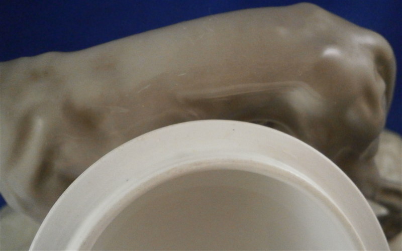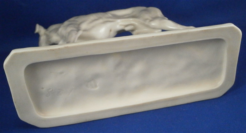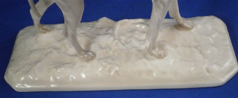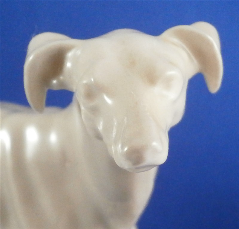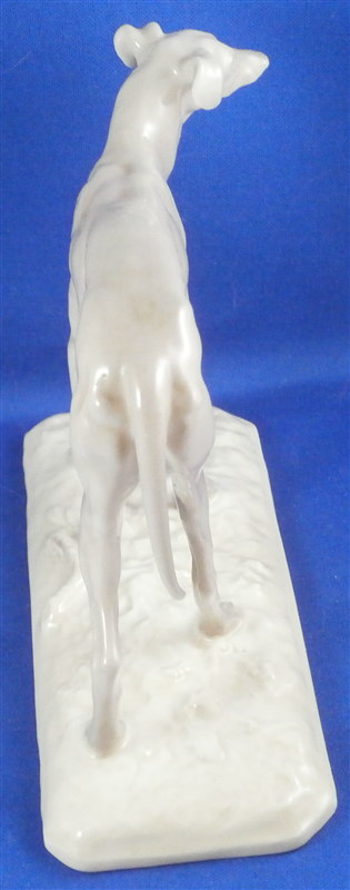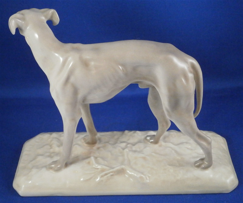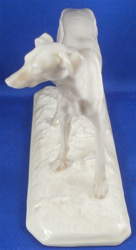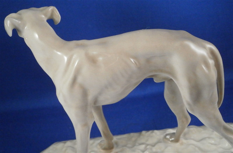 This is a rare figurine of a whippet or greyhound made by Nymphenburg in the late 19th century (1898). While we have all seen this figurine 1000 times in white this is only the second time I ahve come across a painted version of this model. The other piece I bought quite a few years back and sold it quickly and ahve been looking for another one ever since! The dog is painted grey while the base is a light green. Kind of brings out a bit more detail this way from the ribs of the dog to the branch on the base. A bonus is that it is a very early version of this model having the model number still incised and no other numbers. This piece was first designed by P.J. (Pierre Jules) Mene whose name is also on top of the front base. A very well modeled and painted animal figurine! The dog is 4.375 inches tall, 2.25 inches wide and 6 inches long. It is marked with the impressed shield mark underneath with the model number 128 incised. The figure is in perfect condition with one toe lacking color but it is glazed and original to the making. I held up a white piece of porcelain to the dog in the last picture for comparison since it is rather hard to tell from jsut the pictures. Please email me for more information or other pictures.