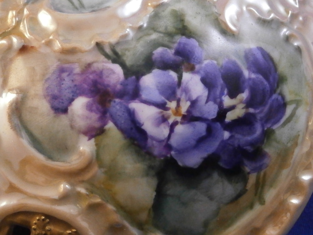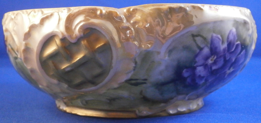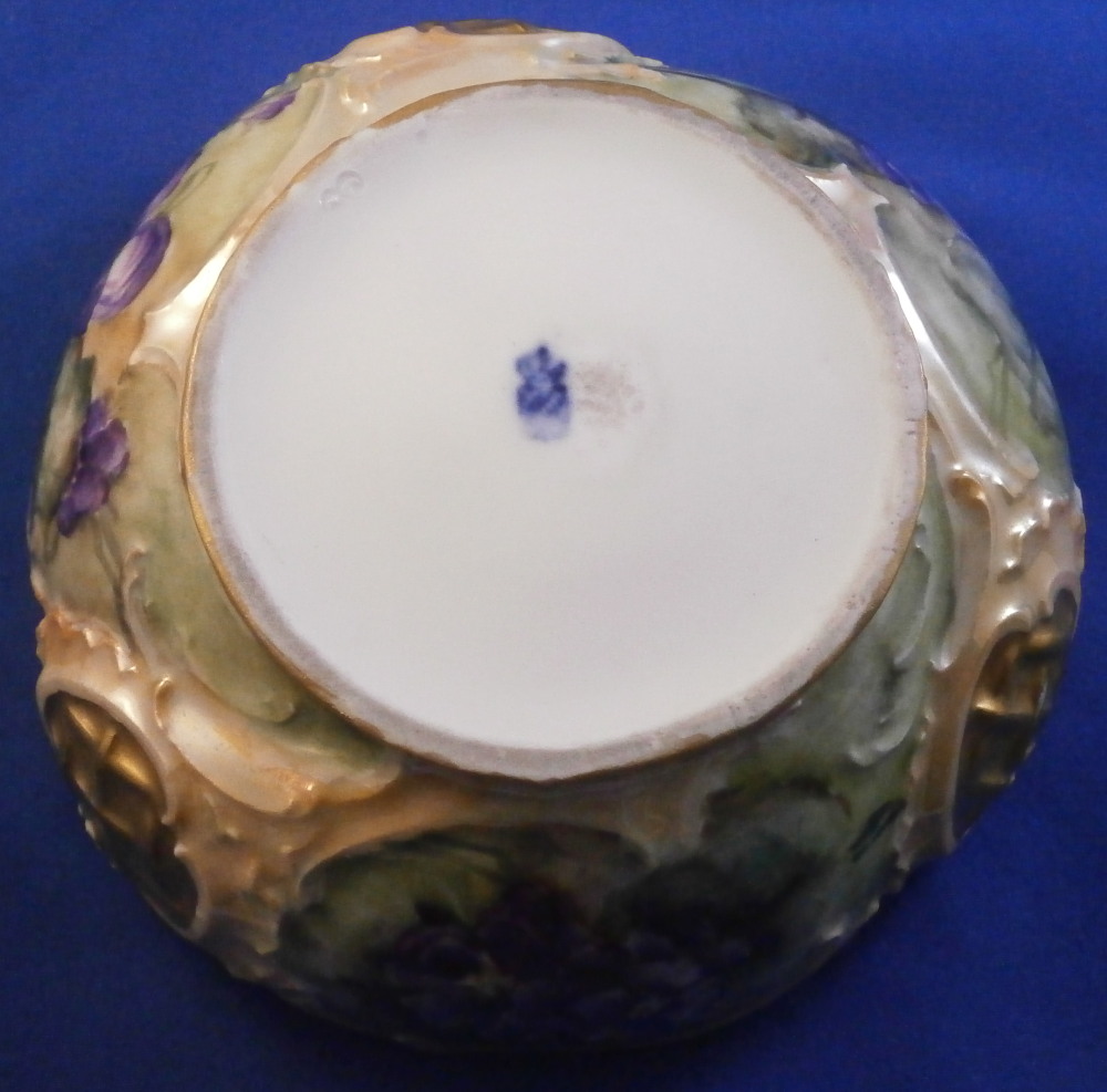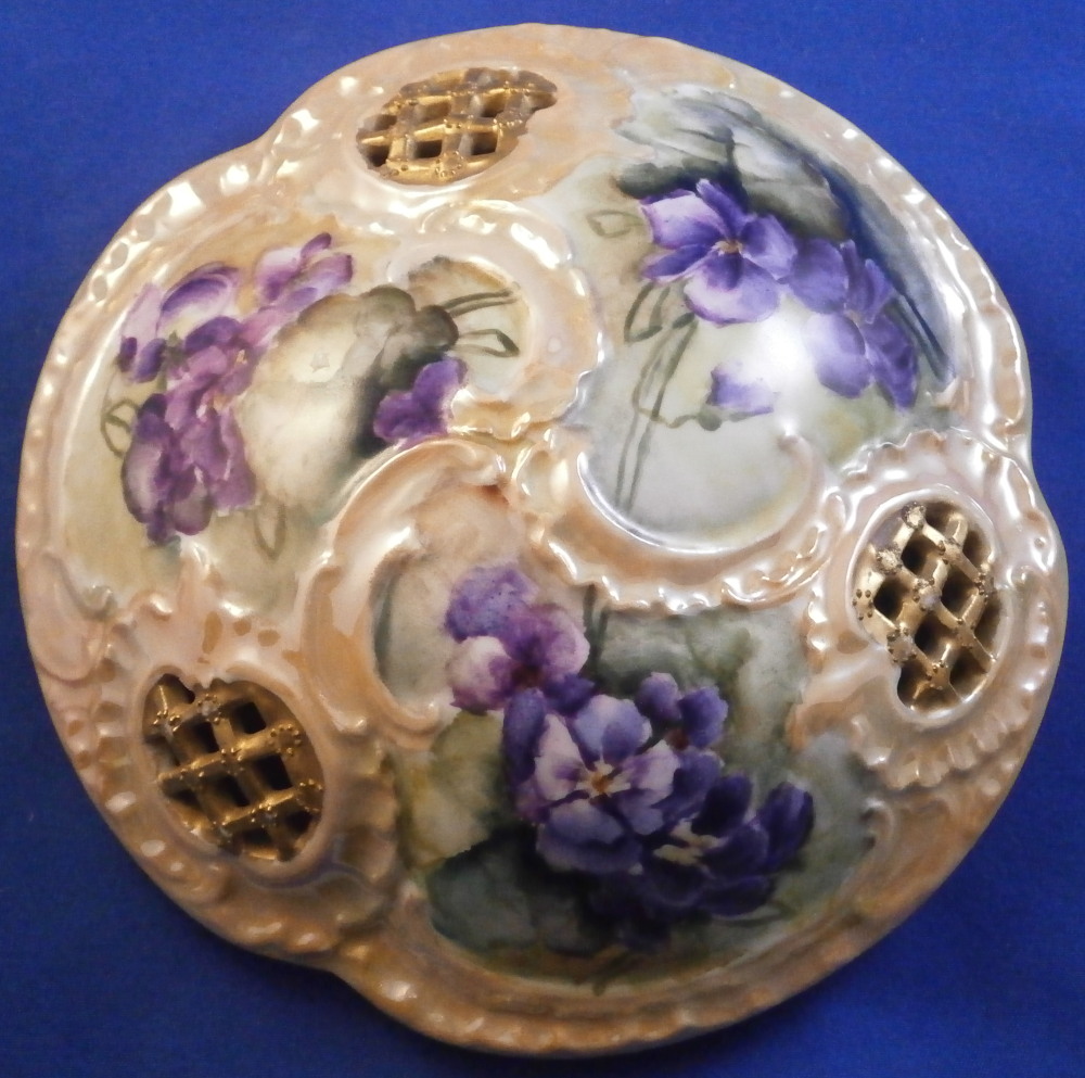 This is a rare reticulated lidded box made by Nymphenburg in the late 19th century. A very rare model but I now own two of them with slightly different decorations. The box has a three leaved clover type of shape and has three reticulated panels to the lid and a closed version of that on the main body with three nicely hand painted floral scenes of violets including their purple blossoms and green leaves. Lots of raised detail in between painted in an irridescent orange color that is really neat. The inside is painted with a light greenish off white irridescent color that looks amazing. It's a nice looking little piece! The underside is marked with the 19th century blue shield and crown mark as well as an impressed number 3 as shown. It is in superb condition! The piece is 3 inches tall including the lid and about 5 inches in diameter. Please email me for more information or other pictures.