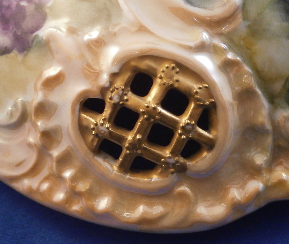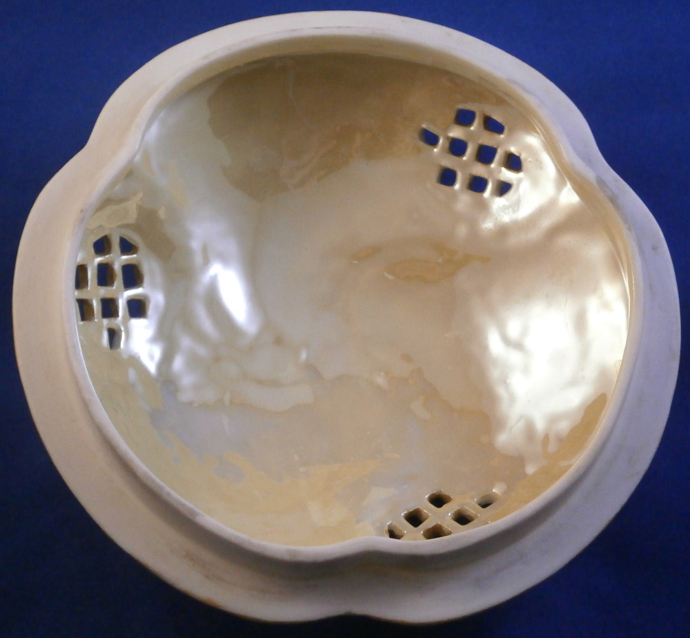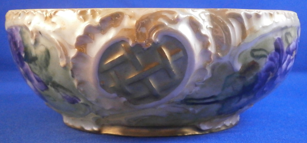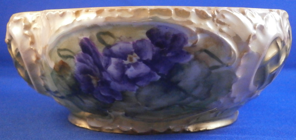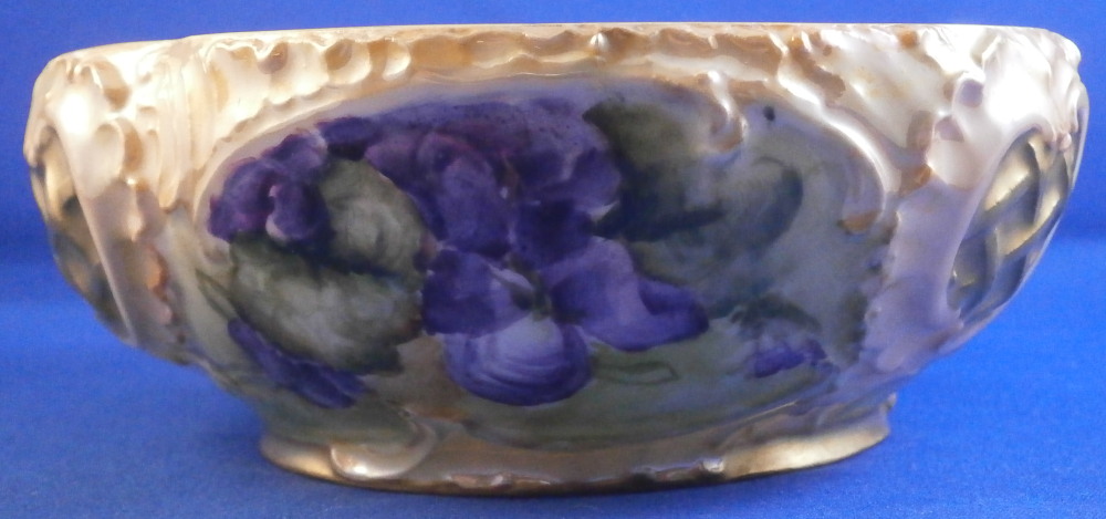 This is a rare reticulated lidded box made by Nymphenburg in the late 19th century. A very rare model but I now own two of them with slightly different decorations. The box has a three leaved clover type of shape and has three reticulated panels to the lid and a closed version of that on the main body with three nicely hand painted floral scenes of violets including their purple blossoms and green leaves. Lots of raised detail in between painted in an irridescent orange color that is really neat. The inside is painted with a light greenish off white irridescent color that looks amazing. It's a nice looking little piece! The underside is marked with the 19th century blue shield and crown mark as well as an impressed number 3 as shown. It is in superb condition! The piece is 3 inches tall including the lid and about 5 inches in diameter. Please email me for more information or other pictures.
