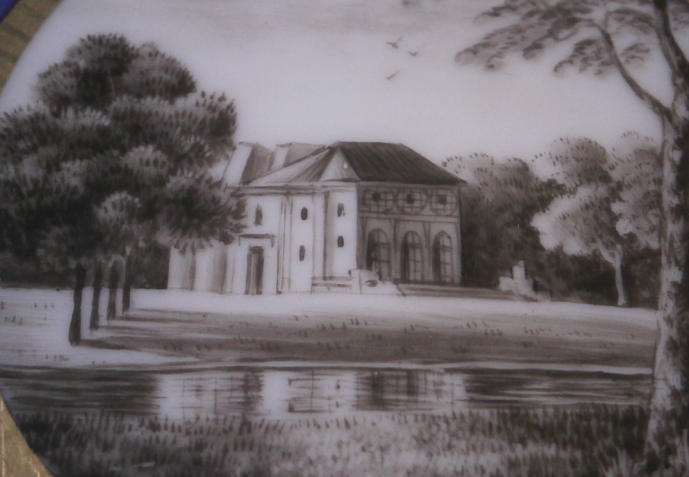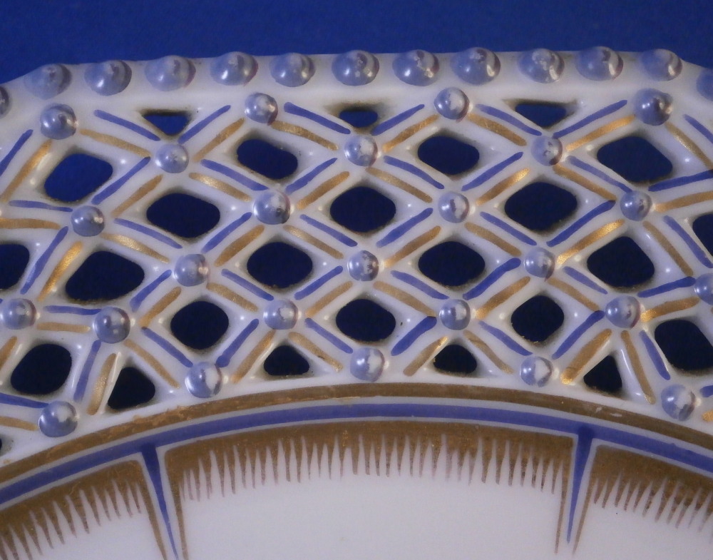 This is a reticulated plate made by Nymphenburg in the early 20th century. It is one from the King's or Pearl service made for the electoral court around 1792-1795 designed originally by Dominikus Auliczek. The original set is still in the possession of the family and thus any pieces of this design are later copies. What makes this plate quite special compared to many others is the reticulated edge which is not easy to find at all. The plate is 12 sided and of the pearl design (refers to the little blue pearls on the rim). Hand painted with a scene in black in the center as well as a superb gold and blue trim. The plate is 1 inch tall and 9 inches in diameter. Marked with the green shield mark with the word Nymphenburg underneath, an impressed shield mark as well as the usual black numbers as shown. The word Baden-Burg is written on the back as well which refers to what the scene depicts on the front. It is the park pavillion on the grounds of Schloss Nymphenburg I believe. The plate is in good condition with some wear to the decoration mainly the gold trim around the edge of the well and the little pearlsalong the rim. It displays very nicely. Please email me for more information or other pictures.