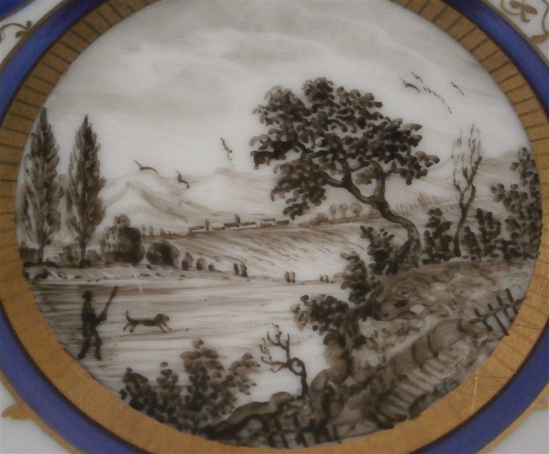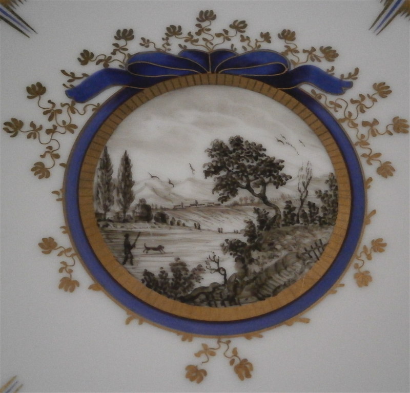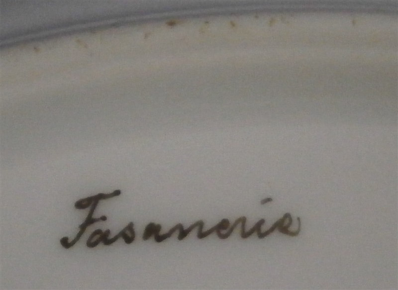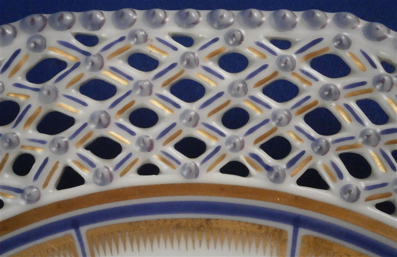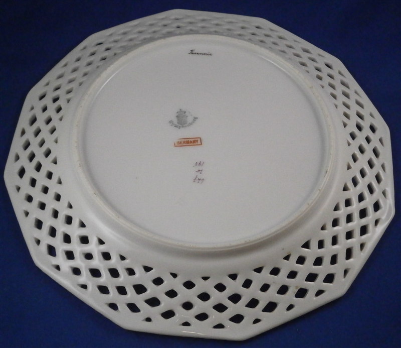 This is a reticulated plate made by Nymphenburg right around 1900. It is one from the Kings or Pearl service made for the electoral court around 1792-1795 designed originally by Dominikus Auliczek. The original set is still in the possession of the family and thus any pieces of this design are later copies. What makes this plate quite special compared to many others is the reticulated edge which is not easy to find plus it is a fairly early piece compared to most one sees. The plate is 12 sided and of the perl design (refers to the little blue pearls on the rim). Hand painted with a scene in black in the center as well as a superb gold and blue trim. The plate is 1 inch tall and 9 inches in diameter. Marked with the underglaze shield mark with the word Nymphenburg underneath. GERMANY in a red rectangle, an impressed shield mark as well as the usual black numbers as shown. The word Fasanerie is written on the back as well which refers to what the scene depicts on the front. Fasanerie is where they kept the pheasants. The plate is in great condition with some very minor wear. Please email me for more information or other pictures.