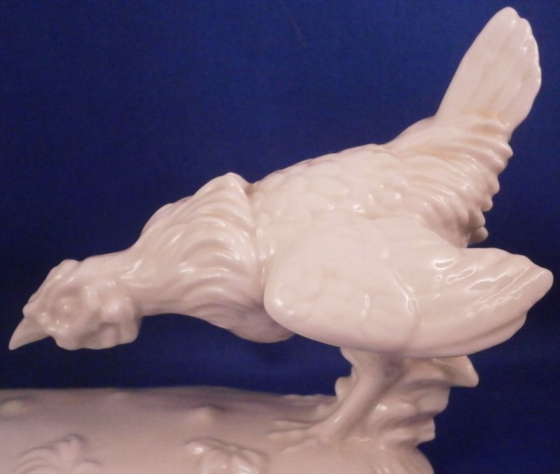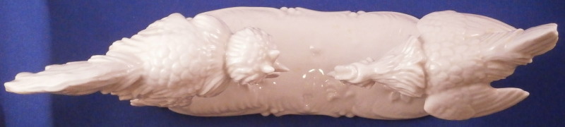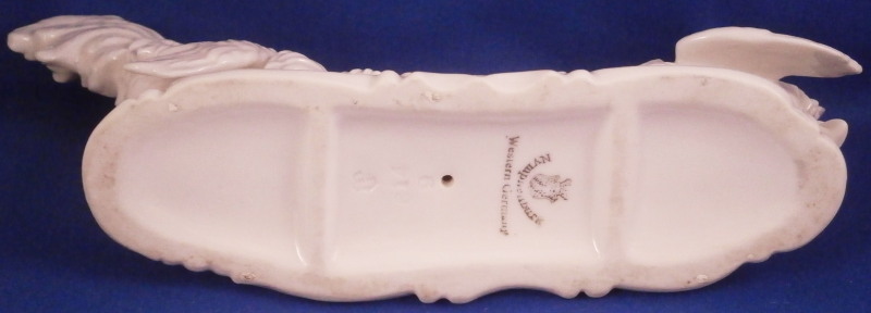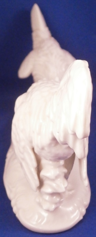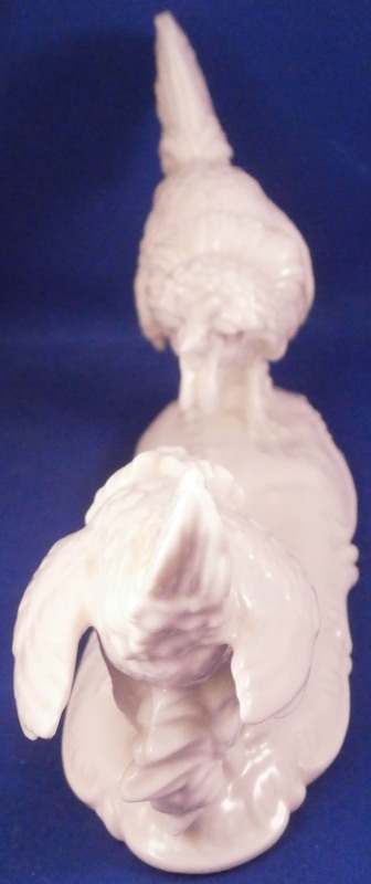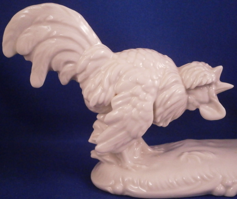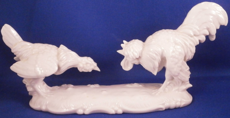 This is a fun blanc de chine figurine of two rooster in a cock fight made by Nymphenburg in the mid 20th century right after WWII. A fun figure that is superbly modeled with nice detail and left in the white to show it all off. The fancy rooster on the left is so much fun to look at while the skinnier one on the right looks fierce. Both are standing on a nice base with some grassed modeled in relief and a nice edge trim. The piece is 3.625 inches tall, 8.25 inches long and 2 inches deep. The figurine is marked with the impressed shield mark in the center on the front top edge of the base as well as on the underside with the numbers 614 over 9 under it. It is also marked with the green shield mark with Nymphenburg under it and Western Germany under that. The piece is in perfect condition. Please email me for more information or other pictures.