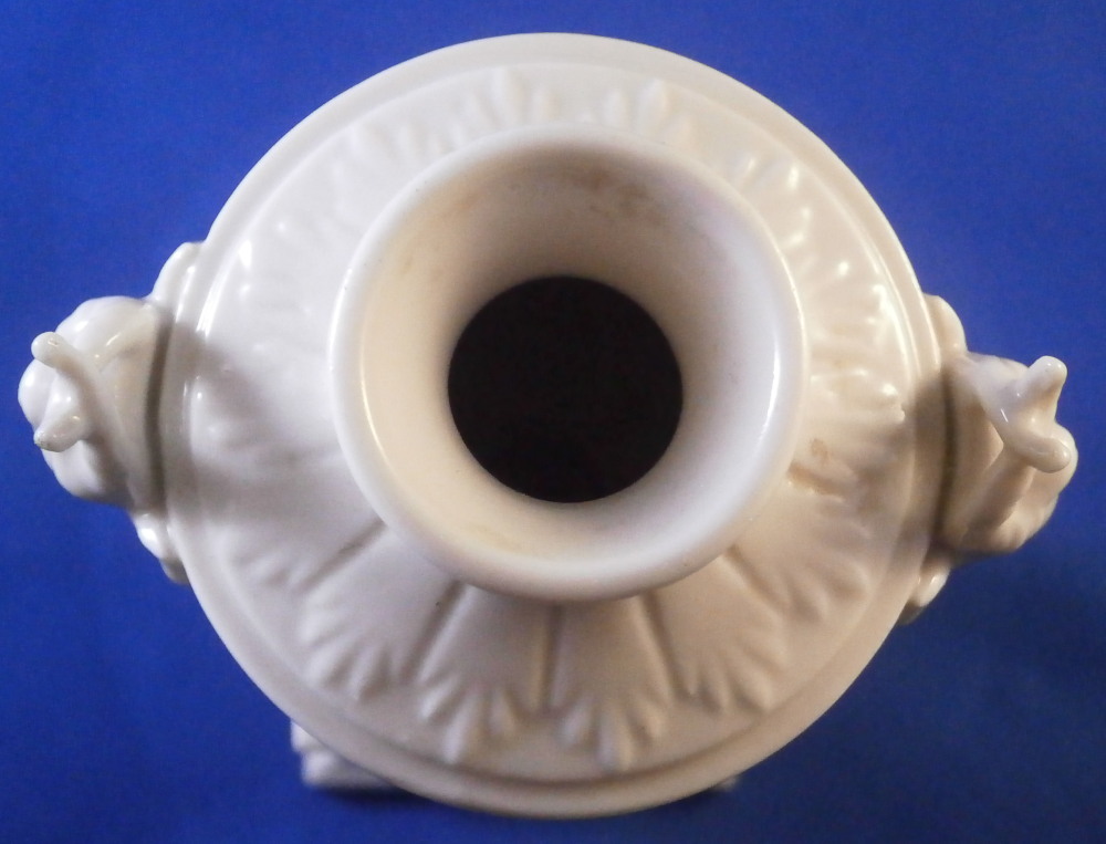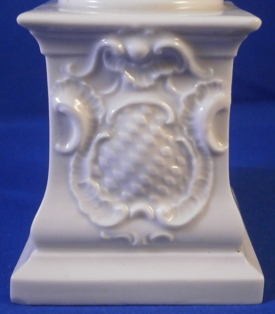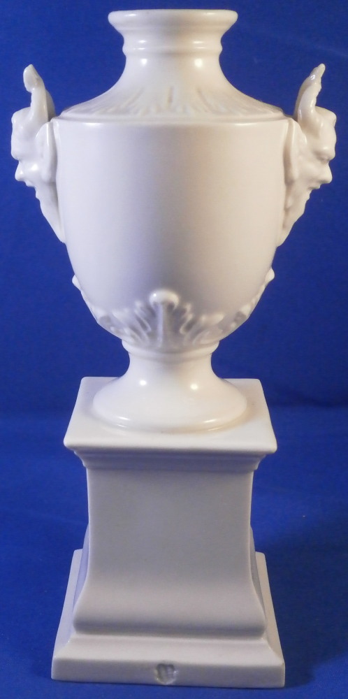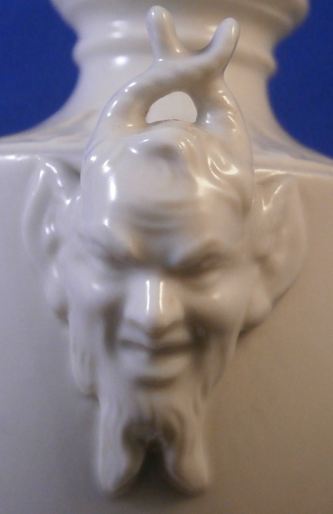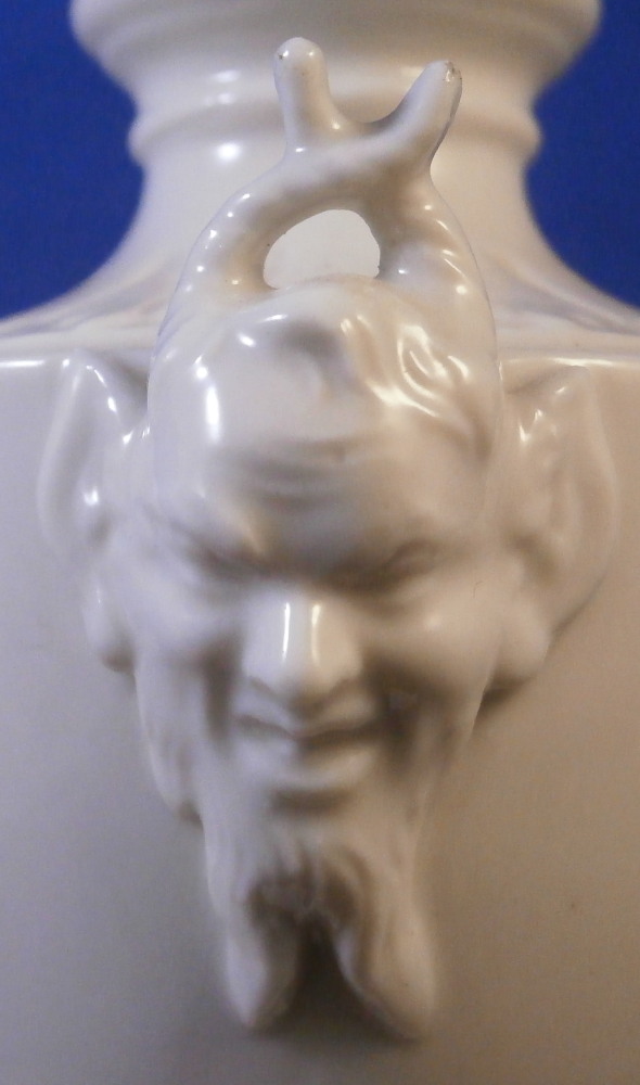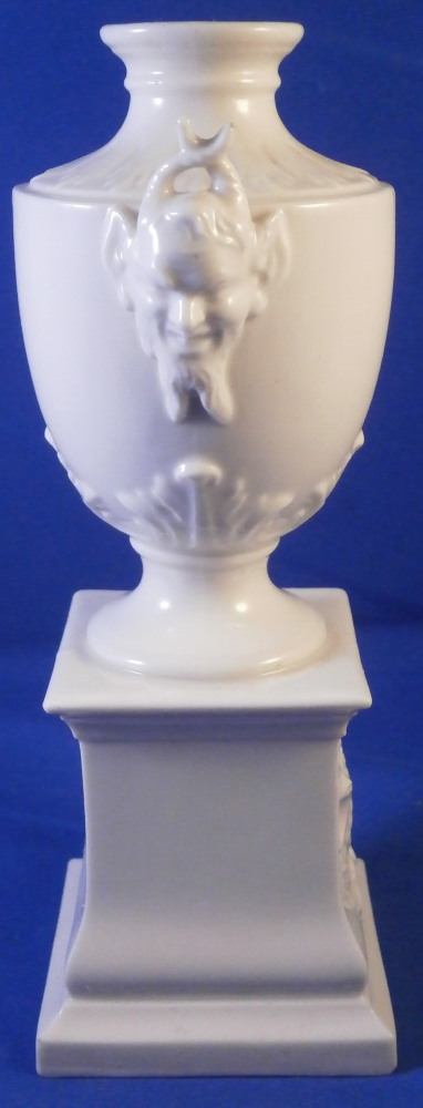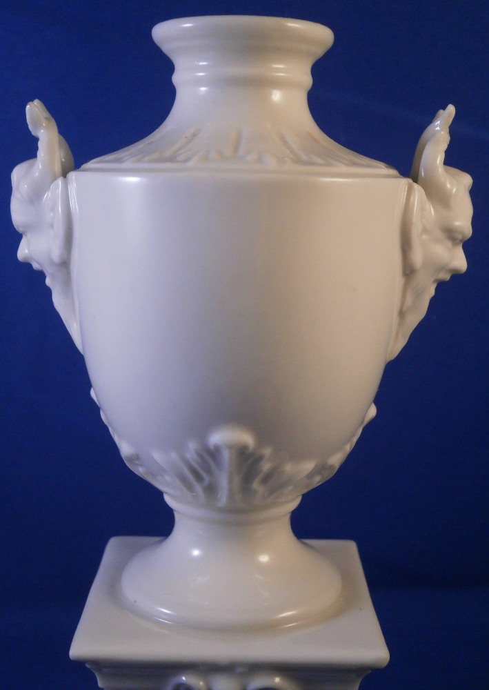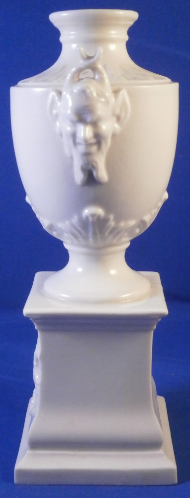 This is a superb satire urn / vase on a nice base made by Nymphenburg in the 20th century. It has the Bavarian shield in relief in the front of the pedestal base and an urn on top of that pedestal. It's all fired as one piece so does not come apart! The urn / vase part has devil heads aka satire masks as the handles on the sides and some nice relief decoration to it. Looks great and it's a piece that is quite popular among collectors! The vase is in perfect condition and is marked on the back of the base edge with the impressed shield mark as well as underneath with the impressed shield mark, the numbers 734 / 1a over 6 as well as the green shield mark with the crown on top and the word Nymphenburg underneath as shown. The entire piece is 6 inches tall, 2.875 inches wide and 2.125 inches deep. I have a matching second piece on the site if anyone is interested in a rare pair of these fun vases! Please email me for more information or other pictures.
