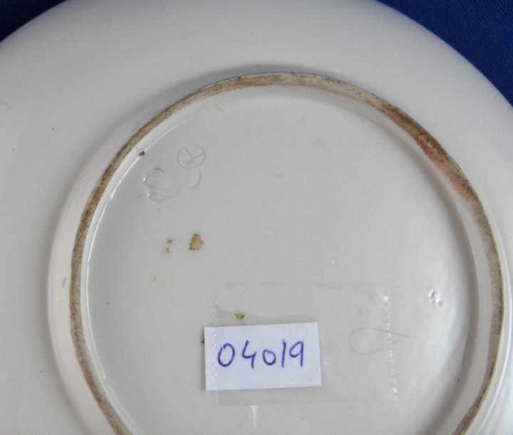 This is a saucer with a handpainted scene of a ruin or a castle made by Nymphenburg in the 18th century. It is marked with the impressed shield mark as well as a plus sign in a circle with a tail on it. The saucer is in perfect condition with some wear to the gold trim on the rim and a tiny bit in one spot of the castle and it is 5.375 inches in diameter. Please email me for more information or other pictures.