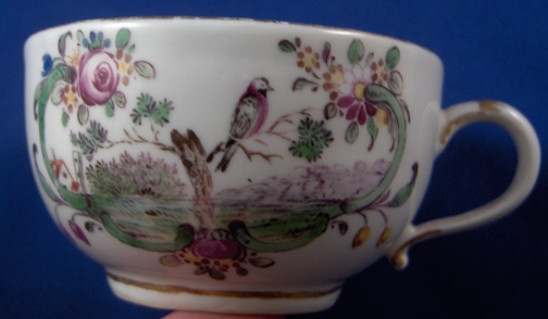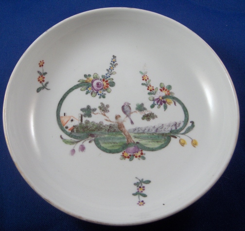 This is a cup & saucer made by Nymphenburg in the 18th century. Both pieces are handpainted with a very typical scene for Nymphenburg with a cartouche of a landscape scene with a house in it, a central tree with a bird in it and all that surrounded by a nice green trim with flowers here and there. Gold trim to the rims and the handle. Both pieces have the impressed shield mark as well as an incised mark underneath. They are in great condition with a little wear to two spots of the saucer scene that are minor and the gold trim is worn on the edges. The cup is 1.625 inches tall and 2.875 inches in diameter. The saucer is 1.125 inches tall and 5.25 inches in diameter. Please email me for more information or other pictures.