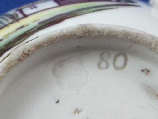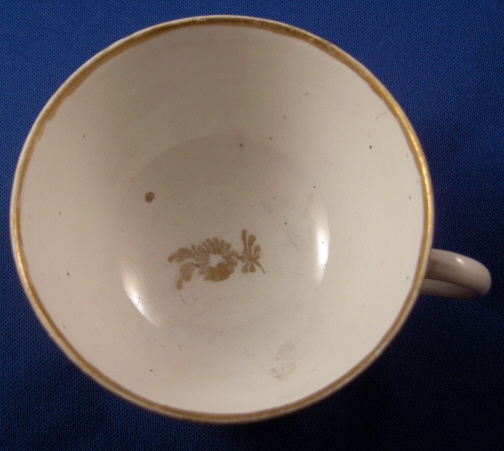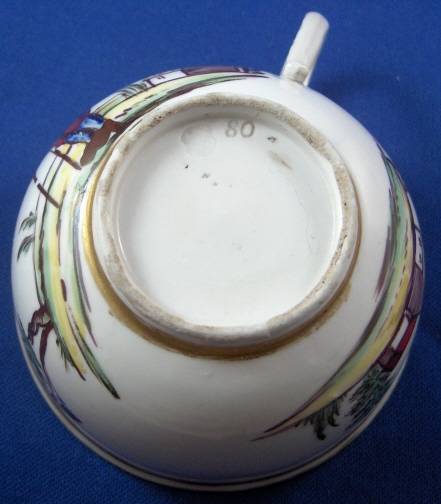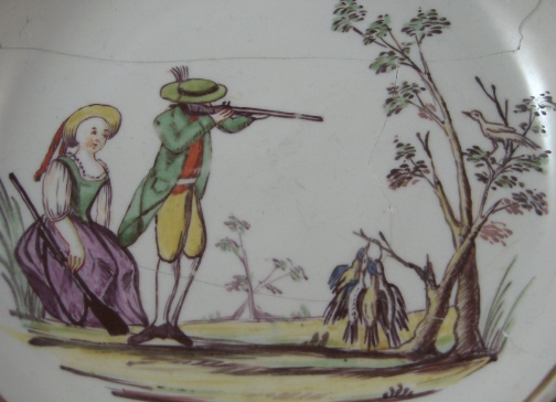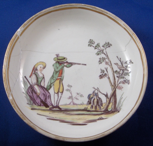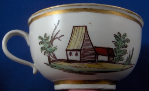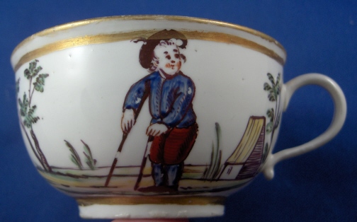 This is another cup & saucer made by Nymphenburg in the 18th century. The saucer has a handpainted scene with a hunter shooting a bird, a lady hunter sitting with her rifle and a few killed birds hanging of a tree on it. The cup has a man with crutches on it in a landscape with a house and a tree and the other side has a house in a landscape on it. Both piece have gold trim to the rims and the cup has a gold flower to the inside bottom. Both the cup and the saucer have the impressed shield mark underneath with the cup having a number 80 impressed and the saucer an X. The cup is in great condition with a little wear to the gilding and some paint flaking on the man with crutches. Nothing major. Sadly the saucer has been in pieces and reglued with small slivers missing. It displays pretty well and is still worth owning and / or restoring for sure. The cup is 1.75 inches tall and 3.25 inches in diameter. The saucer is 1.125 inches tall and 5.125 inches in diameter. Please email me for more information or other pictures.