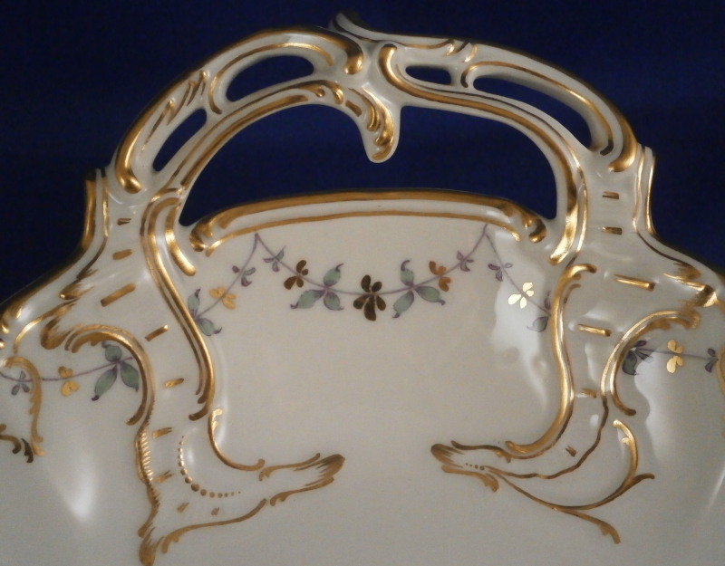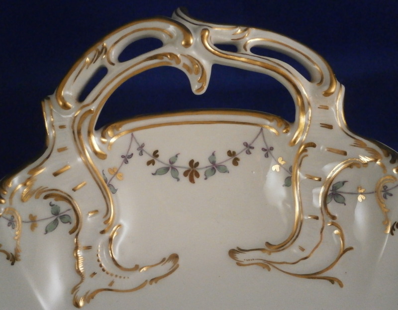This is a really nice large serving dish made by Nymphenburg in the mid 20th century. It has a handle to each side and is shaped like an oval bowl. The piece has a nice shape to it with a superb hand painted scene in the center in mostly green tones surrounded by a floral and leaf design with gilding to either side. The side of the dish has a green and gold leaf garland going around and the reticulated handles have some nice gilding to them as well. Really a stunningly beautiful piece based on an 18th century original. The piece is 2.75 inches tall, 12.25 inches wide and 9 inchesdeep. Marked with the green shield mark with Nymphenburg underneath, impressed numbers 3 and letter h plus the impressed shield mark as well. The dish is in perfect condition and comes with its original box which is still in nice shape as well. Please email me for more information or other pictures.
