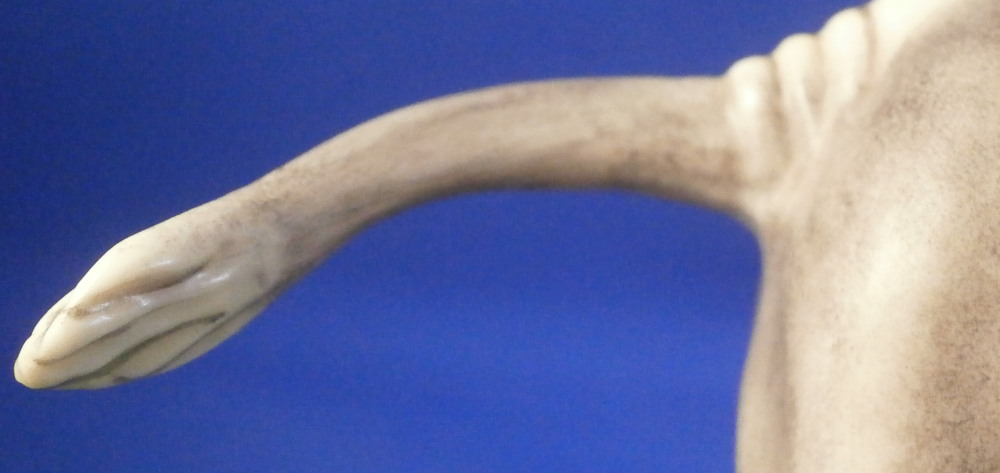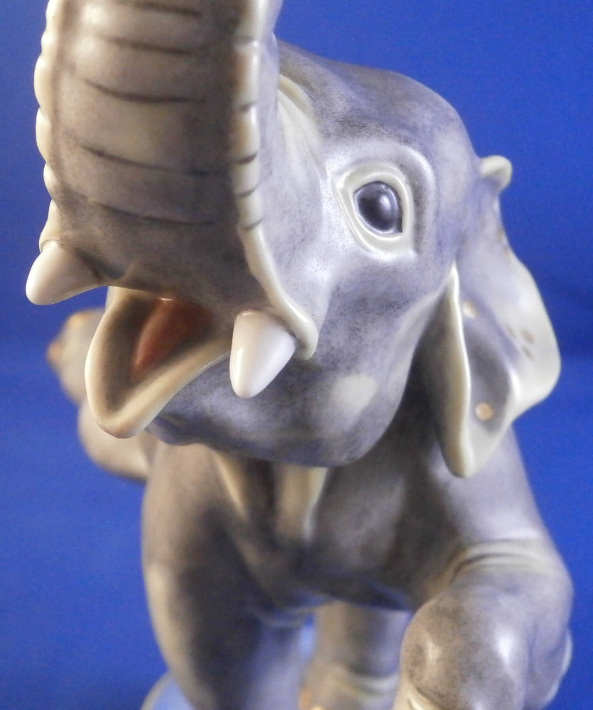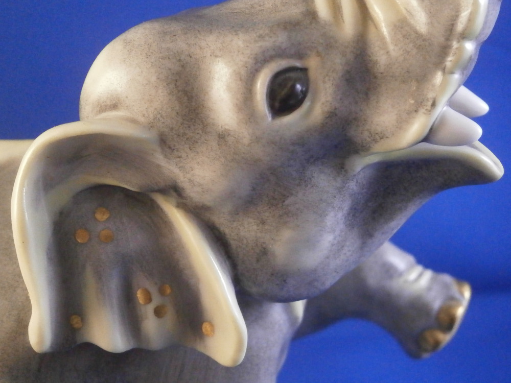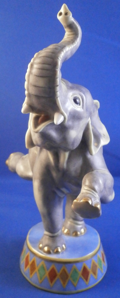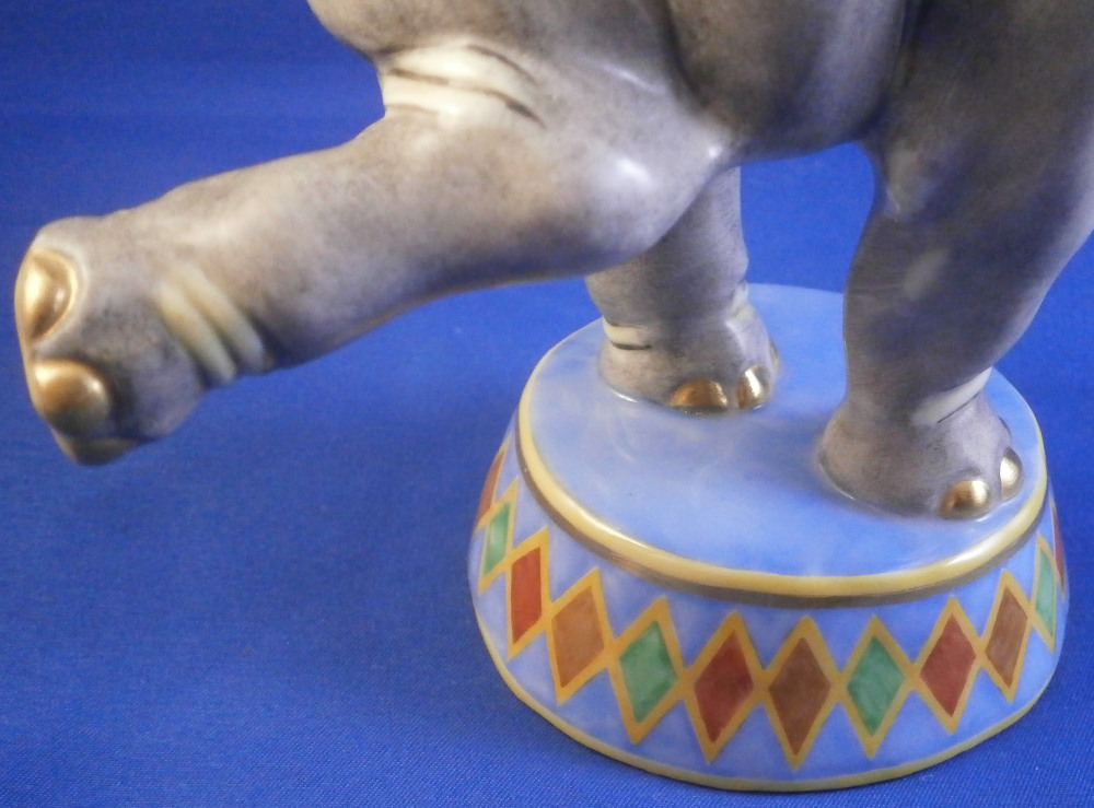 This is a really fun figurine of an elephant on top of a stand performing a circus routine made by Nymphenburg during the mid 20th century. Something that rightfully does not happen anymore and our kids already have no idea what this is. Still a memory that many of us slightly older folks have from when we were young. The figure was designed by the famous Terletzki-Scherf who also designed many other circus animals for this series. The elephant and base are really nicely modeled and the base is reminiscent of the circus feeling. The piece is 7.75 inches tall, 6.125 inches long and 3.125 inches deep so a nice size. The figure is marked with the impressed shield mark underneath the base as well as the impressed model number 657 and a number 6. There is also the green shield mark with the word Nymphenburg under it. Another impressed shield mark to the back of the base under one of the green shapes and hard to see. The piece is in perfect condition which is nice since the tail is often damaged on these. Please email me for more information or other pictures.