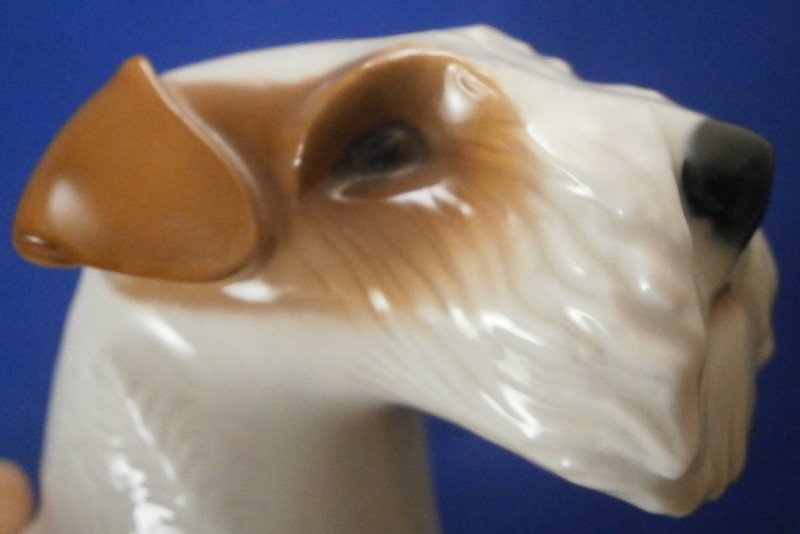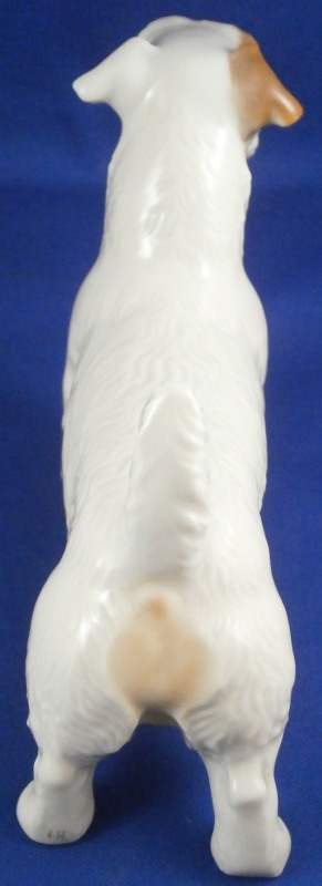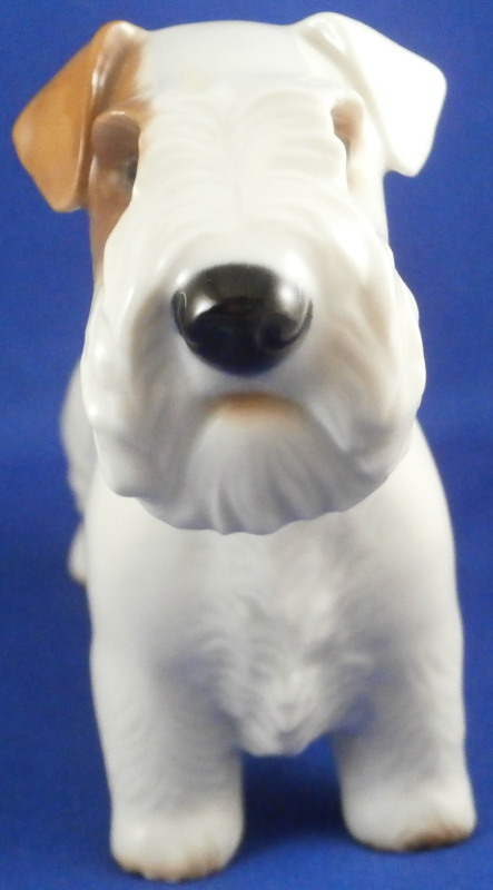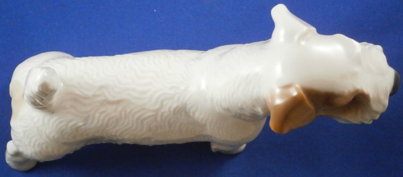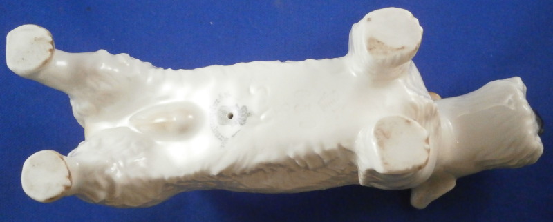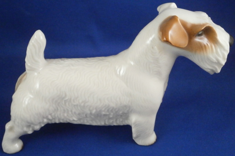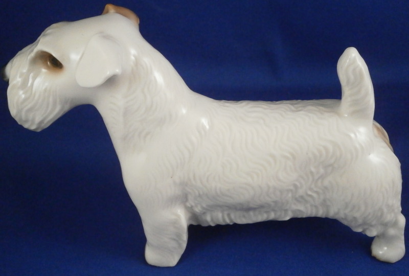 This is a figurine of a Sealyham dog made by Nymphenburg during the original period in the early 20th century. The figure is superbly modeled and hand painted. Not a model one sees often especially from this period! The dog is 4 inches tall, 2 inches wide and 6.25 inches long. It is marked with the impressed shield mark underneath with the number 659 over 8 incised underneath it. Also marked with the green shield mark with the word Nymphenburg and the artist initials KS for Konrad Schmid . Also signed by the artist J. H. that painted him on his left back leg as shown. He is in perfect condition. Please email me for more information or other pictures.
