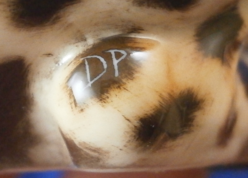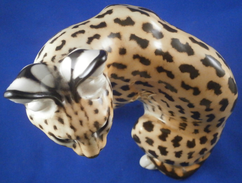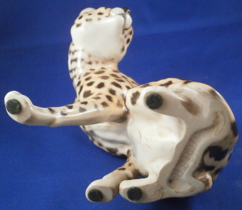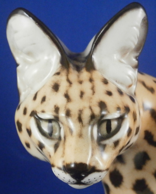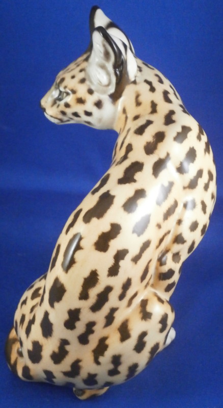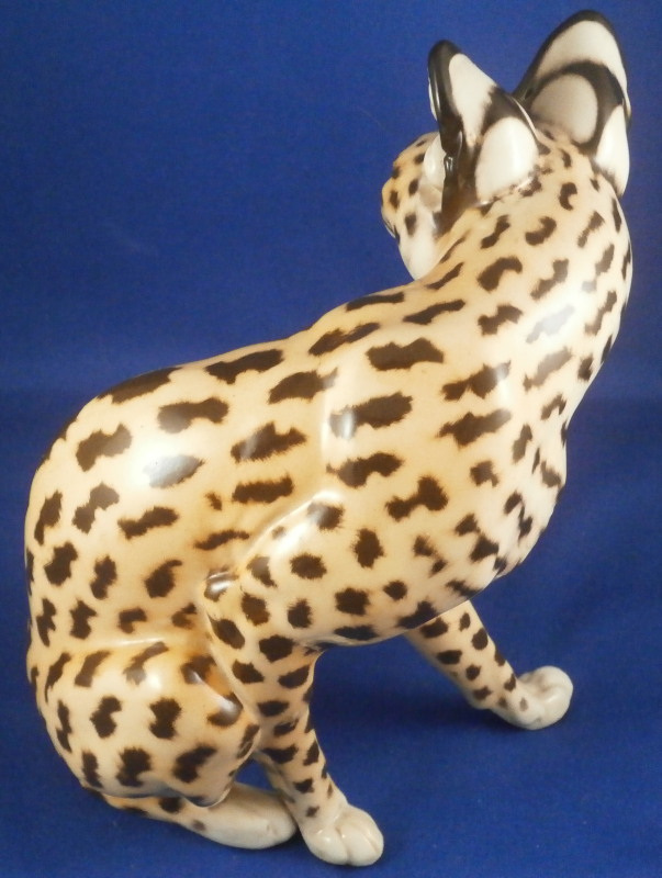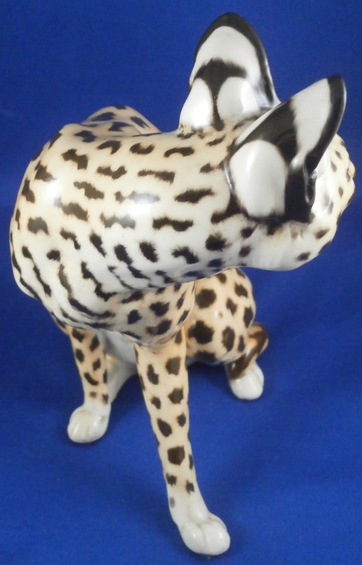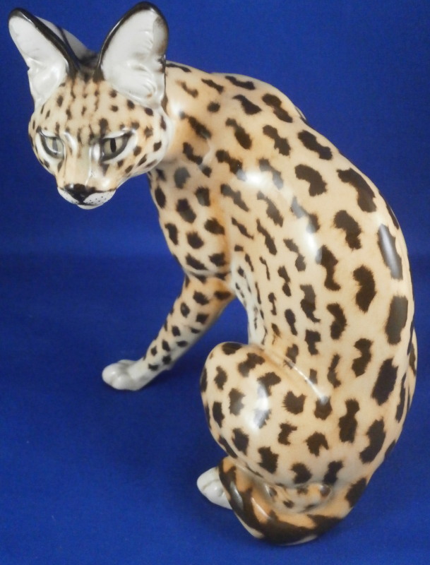 This is a superb figurine of a Serval cat made by Nymphenburg in the early 20th century from the original period. It was designed by Kaerner and is one superbly modeled and painted animal figure with lots of detail to it. The cat is 6.25 inches tall, 4.75 inches long and 3.625 inches deep. The figurine is marked with the impressed shield mark underneath the back right paw but it is faint and hard to see. It does have the Kaerner name impressed as shown and the artist initials DP in the back by the back part of his right leg. The piece is in perfect condition and truly a stunning addition to the collection! Please email me for more information or other pictures.