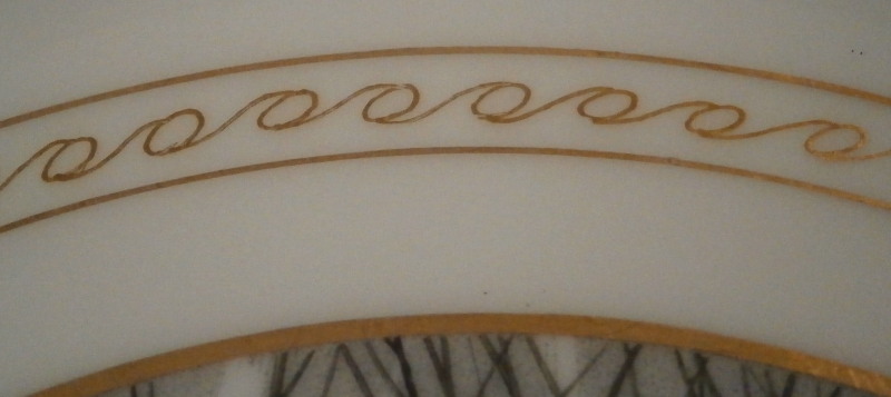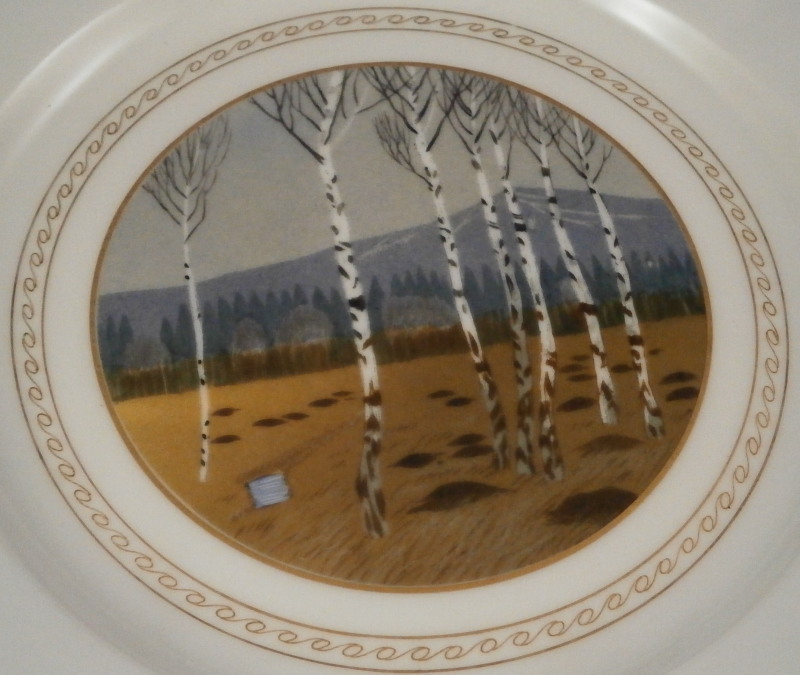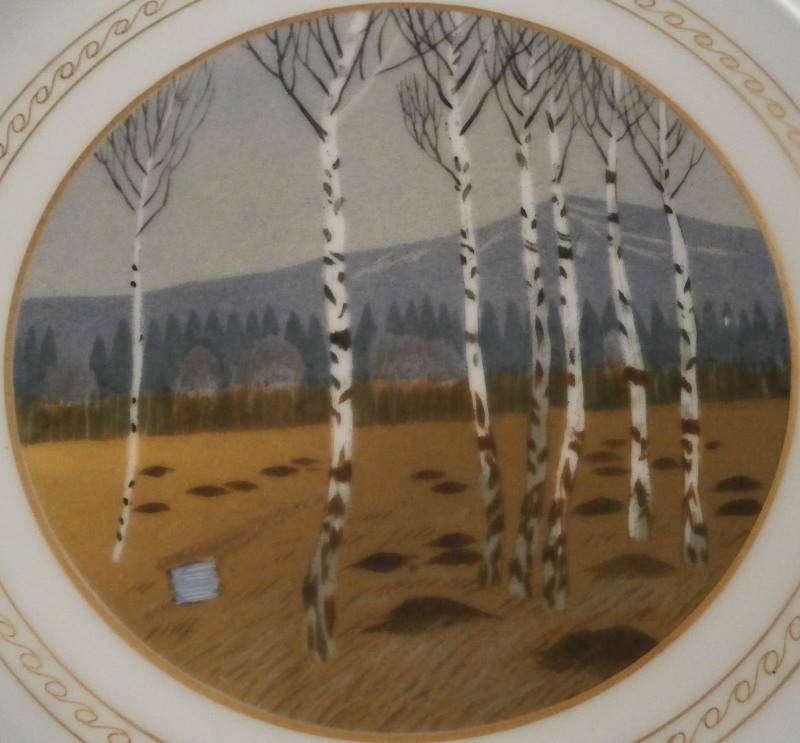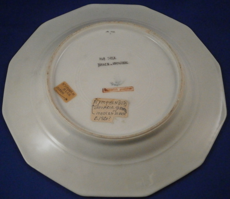 This is a great dessert plate made by Nymphenburg in the early 20th century during the original period in about 1906-1908. Hard to find the pieces from this time period! The plate blank design itself is from the Pearl service with those little "pearls" along the edge - it is an old design dating back to the 18th century. The central painting however was first done by Rudolf Sieck around 1906/1908. It is titled Birch Trees in Early Spring. A very Art Nouveau / Jugendstil feel design of some birch trees in a field with pine trees and mountains in the background. There is a nice gold trim along the edge of the well. The plate is 1.125 inches tall and 8.5 inches in diameter. It is well marked with the printed green shield mark with the word Nymphenburg underneath, the impressed shield mark, as well as RuD. SIECK BIRKEN im VORFRUEHLING and the red mark Gesetzlich geschutzt (copyright). Also some black letters and numbers and old dealer stickers. The piece is in perfect condition with some very minor use marks but as good as they come from this original period over 100 years ago. Please email me for more information or other pictures.