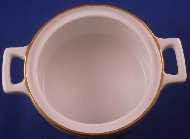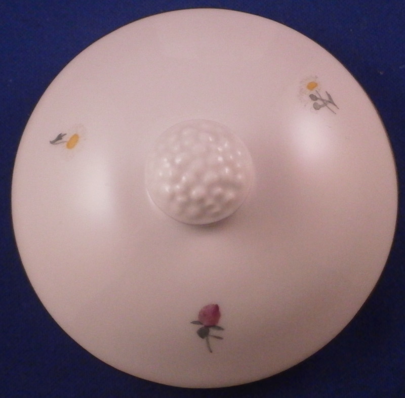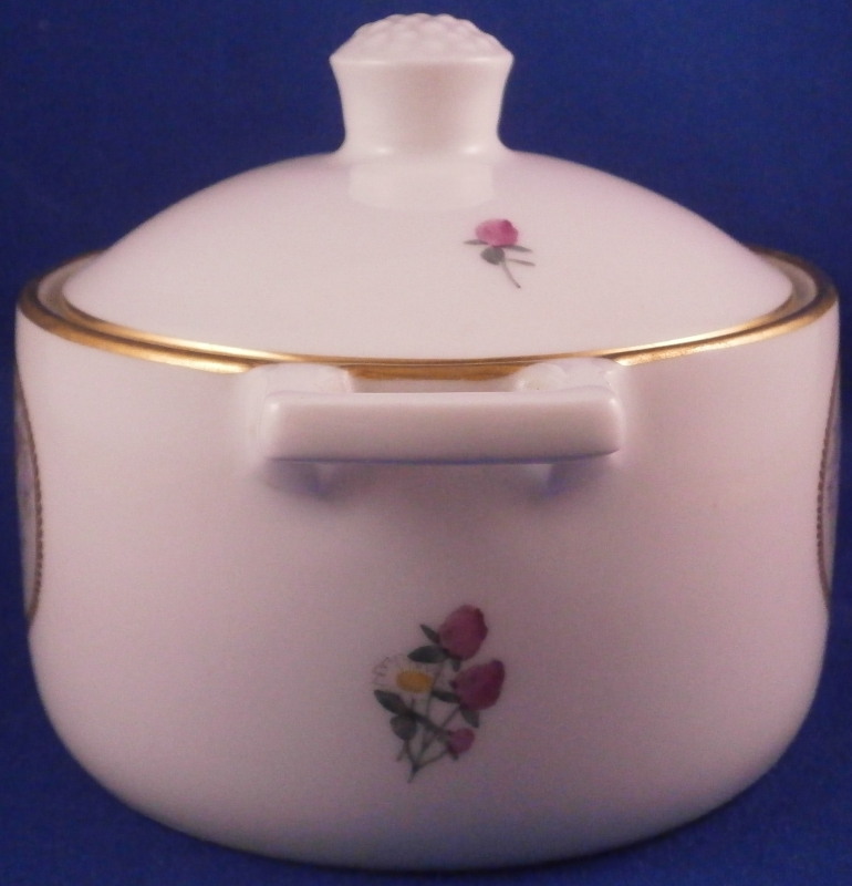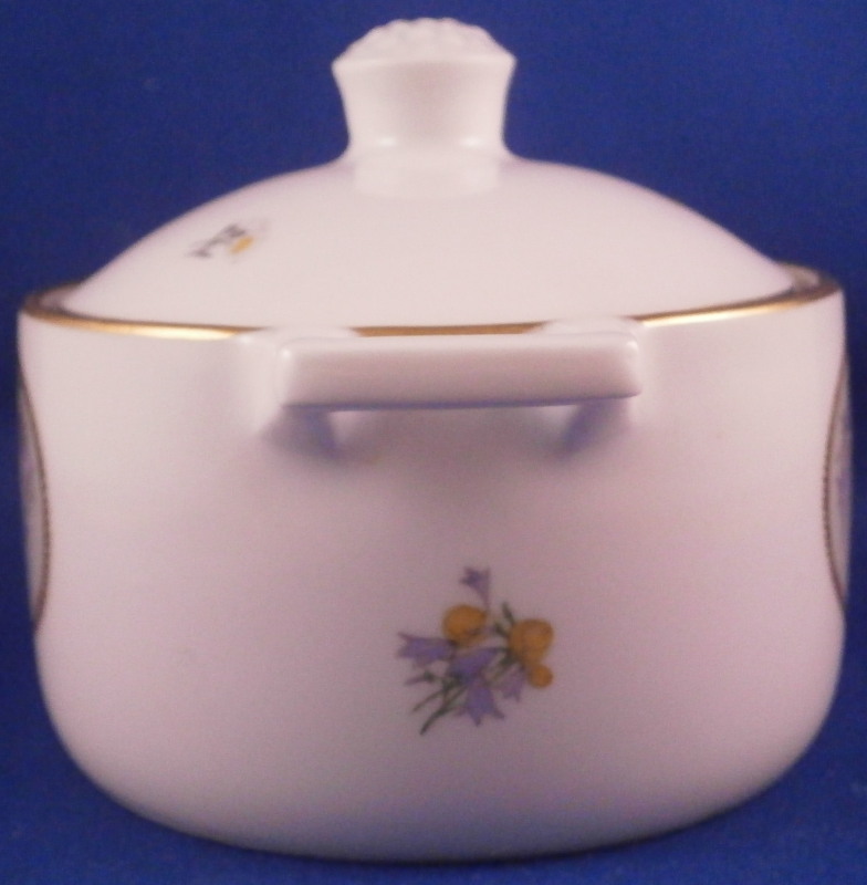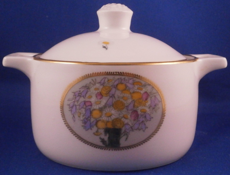 This is a very hard to find Art Nouveau sugar dish with its lid made by Nymphenburg in the early 20th century. The form was designed by Adelbert Niemeyer around 1905 and is model number 108. This became one of the design classics of the Germany Jugendstil and Nymphenburg itself off course. The decoration was designed by the famous Rudolf Sieck around the same time. The original designed pieces would have been all hand painted but after Sieck left due to a fight with Niemeyer around 1908 the outlines were stencilled and then colored in as is the case here. The sugar dish has bouquet of flowers on grey ground to the front and back side with a single flower under each handle. The scene is surrounded by a gold trim with a simple gold trim to the top edge. The lid edge also has a gold trim to it, three single small flowers and a funny finial that looks like a pot filled with pebbles - not sure what that is meant to be!? A rectangular handle to each side. A top quality piece that is very elegant! The piece is is marked underneath with a partial impressed shield mark and number and some letters and numbers in black as shown. The piece is in perfect condition. It is 3.5 inches tall, 5.25 inches from handle to handle and just under 4 inches in diameter. Please email me for more information or other pictures.