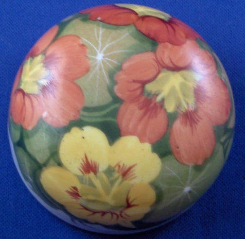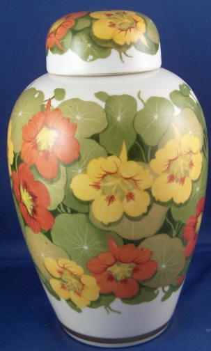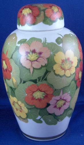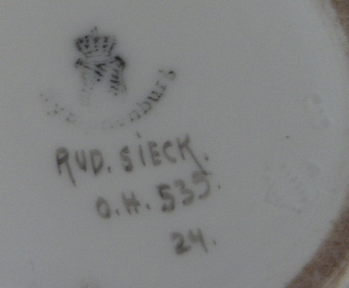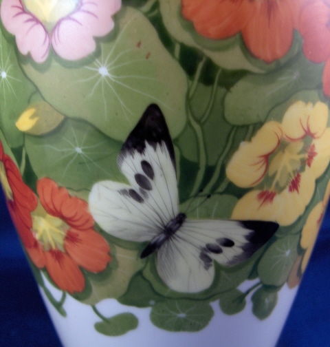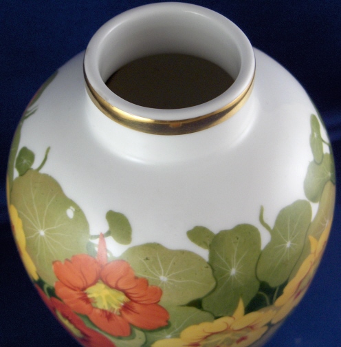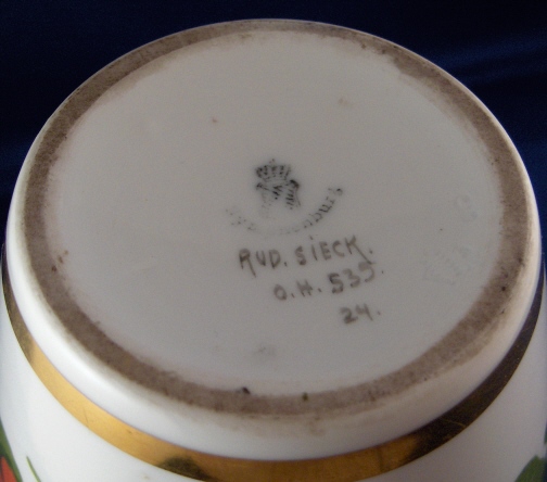This is a lidded vase made by Nymphenburg in the 20th century. It was painted by the famous Rudolf Sieck with some superb flowers (Indian cress) as well as one buttefrfly all around. Nice gold trim to top and bottom as well. These lidded vases are very collectable and they come in different designs and sizes. The vase is marked underneath with the impressed shield mark, an impressed number 23, the green shield mark with Nymphenburg underneath, the artist name Rud. Sieck, O.H. 535 and a black 24. The piece is in perfect condition which is not that common especially with the lid which is often missing. The vase is 7 inches tall and 4 inches in diameter. Please email me for more information or other pictures.