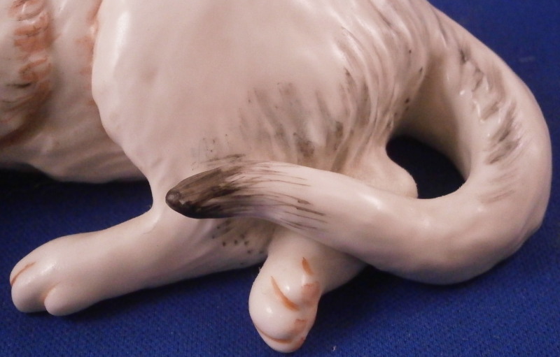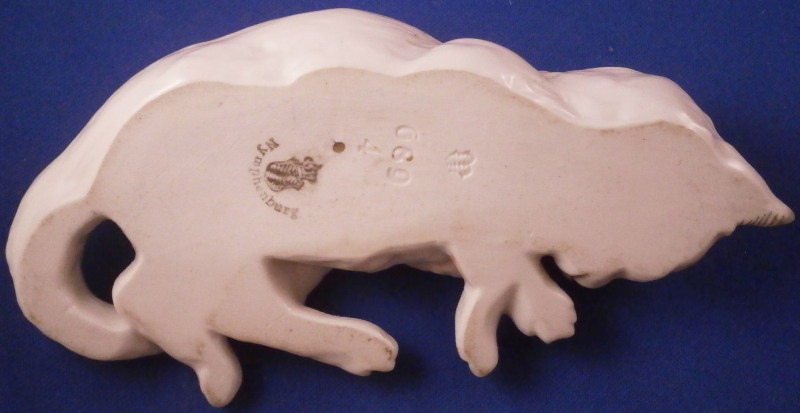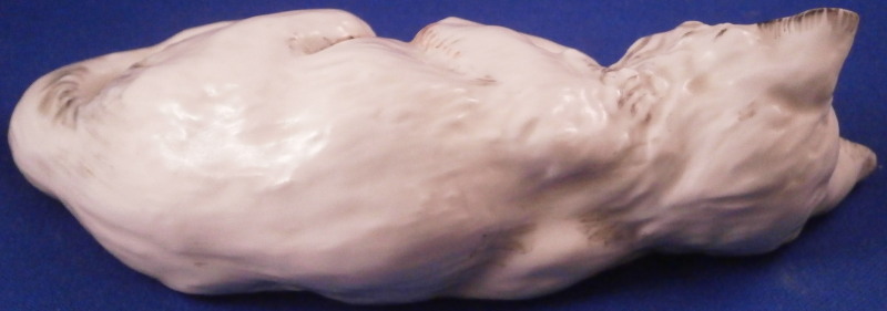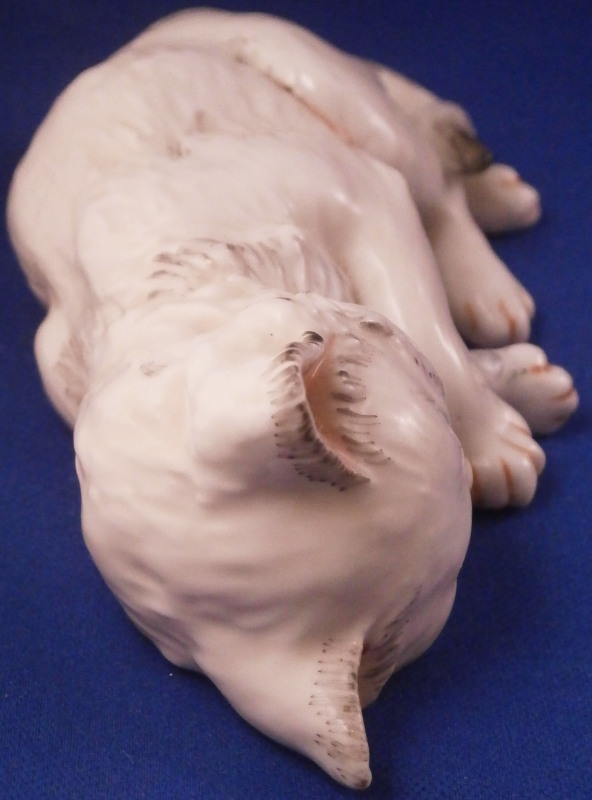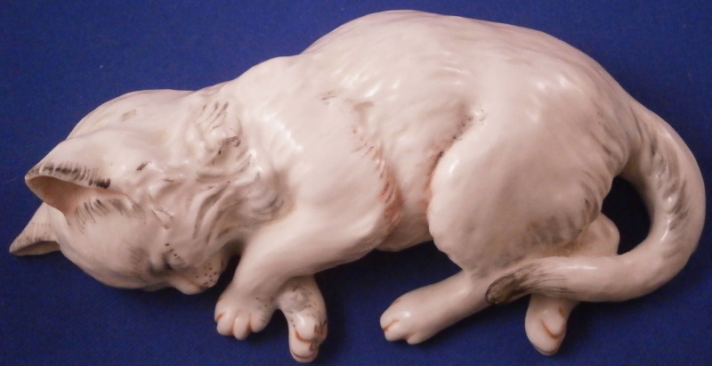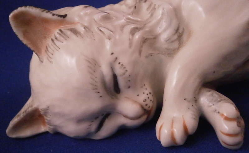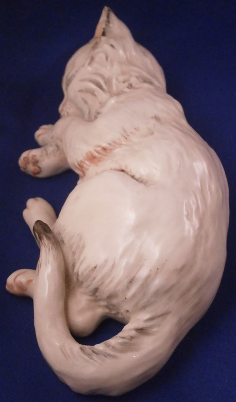 This is a superb figurine of a cat taking a nap after Pierre Jules Mêne made by Nymphenburg around the mid 20th century. This sleeping cat I imagine is the Mama cat that goes along with the tiny playful kitten I also own. Reminds me of when the kids where small and we had a rought night with them. All tired in the morning but the kids were always ready to go. Do not miss that :) The figure is very well modelled and painted - one of the rarer versions around. The kitty is 1.5 inches tall, 5.75 inches long and 2.875 inches deep. It is marked with the impressed shield mark underneath with the model number 689 with a 4 under it and the green shield mark with the word Nymphenburg underneath. The figure is in perfect condition same as the day it left the factory :) Please email me for more information or other pictures.