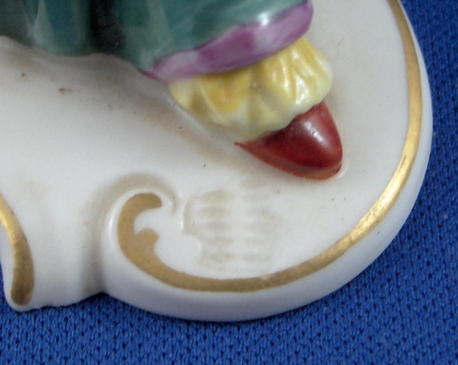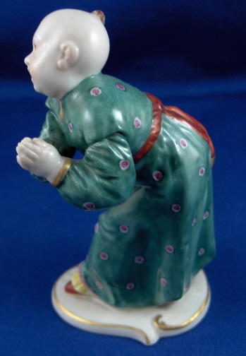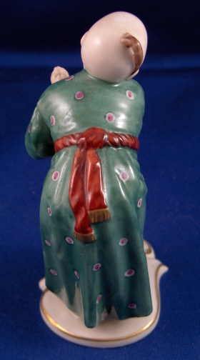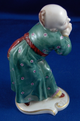 This is a figure of a monk made by Nymphenburg in the early 20th century. Nicely handpainted with a green robe with purple and white spots. Very elegant as is the norm with Nymphenburg pieces. He is 4 inches tall, 2 inches wide and 2.25 inches deep. Marked with the impressed shield mark underneath and impressed numbers 67 over 3. Also another impressed shield mark to the top of the base in the front. He is in great condition with a teeny flat chip to one finger. Please email me for more information or other pictures.