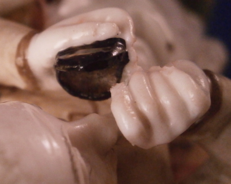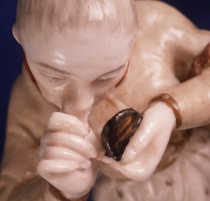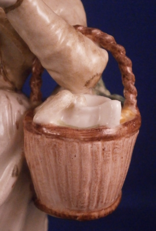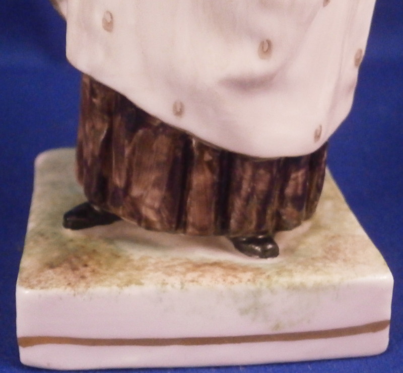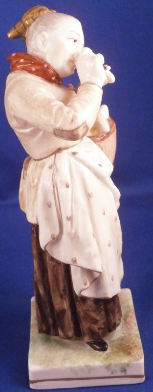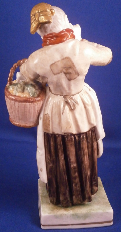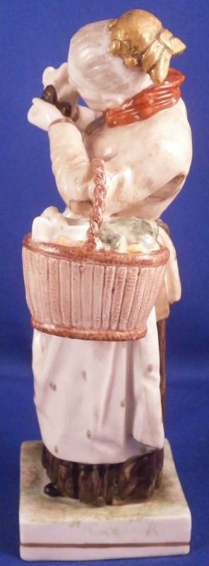 This is a figure of a lady taking some snuff out of her snuff box made by Nymphenburg in the late 19th or early 20th century. She is called Ratschkatl in the Nymphenburg book. The figure is dressed in clothes in mostly brown tones with some patches to it. Taking the snuff while holding a basket full of veggies (I think) under her left arm. A nice red scarf and gold hair decoration make this a very elegant piece. Typical base for this period of this series of figures. She is marked with the impressed shield mark as well as the incised numbers 213 - a nice early version of this model . The piece is 6 inches tall, 3 inches wide and 2 inches deep. The figurine is in perfect condition. Please email me for more information or other pictures.