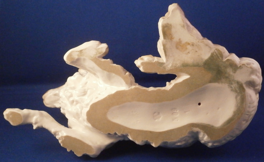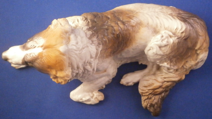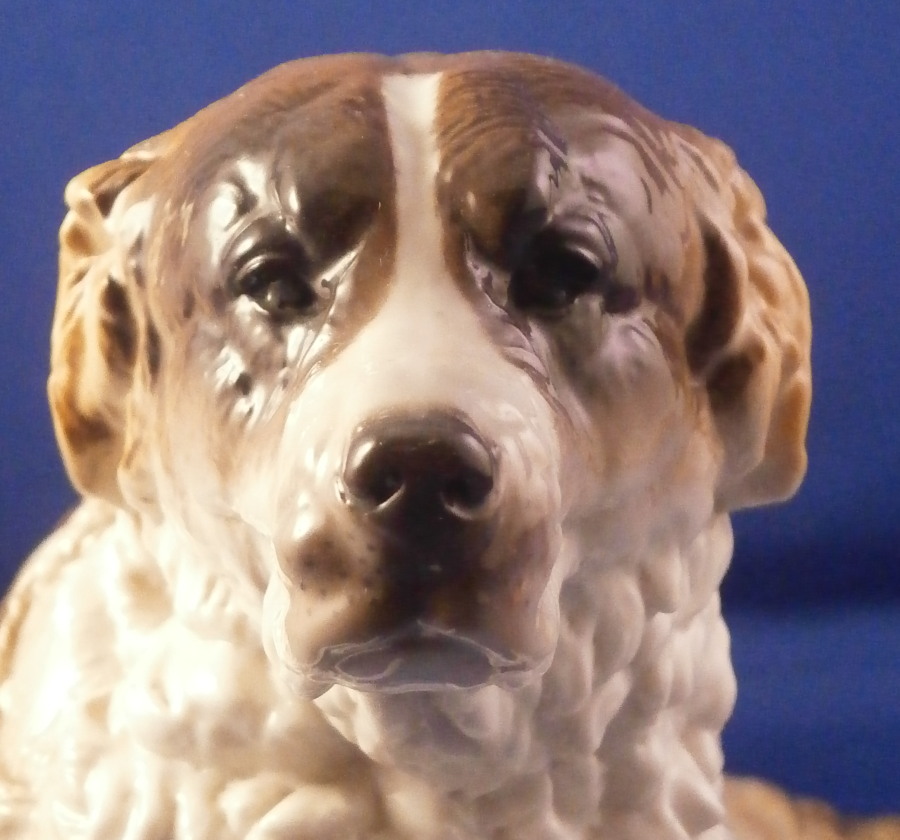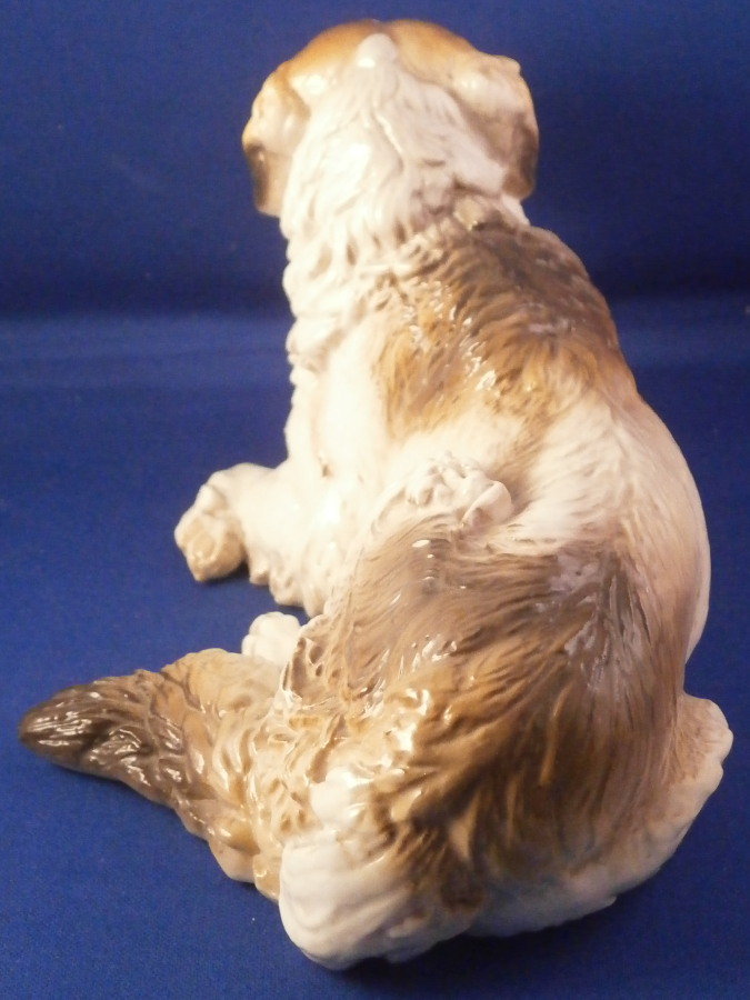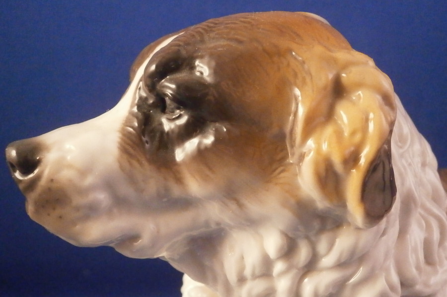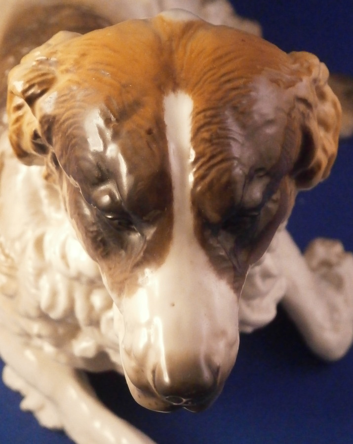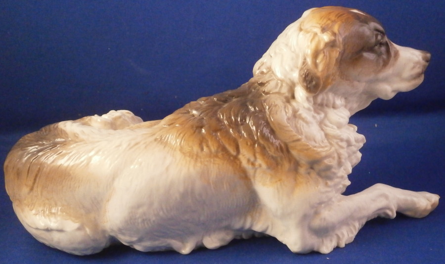This is a hard to find dog figurine made by Nymphenburg during the early 20th century. It is of a St. Bernard (I think). The figure is nicely modeled and is painted to perfection as one expects from this maker. Lots of detail! I think they make the best animal figurines in the porcelain world. The figurine is about 3.875 inches tall, 4.5 inches deep and 8 inches long. The piece is marked with the impressed shield mark underneath with the impressed number 509 (the middle number is hard to read) and a number 1. The piece is in perfect condition and super cute! Please email me for more information or other pictures.