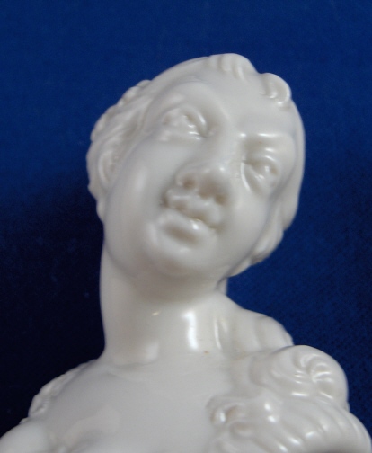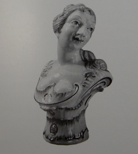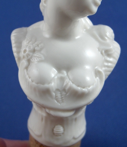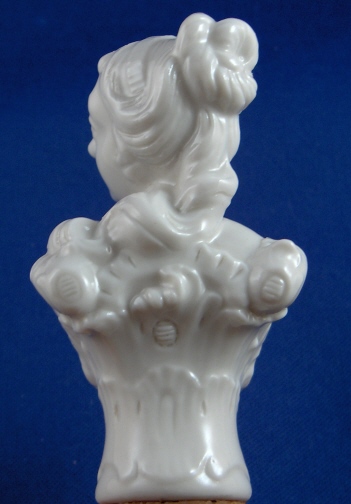 This is a rare figural bottle stopper made by Nymphenburg around 1900. Originally designed by Bustelli which can be seen easily. It is in the shape of a bust of a lady and in excellent condition. Marked underneath her bussom with the impressed shield mark. Probably more marks where the cork is but it is on there securely and I don't want to mess with it. The lady part is 3 inches tall, 1.75 inches wide and 1.5 inches deep. The cork part is an additional 1.5 inches long and it is 0.875 inches in diameter at the top. Please email me for more information or other pictures.