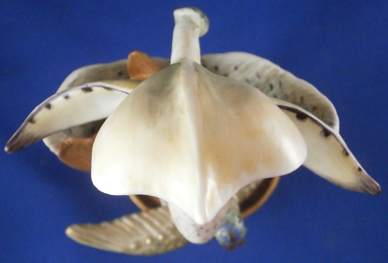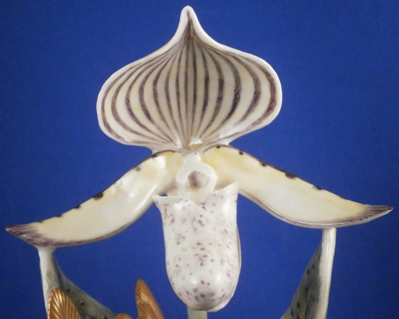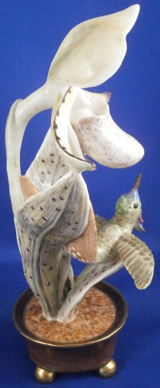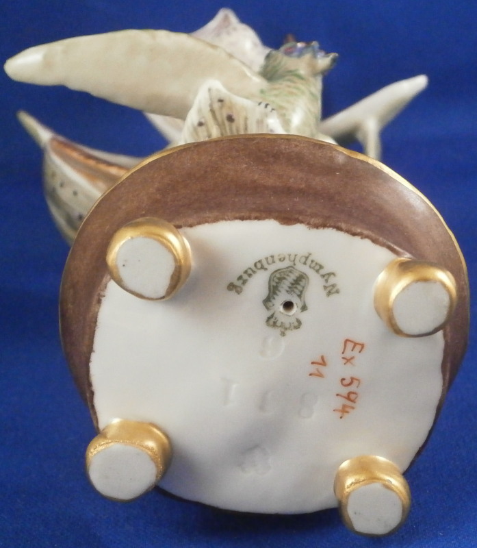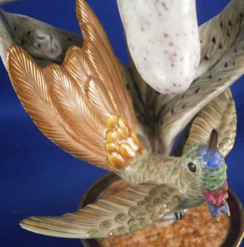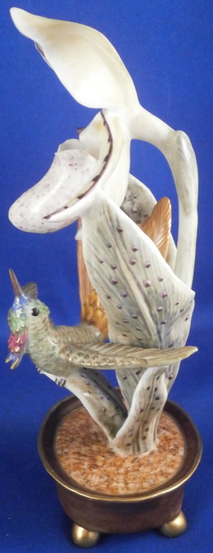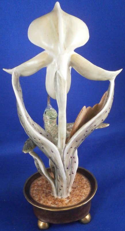 This is a superb figurine of a hummingbird with a striped orchid flower made by Nymphenburg around the mid 20th century. An amazing piece and one of the hardest to find in perfect condition due to the obviously fragile nature of this figure plus they are rare to begin with! An extremely well modeled piece and painted to perfection that just looks fun in your display case! There are multiple versions of these figurines with this one having the striped orchig grwoing out of the flower pot with four gilded feet underneath and the hummingbird swooping in from underneath. Truly a stunning piece! The figurine is in perfect condition. It is marked underneath with the impressed shield mark, the numbers 861 over 6, a red Ex. 594 over 11 and the green shield mark under a crown with Nymphenburg underneath it as shown. The piece is 7 inches tall, 3.75 inches wide and 2.75 inches deep. Please email me for more information or other pictures.