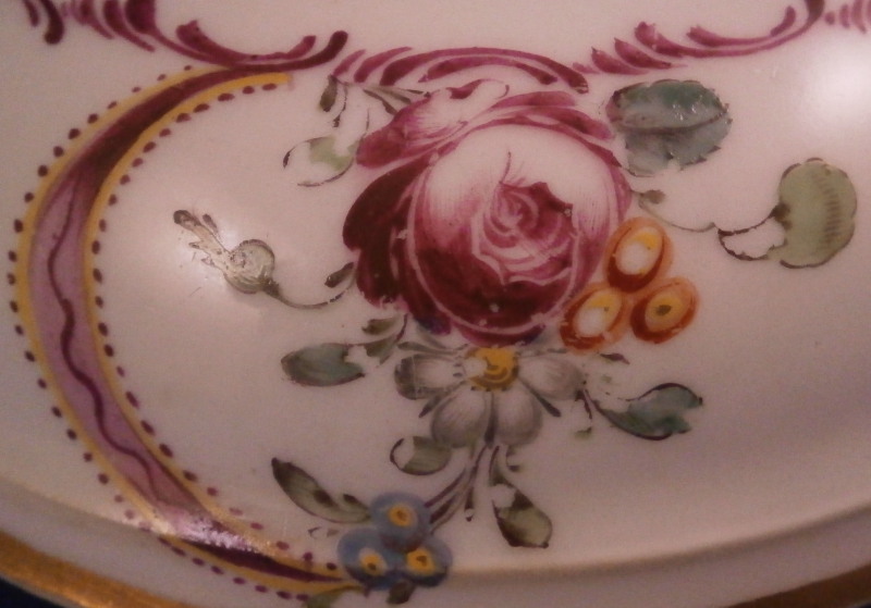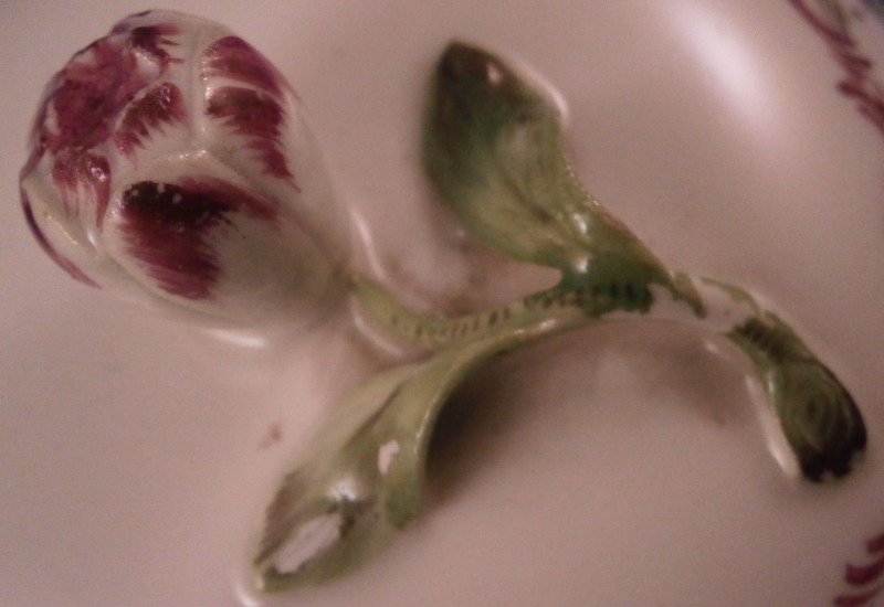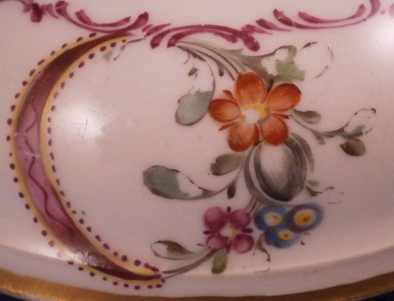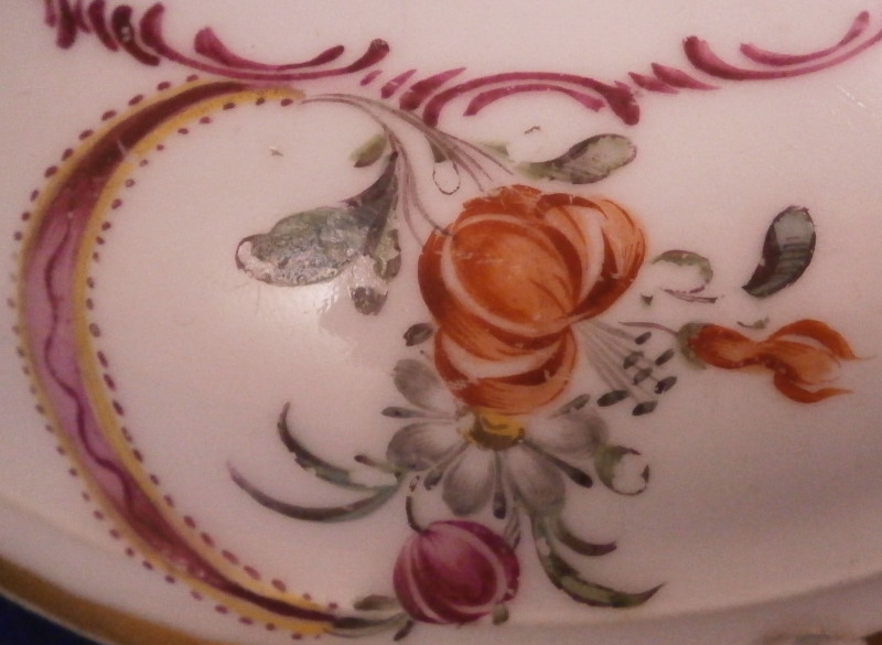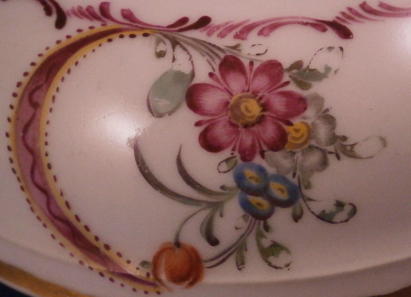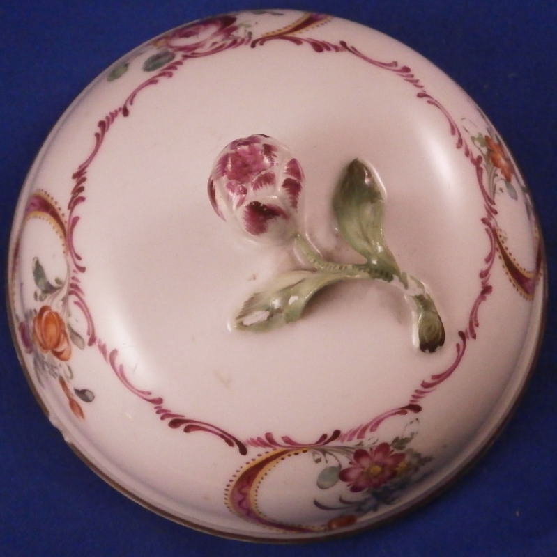 This is a really nice lid I believe was part of a sugar dish made by Nymphenburg in the 18th century. It is hand painted with a nice puece design as well as four small floral arrangements and a nice flower finial with a simple gold trim along the edge. The lid is off course not marked but the colors and style are typical of this maker as is the flaking of the green paint. The lid is in decent condition with two chips along the edge and the already mentioned flaking of the green paint to the greenery of the finial and floral arrangements as shown. The lid is 2.25 inches tall with an outer diameter of 4.25 inches and an inner diameter that would fit inside the main body of the sugar dish of 3.75 inches. Please email me for more information or other pictures.