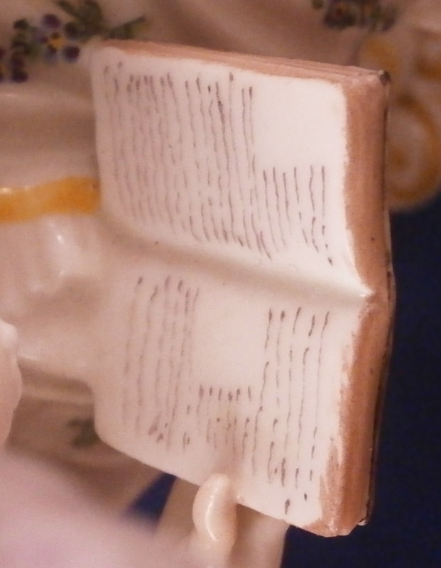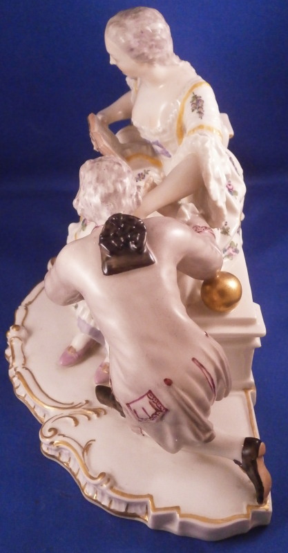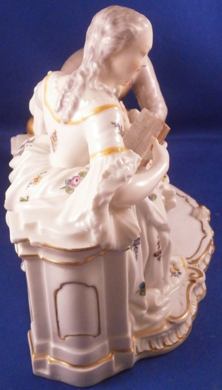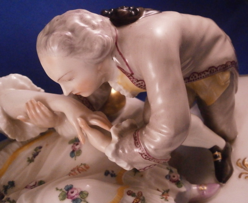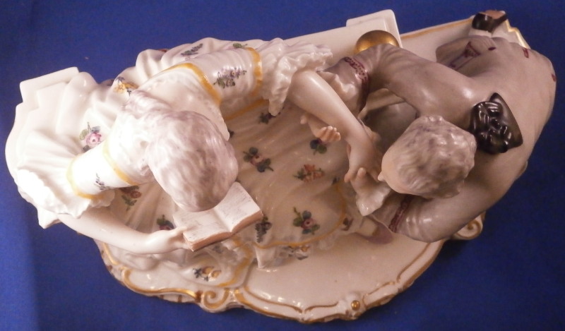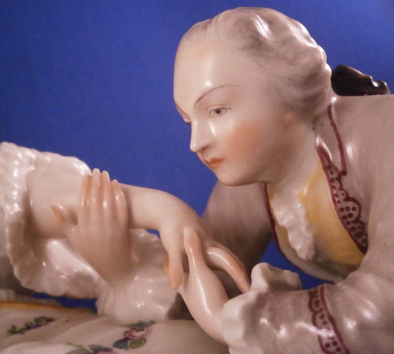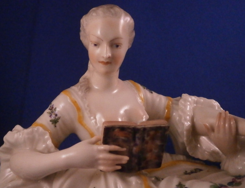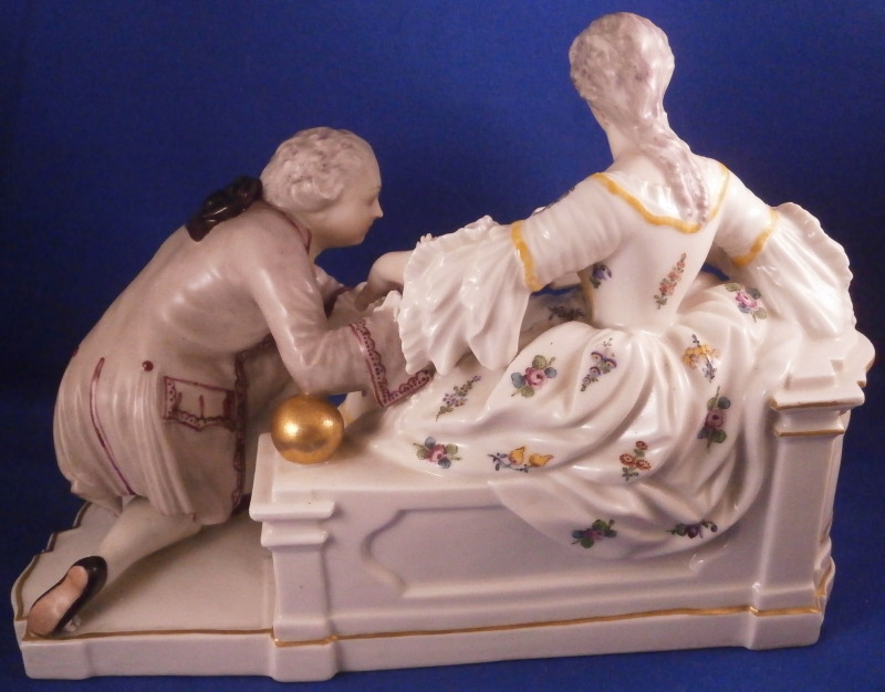 This is a nice figurine made by Nymphenburg in the 20th century based on an 18th century model. The figure is of a lady trying to read her book in peace and quiet while her suitor is trying to get her attention by kissing her hand. We've all been there guys so don't try to deny it :) The piece is superbly modeled with lots of detail and nicely hand painted . The figurine is about 6.5 inches tall, 9.25 inches wide and 5 inches deep. The piece is marked underneath with the impressed shield mark and the number 20 and 5 impressed as well as the green shield mark with the name Nymphenburg under it. The piece is in superb condition. A stary paint spot on her index finger and his sleeve from when it was made. Please email me for more information or other pictures.